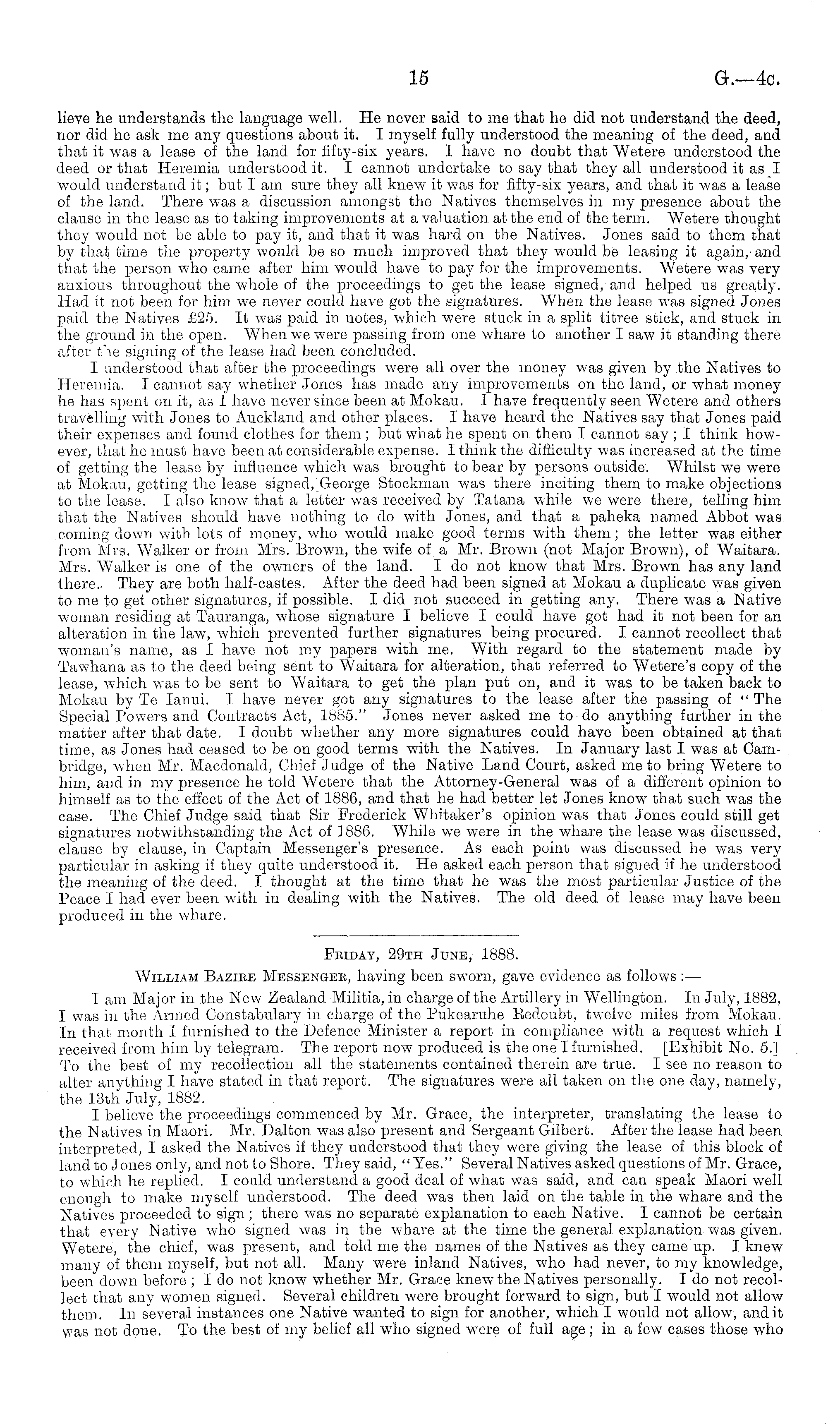Friday, 29th June, 1888. William Baziee Messengeb, having been sworn, gave evidence as follows : — lam Major in the New Zealand Militia, in charge of the Artillery in Wellington. In July, 1882, I was in the Armed Constabulary in charge of the Pukoaruhe Redoubt, twelve miles from Mokau. In that month I furnished to the Defence Minister a report in compliance with a request which I received from him by telegram. The report now produced is the one I furnished. [Exhibit No. 5.] To the best of my recollection all the statements contained therein are true. I see no reason to alter anything I have stated in that report. The signatures were all taken on the one day, namely, the 13th July, 1882. I believe the proceedings commenced by Mr. Grace, the interpreter, translating the lease to the Natives in Maori. Mr. Dalton was also present and Sergeant Gilbert. After the lease had been interpreted, I asked the Natives if they understood that they were giving the lease of this block of land to Jones only, and not to Shore. They said, "Yes." Several Natives asked questions of Mr. Grace, to which he replied. I could understand a good deal of what was said, and can speak Maori well enough to make myself understood. The deed was then laid on the table in the whare and the Natives proceeded to sign; there was no separate explanation to each Native. I cannot be certain that every Native who signed was in the whare at the time the general explanation was given. Wetere, the chief, was present, and told me the names of the Natives as they came up. I knew many of them myself, but not all. Many were inland Natives, who had never, to my knowledge, been'down before ; Ido not know whether Mr. Grace knew the Natives personally. Ido not recollect that any women signed. Several children were brought forward to sign, but I would not allow them. In several instances one Native wanted to sign for another, which I would not allow, and it •was not done. To the best of my belief all who signed were of full age; in a few cases those who