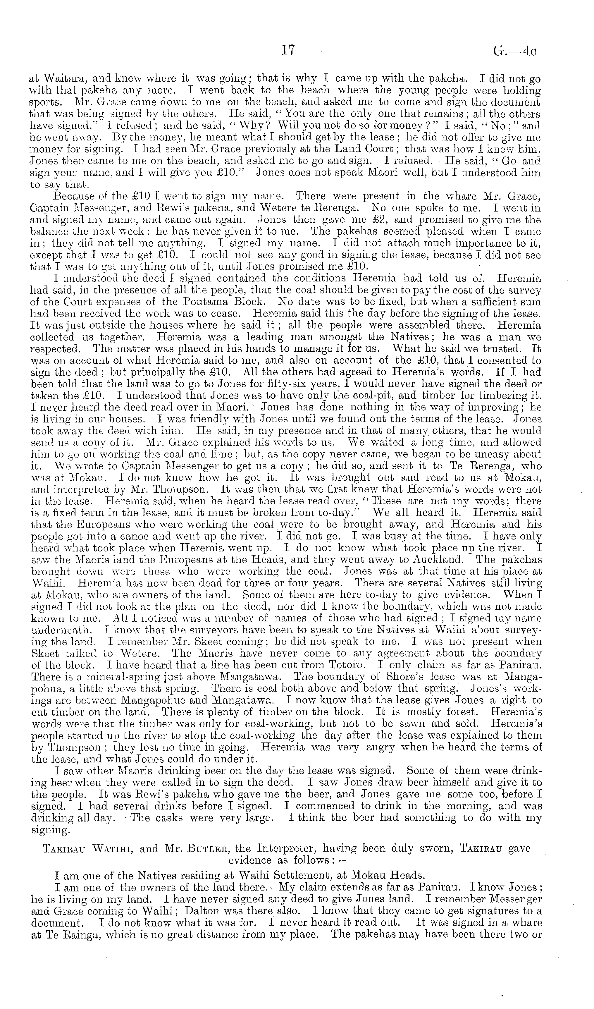 at Waitara, and knew where it was going; that is why I came up with the pakeha. I did not go with that pakeha any more. I went back to the beach where the young people were holding sports. Mr. Grace came down to me on the beach, and asked me to come and sign the document that was being signed by the others. He said, " You are the only one that remains ; all the others have signed." I refused ; and he said, " Why ? Will you not do so for money ? " I said, "No ; " and he went away. By the money, he meant what I should get by the lease ; he did not offer to give me money for signing. I had seen Mr. Grace previously at the Land Court; that was how I knew him. Jones then came to me on the beach, and asked me to go and sign. I refused. He said, "Go and sign your name, and I will give you £10." Jones does not speak Maori well, but I understood him to say that. Because of the £10 I went to sign my name. There were present in the whare Mr. Grace, Captain Messenger, and Eewi's pakeha, and Wetere te Eerenga. No one spoke to me. I went in and signed my name, and came out again. Jones then gave me £2, and promised to give me the balance the next week :he has never given it to me. The pakehas seemed pleased when I came in ; they did not tell me anything. I signed my name. I did not attach much importance to it, except that I was to get £10. I could not see any good in signing the lease, because I did not see that I was to get anything out of it, until Jones promised me £10. I understood the deed I signed contained the conditions Heremia had told us of. Heremia had said, in the presence of all the people, that the coal should be given to pay the cost of the survey of the Court expenses of the Poutama Block. No date was to be fixed, but when a sufficient sum had been received the work was to cease. Heremia said this the day before the signing of the lease. It was just outside the houses where he said it; all the people were assembled there. Heremia collected us together. Heremia was a leading man amongst the Natives; he was a man we respected. The matter was placed in his hands to manage it for us. What he said we trusted. It was on account of what Heremia said to me, and also on account of the £10, that I consented to sign the deed ; but principally the £10. All the others had agreed to Heremia's words. If I had been told that the land was to go to Jones for fifty-six years, I would never have signed the deed or taken the £10. I understood that Jones was to have only the coal-pit, and timber for timbering it. I never laeard the deed read over in Maori. ' Jones has done nothing in the way of improving; he is living in our houses. I was friendly with Jones until we found out the terms of the lease. Jones took away the deed with him. He said, in my presence and in that of many others, that he would send us a copy of it. Mr. Grace explained his words to us. We waited a long time, and allowed him to go on working the coal and lime; but, as the copy never came, we began to be uneasy about it. We wrote to Captain Messenger to get us a copy; he did so, and sent it to Te Eerenga, who was at Mokau. Ido not know how r he got it. It was brought out and read to us at Mokau, and interpreted by Mr. Thompson. It was then that we first knew that Heromia's words were not in the lease. Heremia said, when he heard the lease read over, " These are not my words; there is a fixed term in the lease, and it must be broken from to-day." We all heard it. Heremia said that the Europeans who were working the coal were to be brought away, and Heremia and his people got into a canoe and went up the river. I did not go. I was busy at the time. I have only heard what took place when Heremia went up. I do not know what took place up the river. I saw the Maoris land the Europeans at the Heads, and they went away to Auckland. The pakehas brought down were those who were working the coal. Jones was at that time at his place at Waihi. Heremia has now been dead for three or four years. There are several Natives still living at Mokau, who are owners of the land. Some of them are here to-day to give evidence. When I signed I did not look at the plan on the deed, nor did I know the boundary, which was not made known to me. All I noticed was a number of names of those who had signed ; I signed my name underneath. I know that the surveyors have been to speak to the Natives at Waihi about surveying the land. I remember Mr. Skeet coming; he did not speak to me. I was not present when Skeet talked to Wetere. The Maoris have never come to any agreement about the boundary of the block. I have heard that a line has been cut from Totoro. 1 only claim as far as Panirau. There is a mineral-spring just above Mangatawa. The boundary of Shore's lease was at Mangapohua, a little above that spring. There is coal both above aud below that spring. Jones's workings are between Mangapohue and Mangatawa. I now know that the lease gives Jones a right to cut timber on the land. There is plenty of timber on the block. It is mostly forest. Heremia's words were that the timber was only for coal-working, but not to be sawn and sold. Heremia's people started up the river to stop the coal-working the day after the lease was explained to them by Thompson ; they lost no time in going. Heremia was very angry when he heard the terms of the lease, and what Jones could do under it. I saw other Maoris drinking beer on the day the lease was signed. Some of them were drinking beer when they were called in to sign the deed. I saw Jones draw beer himself and give it to the people. It was Eewi's pakeha who gave me the beer, and Jones gave me some too, before I signed. I had several drinks before I signed. I commenced to drink in the morning, and was drinking all day. The casks were very large. I think the beer had something to do with my signing. Takieau Watihi, and Mr. Butleb, the Interpreter, having been duly sworn, Takirau gave evidence as follows :— I am one of the Nati