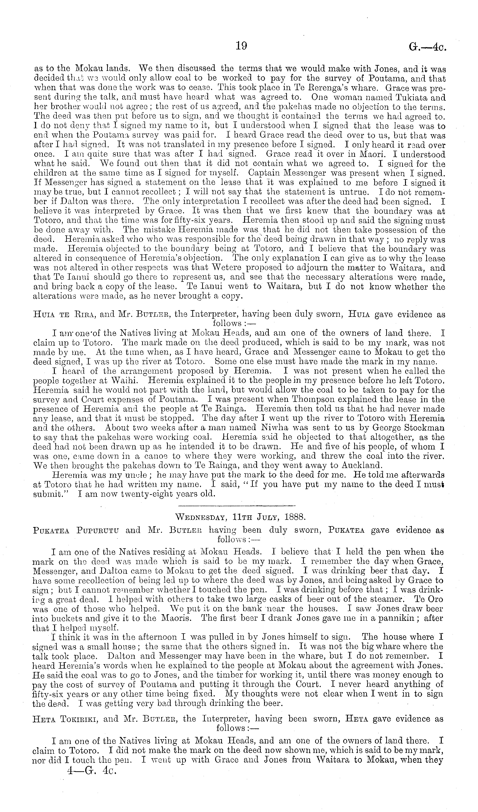 Wednesday, 11th July, 1888. Pukatea Pupurutu and Mr. Butleb having been duly sworn, Pukatea gave evidence as follows: — lam ono of the Natives residing at Mokau Heads. 1 believe that I held the pen when the mark on the deed was made which is said to be my mark. I remember the day when Grace, Messenger, and Dalton came to Mokau to get the deed signed. I was drinking beer that day. I have some recollection of being led up to where the deed was by Jones, and being asked by Grace to sign ; but I cannot remember whether I touched the pen. I was drinking before that; I was drinking a great deal. 1 helped with others to take two large casks of beer out of the steamer. Te Oro was one of those who helped. We put it on the bank near the houses. I saw Jones draw beer into buckets and give it to the Maoris. The first beer I drank Jones gave me in a pannikin ; after that I helped myself. I think it was in the afternoon I was pulled in by Jones himself to sign. The house where I signed was a small house; the same that the others signed in. It was not the big whare where the talk took place. Dalton and Messenger may have been in the whare, but Ido not remember. I heard Heremia's words when he explained to the people at Mokau about the agreement with Jones. He said the coal was to go to Jones, and the timber for working it, until there was money enough to pay the cost of survey of Poutama and putting it through the Court. I never heard anything of fifty-six years or any other time being fixed. My thoughts were not clear when I went in to sign the desd. I was getting very bad through drinking the beer. Heta Tokieiki, and Mr. Butler, the Interpreter, having been sworn, Heta gave evidence as follows:— lam one of the Natives living at Mokau Heads, and am one of the owners of land there. I claim to Totoro. I did not make the mark on the deed now shown me, which is said to be my mark, nor did I touch the pen. I went up with Grace and Jones from Waitara to Mokau, when they 4—G-. 4c.