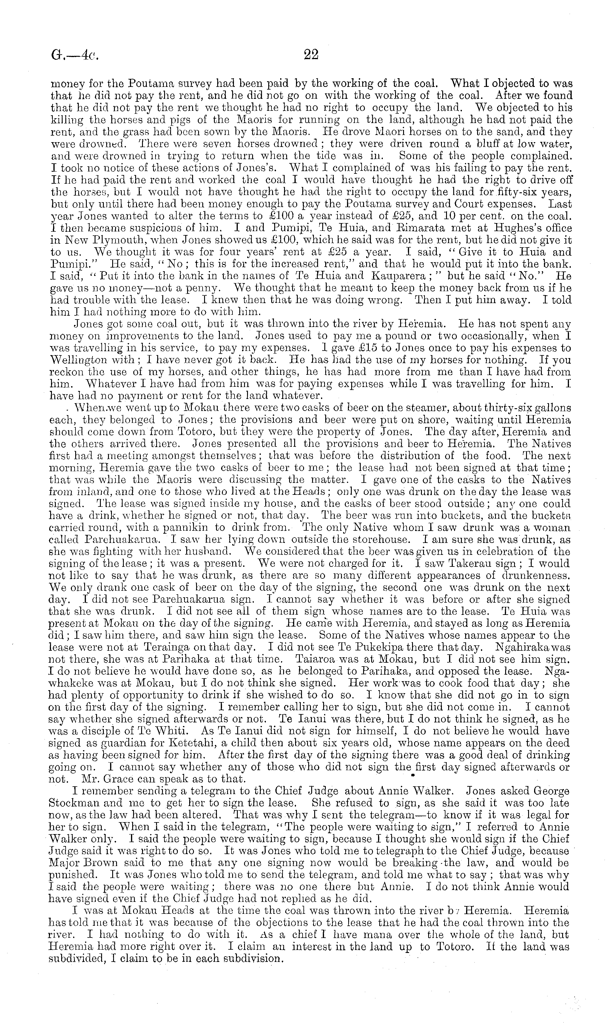 money for the Poutama survey had been paid by the working of the coal. What I objected to was that he did not pay the rent, and he did not go on with the working of the coal. After we found that he did not pay the rent we thought he had no right to occupy the land. We objected to his killing the horses and pigs of the Maoris for running on the land, although he had not paid the rent, and the grass had been sown by the Maoris. He drove Maori horses on to the sand, and they were drowned. There were seven horses drowned ; they were driven round a bluff at low water, and were drowned in trying to return when the tide was in. Some of the people complained. I took no notice of these actions of Jones's. What I complained of was his failing to pay the rent. If he had paid the rent and worked the coal I would have thought he had the right to drive off the horses, but I would not have thought he had the right to occupy the land for fifty-six years, but only until there had been money enough to pay the Poutama survey and Court expenses. Last year Jones wanted to alter the terms to £100 a year instead of £25, and 10 per cent, on the coal. I then became suspicious of him. I and Pumipi, Te Huia, and Eimarata met at Hughes's office in New Plymouth, when Jones showed us £100, which he said was for the rent, but he did not give it to us. We thought it was for four years' rent at £25 a year. I said, " Give it to Huia and Pumipi." He said, " No; this is for the increased rent," and that ho would put it into the bank. I said, " Put it into the bank in the names of Te Huia and Kauparera ; " but he said " No." He gave us no money —not a penny. We thought that ho meant to keep the money back from us if he had trouble with the lease. I knew then that he was doing wrong. Then I put him away. I told him I had nothing more to do with him. Jones got some coal out, but it was thrown into the river by Heremia. He has not spent any money on improvements to the land. Jones used to pay me a pound or two occasionally, when I was travelling in his service, to pay my expenses. 1 gave £15 to Jones once to pay his expenses to Wellington with ; I have never got it back. He has had the use of my horses for nothing. If you reckon the use of my horses, and other things, he has had more from me than I have had from him. Whatever I have had from him was for paying expenses while I was travelling for him. I have had no payment or rent for the land whatever. • When.we went up to Mokau there were two casks of beer on the steamer, about thirty-six gallons each, they belonged to Jones; the provisions and beer were put on shore, waiting until Heremia should come down from Totoro, but they were the property of Jones. The day after, Heremia and the others arrived there. Jones presented all the provisions and beer to Heremia. The Natives first had a meeting amongst themselves ; that was before the distribution of the food. The next morning, Heremia gave the two casks of beer to me ; the lease had not been signed at that time; that was while the Maoris were discussing the matter. I gave one of the casks to the Natives from inland, and one to those who lived at the Heads; only one was drunk on the day the lease was signed. The lease was signed inside my house, and the casks of beer stood outside; an}' one could have a drink, whether he signed or not, that day. The beer was run into buckets, and the buckets! carried round, with a pannikin to drink from. The only Native whom I saw drunk was a woman called Parehuakarua. I saw her lying down outside the storehouse. lam sure she was drunk, as she was fighting with her husband. We considered that the beer was given us in celebration of the signing of the lease ;it was a present. We were not charged for it. I saw Takerau sign ; I would not like to say that he was drunk, as there are so many different appearances of drunkenness. We only drank one cask of beer on the day of the signing, the second one was drunk on the next day. I did not see Parehuakarua sign. I cannot say whether it was before or after she signed that she was drunk. I did not see all of them sign whose names are to the lease. Te Huia was present at Mokau on the day of the signing. He came with Heremia, and stayed as long as Heremia did; I saw him there, and saw him sign the lease. Some of the Natives whose names appear to the lease were not at Terainga on that day. I did not see Te Pukekipa there that day. Ngahirakawas not there, she was at Parihaka at that time. Taiaroa was at Mokau, but I did not see him sign. Ido not believe he would have done so, as he belonged to Parihaka, and opposed the lease. Ngawhakeke was at Mokau, but Ido not think she signed. Her work was to cook food that day; she had plenty of opportunity to drink if she wished to do so. I know that she did not go in to sign on the first day of the signing. I remember calling her to sign, but she did not come in. I cannot say whether she signed afterwards or not. Te lanui was there, but Ido not think he signed, as he was a disciple of Te Whiti. As Te lanui did not sign for himself, I do not believe ho would have signed as guardian for Ketetahi, a child then about six years old, whoso name appears on the deed as having been signed for him. After the first day of the signing there was a good deal of drinking going on. I cannot say whether any of those who did not sign the first day signed afterwards or not. Mr. Grace can speak as to that. I remember sending a telegram to the Chief Judge about Annie Walker. Jones asked George Stockman and me to get her to sign the lease. She refused to sign, as she said it was too late now, as the law had been altered. That was why I sent the telegram—to know if it was legal for her to sign. When I said in the telegram, "The people were waiting to sign," I referred to Annie Walker only. I said the people were waiting to sign, because I thought she would sign if the Chief Judge said it was right to do so. It was Jones who told m
