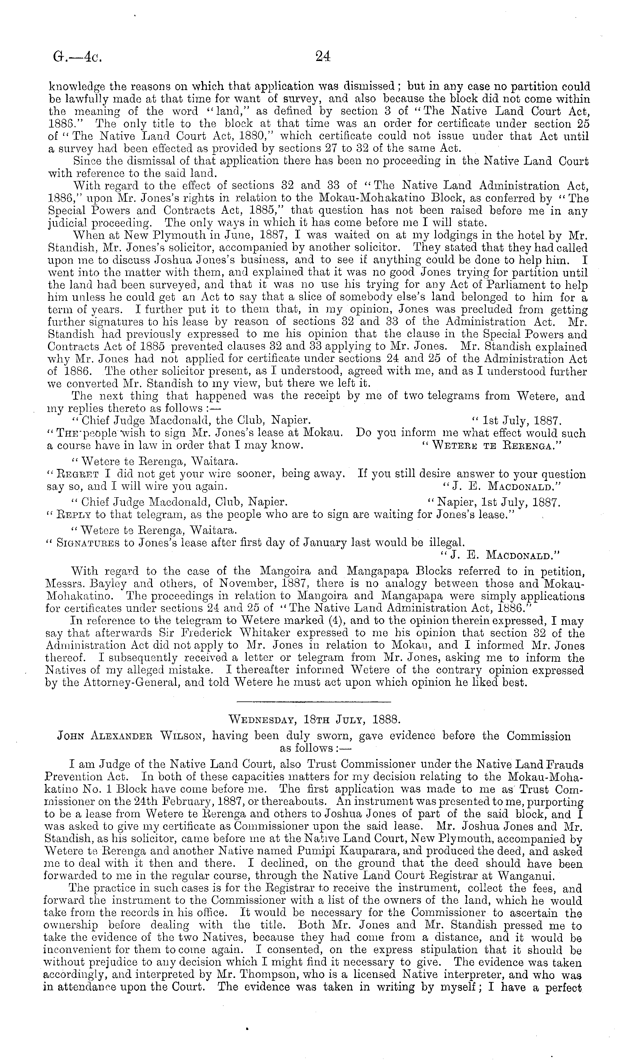 Wednesday, 18th July, 1888. John Alexander Wilson, having been duly sworn, gave evidence before the Commission as follows:— I am Judge of the Native Land Court, also Trust Commissioner under the Native Land Frauds Prevention Act. In both of these capacities matters for my decision relating to the Mokau-Moha-katino No. 1 Block have come before me. The first application was made to me as Trust Commissioner on the 24th February, 1887, or thereabouts. An instrument was presented to me, purporting to be a lease from Wetere te Berenga and others to Joshua Jones of part of the said block, and I was asked to give my certificate as Commissioner upon the said lease. Mr. Joshua Jones and Mr. Standish, as his solicitor, came before me at the Native Land Court, New Plymouth, accompanied by Wetere te Eerenga and another Native named Pumipi Kauparara, and produced the deed, and asked me to deal with it then and there. I declined, on the ground that the deed should have been forwarded to me in the regular course, through the Native Land Court Eegistrar at Wanganui. The practice in such cases is for the Eegistrar to receive the instrument, collect the fees, and forward the instrument to the Commissioner with a list of the owners of the land, which ho would take from the records in his office. It would be necessary for the Commissioner to ascertain the ownership before dealing with the title. Both Mr. Jones and Mr. Standish pressed me to take the evidence of the two Natives, because they had come from a distance, and it would be inconvenient for them to come again. I consented, on the express stipulation that it should be without prejudice to any decision which I might find it necessary to give. The evidence was taken accordingly, and interpreted by Mr. Thompson, who is a licensed Native interpreter, and who was in attendance upon the Court. The evidence was taken in writing by myself; I have a perfect