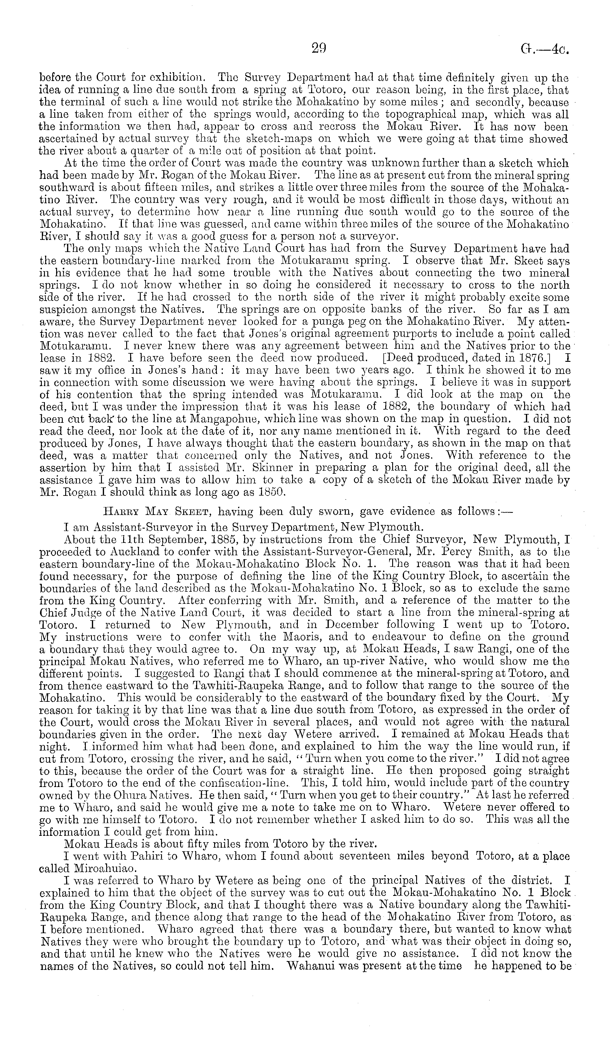 before the Court for exhibition. The Survey Department had at that time definitely given up the idea of running a line due south from a spring at Totoro, our reason being, in the first place, that the terminal of such a line would not strike the Mohakatino by some miles ; and secondly, because a line taken from either of the springs would, according to the topographical map, which was all the information we then had, appear to cross and recross the Mokau River. It has now been ascertained by actual survey that the sketch-maps on which we were going at that time showed the river about a quarter of a mile oat of position at that point. At the time the order of Court was made the country was unknown further than a sketch which had been made by Mr. Began of the Mokau River. The line as at present cut from the mineral spring southward is about fifteen miles, and strikes a little over three miles from the source of the Mohakatino River. The country was very rough, and it would be most difficult in those days, without an actual survey, to determine how near a line running due south would go to the source of the Mohakatino. If that line was guessed, and came within three miles of the source of the Mohakatino River, I should say it was a good guess for a person not a surveyor. The only maps which the Native Land Court has had from the Survey Department have had the eastern boundary-line marked from the Motukaramu spring. I observe that Mr. Skeet says in his evidence that he had some trouble with the Natives about connecting the two mineral springs. Ido not know whether in so doing he considered it necessary to cross to the north side of the river. If he had crossed to the north side of the river it might probably excite some suspicion amongst the Natives. The springs are on opposite banks of the river. So far as lam aware, the Survey Department never looked for a punga peg on the Mohakatino River. My attention was never called to the fact that Jones's original agreement purports to include a point called Motukaramu. I never knew there was any agreement between him and the Natives prior to the lease in 1882. I have before seen the deed now produced. [Deed produced, dated in 1876.] I saw it my office in Jones's hand :it may have been two years ago. I think he showed it to me in connection with some discussion we were having about the springs. I believe it was in support of his contention that the spring intended was Motukaramu. I did look at the map on the deed, but I was under the impression that it was his lease of 1882, the boundary of which had been Cut back'to the line at Mangapohue, which line was shown on the map in question. I did not read the deed, nor look at the date of it, nor any name mentioned in it. With regard to the deed produced by Jones, I have always thought that the eastern boundary, as shown in the map on that deed, was a matter that concerned only the Natives, and not Jones. "With reference to the assertion by him that I assisted Mr. Skinner in preparing a plan for the original deed, all the assistance I gave him was to allow him to take a copy of a sketch of the Mokau River made by Mr. Rogan I should think as long ago as 1830. Habby May Skeet, having been duly sworn, gave evidence as follows: — I am Assistant -Survey or in the Survey Department, New Plymouth. About the 11th September, 1885, by instructions from the Chief Surveyor, New 7 Plymouth, I proceeded to Auckland to confer with the Assistant-Surveyor-General, Mr. Percy Smith, as to the eastern boundary-line of the Mokau-Mohakatino Block No. 1. The reason was that it had been found necessary, for the purpose of defining the line of the King Country Block, to ascertain the boundaries of the land described as the Mokau-Mohakatino No. 1 Block, so as to exclude the same from the King Country. After conferring with Mr. Smith, and a reference of the matter to the Chief Judge of the Native Land Court, it was decided to start a line from the mineral-spring at Totoro. I returned to New Plymouth, and in December following I went up to Totoro. My instructions were to confer with the Maoris, and to endeavour to define on the ground a boundary that they would agree to. On my way up, at Mokau Heads, I saw Rangi, one of the principal Mokau Natives, who referred me to Wharo, an up-river Native, who would show me the different points. I suggested to Rangi that I should commence at the mineral-spring at Totoro, and from thence eastward to the Tawhiti-Raupeka Range, and to follow that range to the source of the Mohakatino. This would be considerably to the eastward of the boundary fixed by the Court. My reason for taking it by that line was that a line due south from Totoro, as expressed in the order of the Court, would cross the Mokau River in several places, and would not agree with the natural boundaries given in the order. The next day Wetere arrived. I remained at Mokau Heads that night. I.informed him what had been done, and explained to him the way the line would run, if cut from Totoro, crossing the river, and he said, " Turn when you come to the river." I did not agree to this, because the order of the Court was for a straight line. He then proposed going straight from Totoro to the end of the confiscation-line. This, I told him, would include part of the country owned by the Ohura Natives. He then said, " Turn when you get to their country." At last he referred me to Wharo, and said he would give me a note to take me on to Wharo. Wetere never offered to go with me himself to Totoro. Ido not remember whether I asked him to do so. This was all the information I could get from him. Mokau Heads is about fifty miles from Totoro by the river. I went with Pahiri to Wharo, whom I found about seventeen miles beyond Totoro, at a place called Miroahuiao. I was referred to Wharo by Wetere as being one of the principal Natives of the district. I explained to him that the object of the survey w Tas to cut out the Mokau-Mohakatino No. 1 Blo