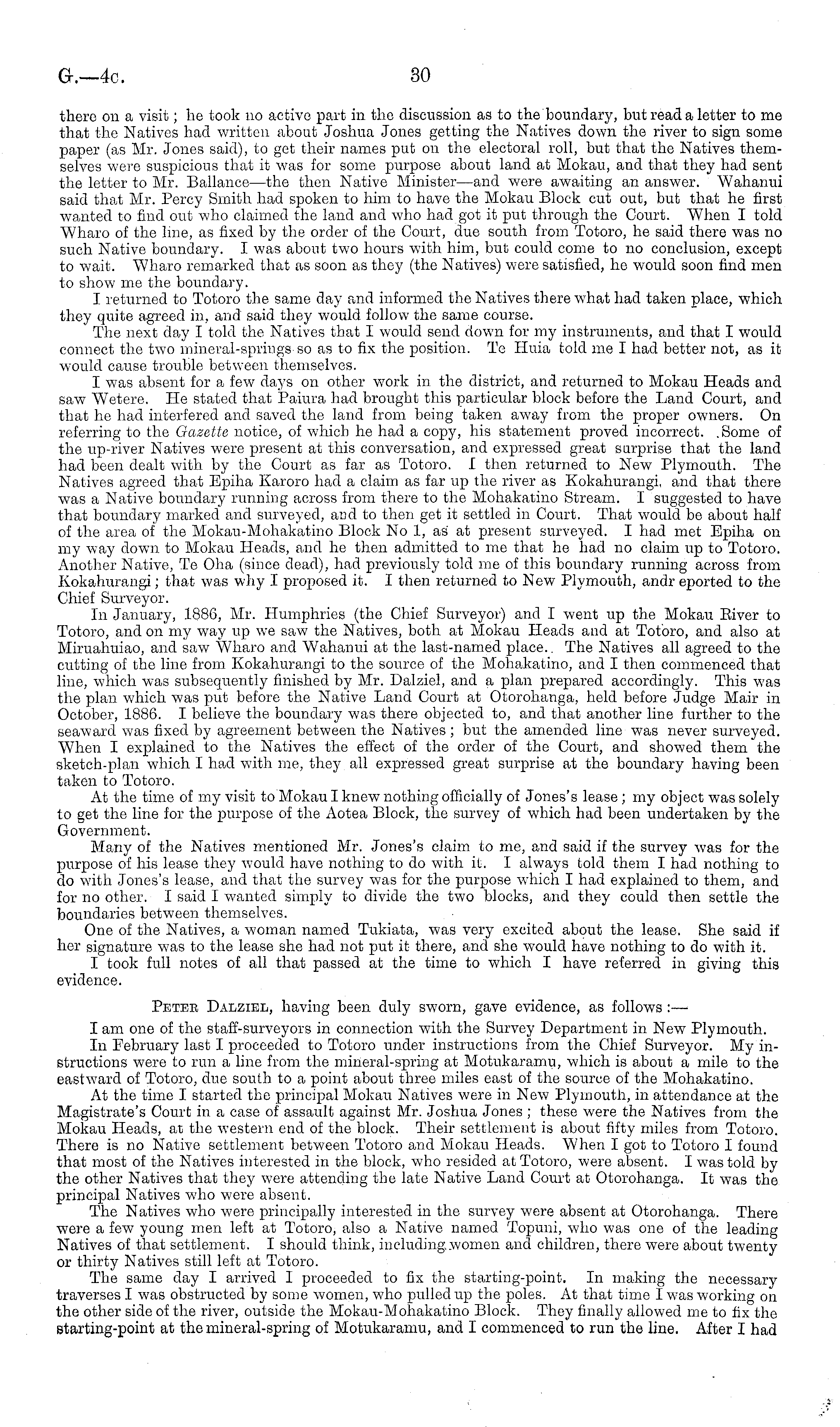 there on a visit; he took no active part in the discussion as to the boundary, but read a letter to me that the Natives had written about Joshua Jones getting the Natives down the river to sign some paper (as Mr. Jones said), to get their names put on the electoral roll, but that the Natives themselves were suspicious that it was for some purpose about land at Mokau, and that they had sent the letter to Mr. Ballance —the then Native Minister—and were awaiting an answer. Wahanui said that Mr. Percy Smith had spoken to him to have the Mokau Block cut out, but that he first wanted to find out who claimed the land and who had got it put through the Court. When I told "Wharo of the line, as fixed by the order of the Court, due south from Totoro, he said there was no such Native boundary. I was about two hours with him, but could come to no conclusion, except to wait. Wharo remarked that as soon as they (the Natives) were satisfied, he would soon find men to show me the boundary. I returned to Totoro the same day and informed the Natives there what had taken place, which they quite agreed in, and said they would follow the same course. The next day I told the Natives that I would send down for my instruments, and that I would connect the two mineral-springs-so as to fix the position. Te Huia told me I had better not, as it would cause trouble between themselves. I was absent for a few days on other work in the district, and returned to Mokau Heads and saw W Tetere. He stated that Paiura had brought this particular block before the Land Court, and that he had interfered and saved the land from being taken away from the proper owners. On referring to the Gazette notice, of which he had a copy, his statement proved incorrect. .Some of the up-river Natives were present at this conversation, and expressed great surprise that the land had been dealt with by the Court as far as Totoro. I then returned to New Plymouth. The Natives agreed that Epiha Karoro had a claim as far up the river as Kokahurangi. and that there was a Native boundary running across from there to the Mohakatino Stream. I suggested to have that boundary marked and surveyed, and to then get it settled in Court. That would be about half of the area of the Mokau-Mohakatino Block No 1, as at present surveyed. I had met Epiha on my way down to Mokau Heads, and he then admitted to me that he had no claim up to Totoro. Another Native, Te Oha (since dead), had previously told me of this boundary running across from Kokahurangi; that was why I proposed it. I then returned to New Plymouth, andr eported to the Chief Surveyor. In January, 1886, Mr. Humphries (the Chief Surveyor) and I went up the Mokau Eiver to Totoro, and on my way up we saw the Natives, both at Mokau Heads and at Totoro, and also at Miruahuiao, and saw Wharo and Wahanui at the last-named place.. The Natives all agreed to the cutting of the line from Kokahurangi to the source of the Mohakatino, and I then commenced that line, which was subsequently finished by Mr. Dalziel, and a plan prepared accordingly. This was the plan which was put before the Native Land Court at Otorohanga, held before Judge Mair in October, 1886. I believe the boundary was there objected to, and that another line further to the seaward was fixed by agreement between the Natives ; but the amended line was never surveyed. When I explained to the Natives the effect of the order of the Court, and showed them the sketch-plan which I had with me, they all expressed great surprise at the boundary having been taken to Totoro. At the time of my visit to Mokau I knew nothing officially of Jones's lease; my object was solely to get the line for the purpose of the Aotea Block, the survey of which had been undertaken by the Government. Many of the Natives mentioned Mr. Jones's claim to me, and said if the survey was for the purpose of his lease they would have nothing to do with it. I always told them I had nothing to do with Jones's lease, and that the survey was for the purpose which I had explained to them, and for no other. I said I wanted simply to divide the two blocks, and they could then settle the boundaries between themselves. One of the Natives, a woman named Tukiata, was very excited about the lease. She said if her signature was to the lease she had not put it there, and she would have nothing to do with it. I took full notes of all that passed at the time to which I have referred in giving this evidence. Peteb Dalziel, having been duly sworn, gave evidence, as follows :— I am one of the staff-surveyors in connection with the Survey Department in New Plymouth. In February last I proceeded to Totoro under instructions from the Chief Surveyor. My instructions were to run a line from the mineral-spring at Motukaramu, which is about a mile to the eastward of Totoro, due south to a point about three miles east of the source of the Mohakatino. At the time I started the principal Mokau Natives were in New Plymouth, in attendance at the Magistrate's Court in a case of assault against Mr. Joshua Jones ; these were the Natives from the Mokau Heads, at the western end of the block. Their settlement is about fifty miles from Totoro. There is no Native settlement between Totoro and Mokau Heads. When I got to Totoro I found that most of the Natives interested in the block, who resided at Totoro, were absent. I was told by the other Natives that they were attending the late Native Land Court at Otorohanga. It was the principal Natives who were absent. The Natives who were principally interested in the survey were absent at Otorohanga. There were a few young men left at Totoro, also a Native named Topuni, who was one of the leading Natives of that settlement. I should think, including women and children, there were about twenty or thirty Natives still left at Totoro. The same day I arrived I proceeded to fix the starting-point. In making the necessary traverses I was obstructed by some women, who pulled up the p