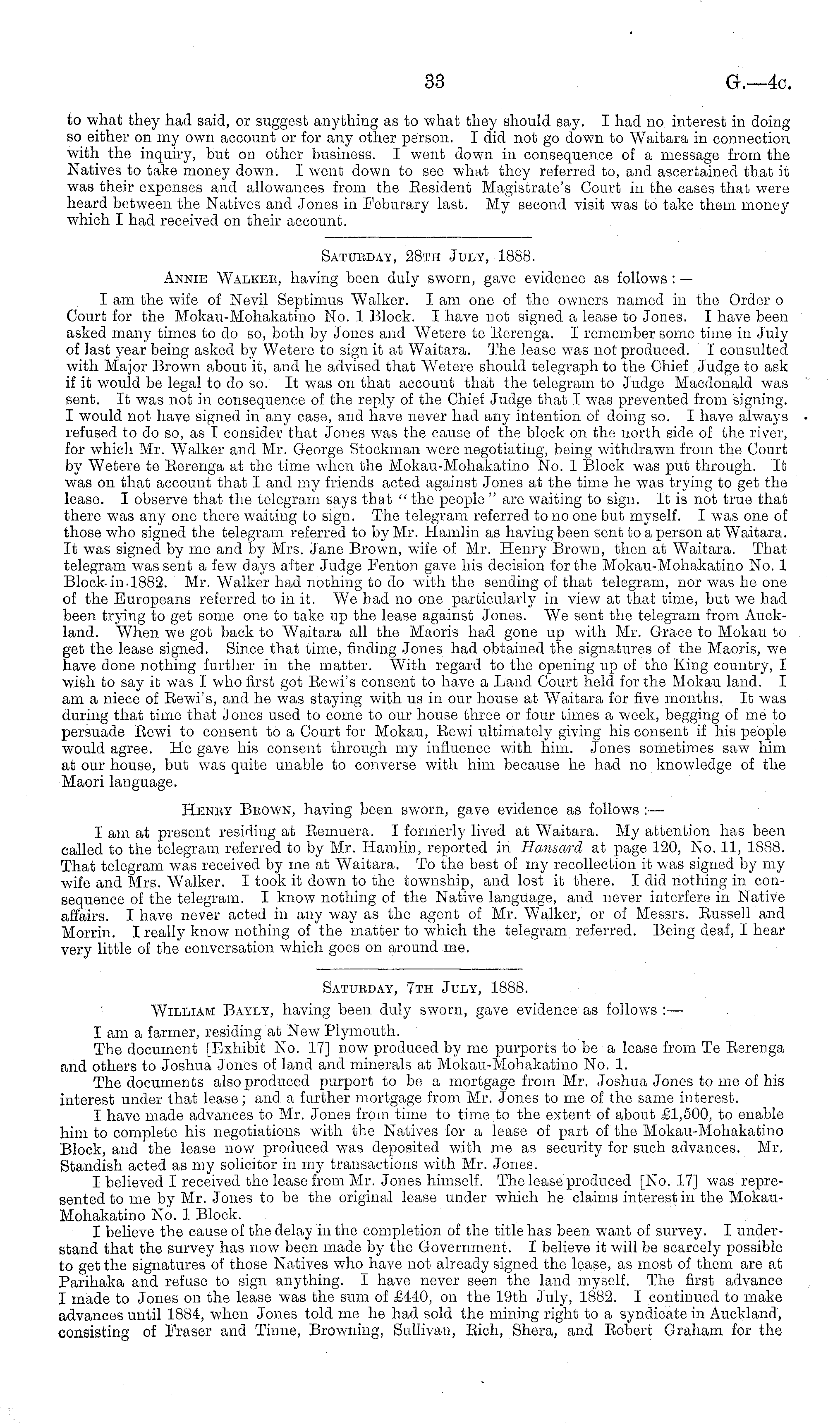 Saturday, 28th July, 1888. Annie Walker, having been duly sworn, gave evidence as follows : — lam the wife of Nevil Septimus "Walker. lam one of the owners named in the Order o Court for the Mokau-Mohakatino No. 1 Block. I have not signed a lease to Jones. I have been asked many times to do so, both by Jones and Wetere te Eerenga. I remember some time in July of last year being asked by Wetere to sign it at Waitara. The lease was not produced. I consulted with Major Brown about it, and he advised that Wetere should telegraph to the Chief Judge to ask if it would be legal to do so. It was on that account that the telegram to Judge Macdonald was sent. It was not in consequence of the reply of the Chief Judge that I was prevented from signing. I would not have signed in any case, and have never had any intention of doing so. I have always refused to do so, as I consider that Jones was the cause of the block on the north side of the river, for which Mr. Walker and Mr. George Stockman were negotiating, being withdrawn from the Court by Wetere te Eerenga at the time when the Mokau-Mohakatino No. 1 Block was put through. It was on that account that I and my friends acted against Jones at the time ho was trying to get the lease. I observe that the telegram says that " the people " are waiting to sign. It is not true that there was any one there waiting to sign. The telegram referred to no one but myself. I was one of those who signed the telegram referred to by Mr. Hamlin as having been sent to a person at Waitara. It was signed by me and by Mrs. Jane Brown, wife of Mr. Henry Brown, then at Waitara. That telegram was sent a few days after Judge Fenton gave his decision for the Mokau-Mohakatino No. 1 Block-in-1882. Mr. Walker had nothing to do w 7ith the sending of that telegram, nor w ras he one of the Europeans referred to in it. We had no one particularly in view at that time, but we had been trying to get some one to take up the lease against Jones. We sent the telegram from Auckland. When we got back to Waitara all the Maoris had gone up with Mr. Grace to Mokau to get the lease signed. Since that time, finding Jones had obtained the signatures of the Maoris, we have done nothing further in the matter. With regard to the opening up of the King country, I wish to say it was I who first got Eewi's consent to have a Laud Court held for the Mokau land. I am a niece of Eewi's, and he was staying with us in our house at Waitara for five months. It was during that time that Jones used to come to our house three or four times a week, begging of me to persuade Eewi to consent to a Court for Mokau, Eewi ultimately giving his consent if his people would agree. He gave his consent through my influence with him. Jones sometimes saw him at our house, but was quite unable to converse with him because he had no knowledge of the Maori language. Henky Brown, having been sworn, gave evidence as follows : — lam at present residing at Eemuera. I formerly lived at Waitara. My attention has been called to the telegram referred to by Mr. Hamlin, reported in Hansard at page 120, No. 11, 1888. That telegram was received by me at Waitara. To the best of my recollection it was signed by my wife and Mrs. Walker. I took it down to the township, and lost it there. I did nothing in consequence of the telegram. I know nothing of the Native language, and never interfere in Native affairs. I have never acted in any way as the agent of Mr. Walker, or of Messrs. Eussell and Morrin. I really know nothing of the matter to which the telegram referred. Being deaf, I hear very little of the conversation which goes on around me.