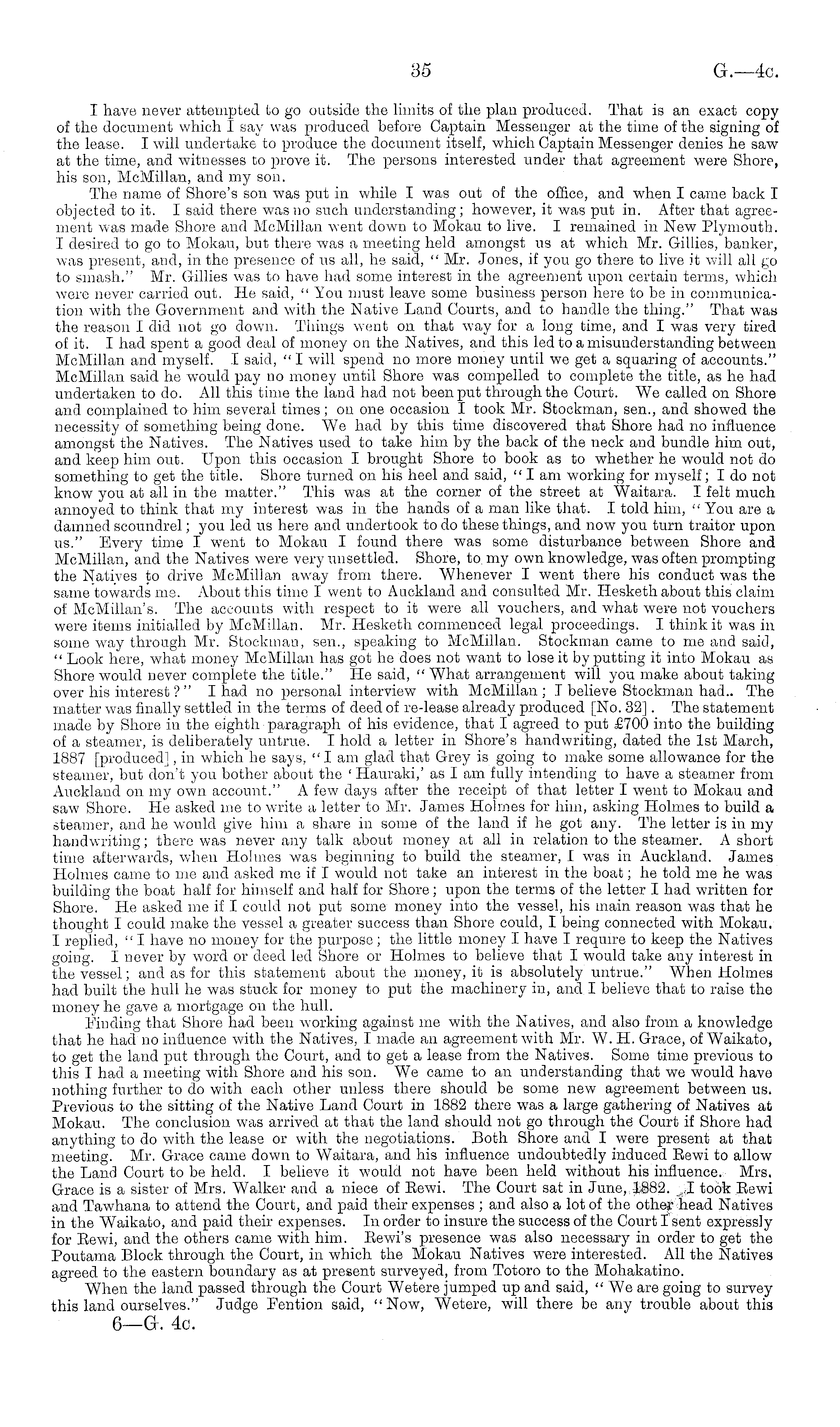 I have never attempted to go outside the limits of the plan produced. That is an exact copy of the document which I say was produced before Captain Messenger at the time of the signing of the lease. I will undertake to produce the document itself, which Captain Messenger denies he saw at the time, and witnesses to prove it. The persons interested under that agreement were Shore, his son, McMillan, and my son. The name of Shore's son was put in while I was out of the office, and when I came back I objected to it. I said there was no such understanding; however, it was put in. After that agreement was made Shore and McMillan went down to Mokau to live. I remained in New Plymouth. I desired to go to Mokau, but there was a meeting held amongst us at which Mr. Gillies, banker, was present, and, in the presence of us all, he said, " Mr. Jones, if you go there to live it will all go to smash." Mr. Gillies was to have had some interest in the agreement upon certain terms, which were never carried out. He said, " You must leave some business person here to be in communication with the Government and with the Native Land Courts, and to handle the thing." That was the reason I did not go down. Tilings went on that way for a long time, and I was very tired of it. I had spent a good deal of money on the Natives, and this led to a misunderstanding between McMillan and myself. I said, " I will spend no more money until we get a squaring of accounts." McMillan said he would pay no money until Shore was compelled to complete the title, as he had undertaken to do. All this time the land had not been put through the Court. We called on Shore and complained to him several times ; on one occasion I took Mr. Stockman, sen., and showed the necessity of something being done. We had by this time discovered that Shore had no influence amongst the Natives. The Natives used to take him by the back of the neck and bundle him out, and keep him out. Upon this occasion I brought Shore to book as to whether he would not do something to get the title. Shore turned on his heel and said, "I am working for myself; Ido not know you at all in the matter." This was at the corner of the street at Waitara. I felt much annoyed to think that my interest was in the hands of a man like that. I told him, " You are a damned scoundrel; you led us here and undertook to do these things, and now you turn traitor upon us." Every time I went to Mokau I found there was some disturbance between Shore and McMillan, and the Natives were very unsettled. Shore, to my own knowledge, was often prompting the Natives to drive McMillan away from there. Whenever I went there his conduct was the same towards 1113. About this time I went to Auckland and consulted Mr. Hesketh about this claim of McMillan's. The accounts with respect to it were all vouchers, and what were not vouchers were items initialled by McMillan. Mr. Hesketh commenced legal proceedings. I think it was in some way through Mr. Stockman, sen., speaking to McMillan. Stockman came to me and said, " Look here, what money McMillan has got he does not want to lose it by putting it into Mokau as Shore would never complete the title." He said, " What arrangement will you make about taking over his interest ? " I had no personal interview with McMillan ; T believe Stockman had.. The matter was finally settled in the terms of deed of re-lease already produced [No. 32]. The statement made by Shore in the eighth paragraph of his evidence, that I agreed to put £700 into the building of a steamer, is deliberately untrue. I hold a letter in Shore's handwriting, dated the Ist March, 1887 [produced], in which he says, "I am glad that Grey is going to make some allowance for the steamer, but don't you bother about the ' Hauraki,' as I am fully intending to have a steamer from Auckland on my own account." A few days after the receipt of that letter I went to Mokau and saw Shore. He asked me to write a letter to Mr. James Holmes for him, asking Holmes to build a steamer, paid he would give him a share in some of the land if he got any. The letter is in my handwriting; there was never any talk about money at all in relation to the steamer. A short time afterwards, when Holmes was beginning to build the steamer, I was in Auckland. James Holmes came to me and asked me if I would not take an interest in the boat; he told me he was building the boat half for himself and half for Shore; upon the terms of the letter I had written for Shore. He asked me if I could not put some money into the vessel, his main reason was that he thought I could make the vessel a greater success than Shore could, I being connected with Mokau. I replied, " I have no money for the purpose; the little money I have I require to keep the Natives going. I never by word or deed led Shore or Holmes to believe that I would take any interest in the vessel; and as for this statement about the money, it is absolutely untrue." When Holmes had built the hull he was stuck for money to put the machinery in, and I believe that to raise the money he gave a mortgage on. the hull. Finding that Shore had been working against me with the Natives, and also from a knowledge that he had no influence with the Natives, I made an agreement with Mr. W. H. Grace, of Waikato, to get the land put through the Court, and to get a lease from the Natives. Some time previous to this I had a meeting with Shore and his son. We came to an understanding that we would have nothing further to do with each other unless there should be some new agreement between us. Previous to the sitting of the Native Land Court in 1882 there was a large gathering of Natives at Mokau. The conclusion was arrived at that the land should not go through the' Court if Shore had anything to do with the lease or with the negotiations. Both Shore and I were present at that meeting. Mr. Grace came down to Waitara, and his influence undoubtedly induced Eewi to allow the Land Court to be held. I belie