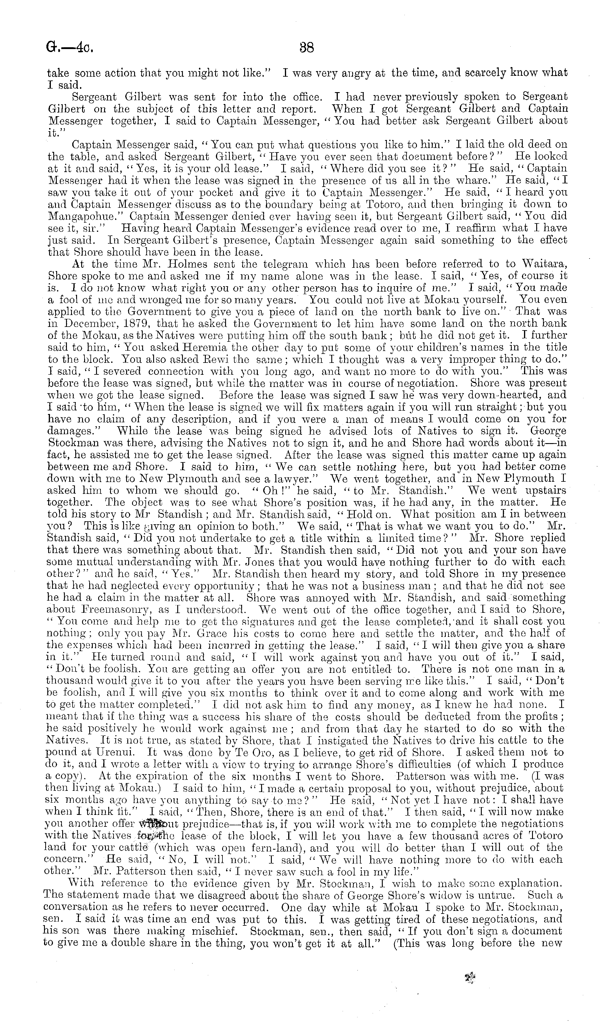 take some action that you might not like." I was very angry at the time, and scarcely know what I said. Sergeant Gilbert was sent for into the office. I had never previously spoken to Sergeant Gilbert on the subject of this letter and report. When I got Sergeant Gilbert and Captain Messenger together, I said to Captain Messenger, "You had better ask Sergeant Gilbert about it." Captain Messenger said, " You can put what questions you like to him." I laid the old deed on the table, and asked Sergeant Gilbert, " Have you over seen that document before? " He looked at it and said, " Yes, it is your old lease." I said, " Where did you see it? " He said, " Captain Messenger had it when the lease was signed in the presence of us all in the whare." He said, "I saw you take it out of your pocket and give it to Captain Messenger." He said, " I heard you and Captain Messenger discuss as to the boundary being at Totoro, and then bringing it down to Mangapohue." Captain Messenger denied ever having seen it, but Sergeant Gilbert said, " You did see it, sir." Having heard Captain Messenger's evidence read over to me, I reaffirm what I have just said. In Sergeant Gilbert's presence, Captain Messenger again said something to the effect that Shore should have been in the lease. At the time Mr. Holmes sent the telegram which has been before referred to to Waitara, Shore spoke to me and asked me if my name alone was in the lease. I said, " Yes, of course it is. Ido not know what right you or any other person has to inquire of me." I said, " You made a fool of mo and wronged me for so many years. You could not live at Mokau yourself. You even applied to the Government to give you a piece of laud on the north bank to live on." That was in December, 1879, that he asked the Government to let him have some land on the north bank of the Mokau, as the Natives were putting him off the south bank ; but he did not get it. I further said to him, " You asked Heremia the other day to put some of your children's names in the title to the block. You also asked Eewi the same; which I thought was a very improper thing to do." I said, " I severed connection with you long ago, and want no more to do with you." This was before the lease was signed, but while the matter was in course of negotiation. Shore was present when we got the lease signed. Before the lease was signed I saw he was very down-hearted, and I said 'to him, " When the lease is signed we will fix matters again if you will run straight ; but you have no claim of any description, and if you were a man of means I would come on you for damages." While the lease was being signed he advised lots of Natives to sign it. George Stockman was there, advising the Natives not to sign it, and he and Shore had words about it—in fact, he assisted me to get the lease signed. After the lease was signed this matter came up again between me and Shore. I said to him, "We can settle nothing here, but you had better come down with me to New Plymouth and see a lawyer." We went together, and in New Plymouth I asked him to "whom we should go. "Oh !" he said, "to Mr. Standish." We went upstairs together. The object was to see what Shore's position was, if he had any, in the matter. He told his story to Mr Standish ; and Mr. Standish said, " Hold on. What position am lin between you? This is like giving an opinion to both." We said, " That is what we want you to do." Mr. Standish said, " Did you not undertake to get a title within a limited time? " Mr. Shore replied that there was something about that. Mr. Standish then said, " Did not you and your son have some mutual understanding with Mr. Jones that you would have nothing further to do with each other?" and he said, " Yes." Mr. Standish then heard my story, and told Shore in my presence that he had neglected every opportunity; that he was not a business man; and that he did not see he had a claim in the matter at all. Shore was annoyed with Mr. Standish, and said something about Freemasonry, as I understood. We went out of the office together, and I said to Shore, " You come and help me to get the signatures and get the lease completed,'and it shall cost you nothing; only yon pay Mr. Grace his costs to come here and settle the matter, and the half of the expenses which had been incurred in getting the lease." I said, " I will then give you a share in it." He turned round and said, " I will work against you and have you out of it." I said, " Don't be foolish. You are getting an offer you are not entitled to. There is not one man in a thousand would give it to you after the years you have been serving me like this." I said, " Don't be foolish, and I will give you six months to think over it and to come along and work with me to get the matter completed." I did not ask him to find any money, as I knew he had none. I meant that if the thing was a success his share of the costs should be deducted from the profits ; he said positively he would work against me ; and from that day he started to do so with the Natives. It is not true, as stated by Shore, that I instigated the Natives to drive his cattle to the pound at Urenui. It was done by To Oro, as I believe, to get rid of Shore. I asked them not to do it, and I wrote a letter with a view to trying to arrange Shore's difficulties (of which I produce a copy). At the expiration of the six mouths I went to Shore. Patterson was with me. (I was then living at Mokau.) I said to him, " I made a certain proposal to you, without prejudice, about six months ago have you anything to say to ma?" He said, " Not yet I have not: I shall have when I think fit." I said, " Then, Shore, there is an end of that." 1 then said, " I will now make you another offer wftJfrout prejudice—that is, if you will work with me to complete the negotiations with the Natives for the lease of the block, I will let you have a few thousand acres of Totoro land for your cattle (which was open fern-land), and you will do bette