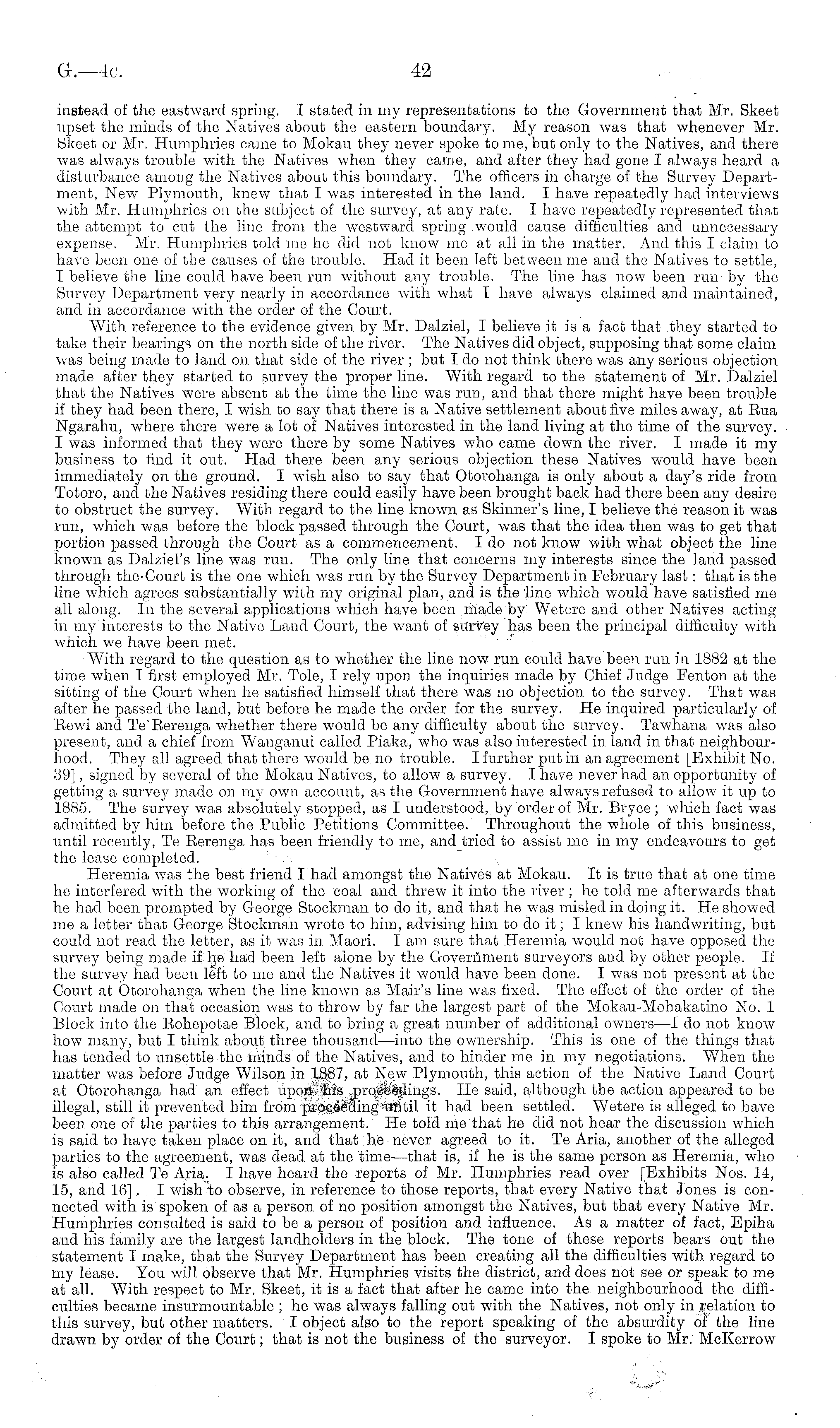 instead of the eastward spring. I stated in my representations to the Government that Mr. Skeet upset the minds of the Natives about the eastern boundary. My reason was that whenever Mr. Skeet or Mr. Humphries came to Mokau they never spoke to me, but only to the Natives, and there was always trouble with the Natives when they came, and after they had gone I always heard a disturbance among the Natives about this boundary. The officers in charge of the Survey Department, New Plymouth, knew that I was interested in the land. I have repeatedly had interviews with Mr. Humphries on the subject of the survey, at any rate. I have repeatedly represented that the attempt to cut the line from the westward spring would cause difficulties and unnecessary expense. Mr. Humphries told mo lie did not know me at all in the matter. And tin's I claim to have been one of the causes of the trouble. Had it been left between me and the Natives to settle, I believe the line could have been run without any trouble. The line has now been run by the Survey Department very nearly in accordance with what I have always claimed and maintained, and in accordance with the order of the Court. With reference to the evidence given by Mr. Dalziel, I believe it is a fact that they started to take their bearings on the north side of the river. The Natives did object, supposing that some claim was being made to land on that side of the river ; but I do not think there was any serious objection made after they started to survey the proper line. With regard to the statement of Mr. Dalziel that the Natives were absent at the time the line was run, and that there might have been trouble if they had been there, I wish to say that there is a Native settlement about five miles away, at Eva Ngarahu, where there were a lot of Natives interested in the land living at the time of the survey. I was informed that they were there by some Natives who came down the river. I made it my business to find it out. Had there been any serious objection these Natives would have been immediately on the ground. I wish also to say that Otorohanga is only about a day's ride from Totoro, and the Natives residing there could easily have been brought back had there been any desire to obstruct the survey. With regard to the line known as Skinner's line, I believe the reason it was run, which was before the block passed through the Court, was that the idea then was to get that portion passed through the Court as a commencement. Ido not know with what object the line known as Dalziel's line was run. The only line that concerns my interests since the land passed through the-Court is the one which was run by the Survey Department in February last: that is the line which agrees substantially with my original plan, and is the line which would have satisfied me all along. In the several applications which have been made by Wetere and other Natives acting in my interests to the Native Laud Court, the want of survey has been the principal difficulty with which we have been met. With regard to the question as to whether the line now run could have been run in 1882 at the time when I first employed Mr. Tole, I rely upon the inquiries made by Chief Judge Fenton at the sitting of the Court when he satisfied himself that there was no objection to the survey. That was after he passed the land, but before he made the order for the survey. Pie inquired particularly of Kewi and Te'Rerenga whether there would be any difficulty about the survey. Tawhana was also present, and a chief from Wauganui called Piaka, who was also interested in land in that neighbourhood. They all agreed that there would be no trouble. I further put in an agreement [Exhibit No. 39], signed by several of the Mokau Natives, to allow a survey. I have never had an opportunity of getting a survey made on my own account, as the Government have always refused to allow it up to 1885. The survey was absolutely stopped, as I understood, by order of Mr. Bryce ; which fact was admitted by him before the Public Petitions Committee. Throughout the whole of this business, until recently, Te Eerenga has been friendly to me, and tried to assist me in my endeavours to get the lease completed. Heremia was ihe best friend I had amongst the Natives at Mokau. It is true that at one time he interfered with the working of the coal and threw it into the river ; he told me afterwards that ho had been prompted by George Stockman to do it, and that he was misled in doing it. He showed me a letter that George Stockman wrote to him, advising him to do it; I knew his handwriting, but could not read the letter, as it was in Maori. lam sure that Heremia would not have opposed the survey being made if he had been left alone by the Government surveyors and by other people. If the survey had been left to me and the Natives it would have been done. I was not present at the Court at Otorohanga when the line known as Mair's line was fixed. The effect of the order of the Court made on that occasion was to throw by far the largest part of the Mokau-Mohakatino No. 1 Block into the Eohepotae Block, and to bring a great number of additional owners —I do not knowhow many, but I think about three thousand—into the ownership. This is one of the things that lias tended to unsettle the minds of the Natives, and to hinder me in my negotiations. When the matter was before Judge Wilson in 1887, at New Plymouth, this action of the Native Land Court at Otorohanga had an effect upon, his proceedings. Pie said, although the action appeared to be illegal, still it prevented him from proceeding until it had been settled. Wetere is alleged to have been one of the parties to this arrangement. He told me that he did not hear the discussion which is said to have taken place on it, and that he never agreed to it. Te Aria, another of the alleged parties to the agreement, was dead at the time—that is, if he is the same person as Heremia, who is also called Te