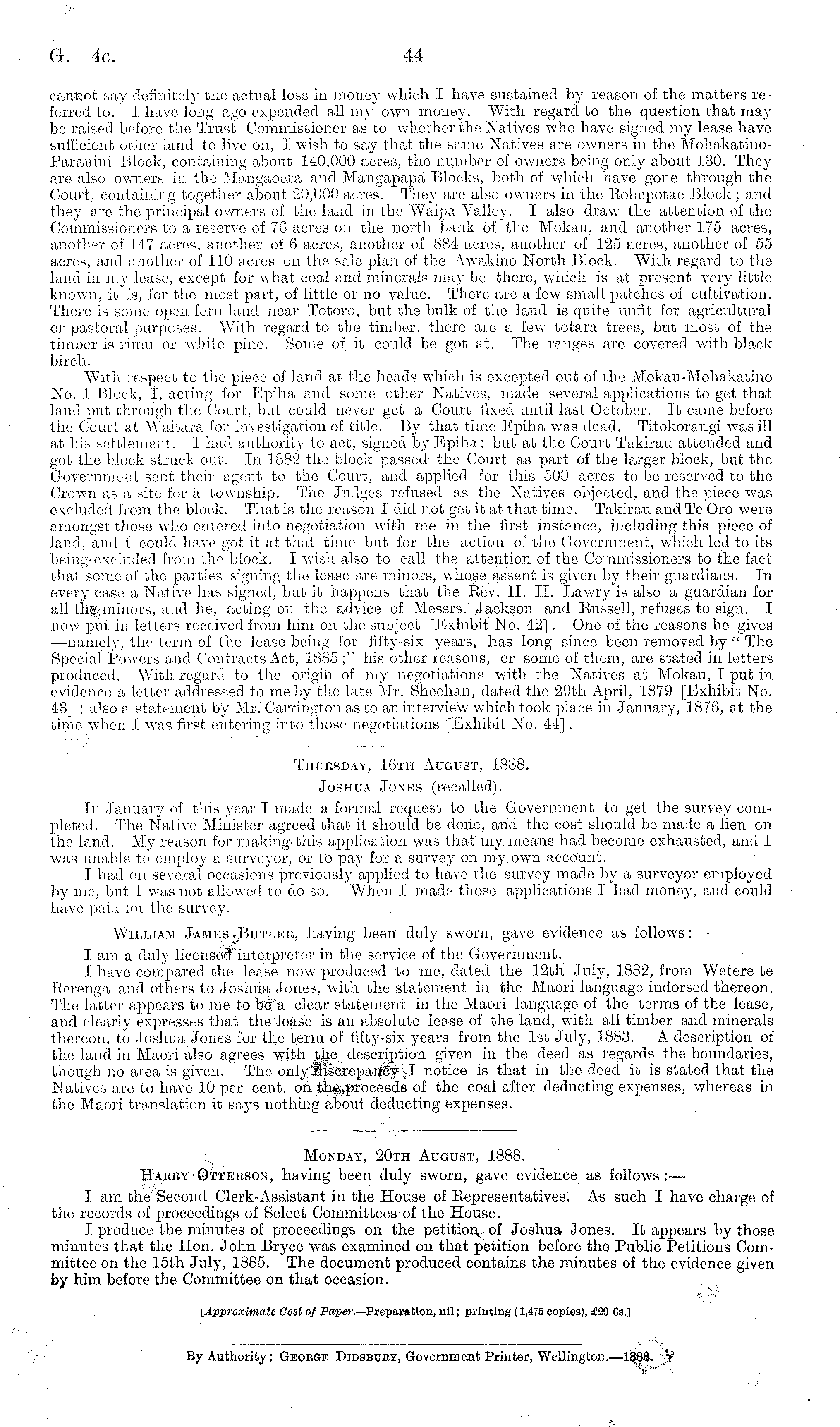 Thubsdav, 16th August, 1888. Joshua Jones (recalled). In January of this year I made a formal request to the Government to get the survey completed. The Native Minister agreed that it should be done, and the cost should be made a lion on the land. My reason for making-this application was that my means had become exhausted, and I was unable to employ a surveyor, or to pay for a survey on my own account. I had on several occasions previously applied to have the survey made by a surveyor employed by me, but I was not allowed to do so. When I made those applications I had money, and could have paid for the survey. William Jamus-Butlki;, having been duly sworn, gave evidence as follows:— I am a duly licensed interpreter in the service of the Government. I have compared the lease now produced to me, dated the 12th July, 1832, from Wetere te Eerenga and others to Joshua Jones, with the statement in the Maori language indorsed thereon. The latter appears to me to bo a clear statement in the Maori language of the terms of the lease, and clearly expresses that the lease is an absolute lease of the land, with all timber and minerals thereon, to Joshua Jones for the term of fifty-six years from the Ist July, 1883. A description of the land in Maori also agrees with the description given in the deed as regards the boundaries, though no area is given. The only discrepancy I notice is that in the deed it is stated that the Natives are to have 10 per cent, on the.proceeds of the coal after deducting expenses, whereas in the Maori translation it says nothing about deducting expenses.