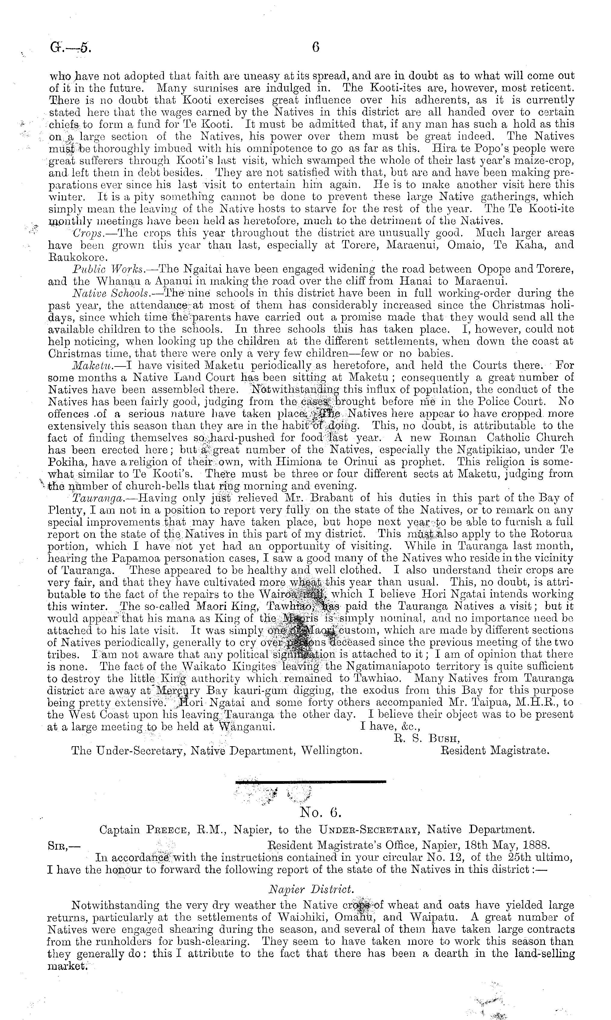 9 No. 6. Captain Peeeoe, E.M., Napier, to the Undeb-Seobetaey, Native Department. Sib, — Besident Magistrate's Office, Napier, 18th May, 1888. In accordance with the instructions contained in your circular No. 12, of the 25th ultimo, I have the honour to forward the following report of the state of the Natives in this district: —- Napier District. Notwithstanding the very dry weather the Native crops of wheat and oats have yielded large returns, particularly at the settlements of Waiohiki, Omahu, and Waipatu. A great number of Natives were engaged shearing during the season, and several of them have taken large contracts from the runholders for bush-clearing. They seem to have taken more to work this season than they generally do: this I attribute to the fact that there has been a dearth in the land-selling market.