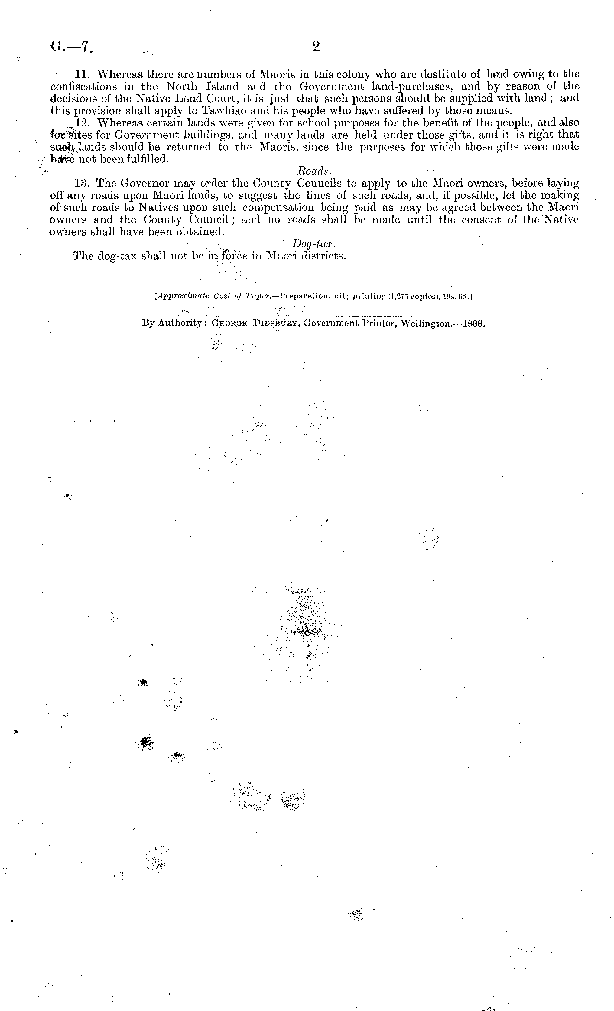 11. Whereas there are numbers of Maoris in this colony who are destitute of laud owing to the confiscations in the North Island and the Government land-purchases, and by reason of the decisions of the Native Land Court, it is just that such persons should be supplied with land ; and this provision shall apply to Tawhiao and his people who have suffered by those means. 12. Whereas certain lands were given for school purposes for the benefit of the people, and also for sites for Government buildings, and many lands are held under those gifts, and it is right that such lands should be returned to the Maoris, since the purposes for which those gifts were made have not been fulfilled. Roach. 13. The Governor may order the Comity Councils to apply to the Maori owners, before laying off any roads upon Maori lands, to suggest the lines of such roads, and, if possible, let the making of such roads to Natives upon such compensation being paid as may be agreed between the Maori owners and the County Council; and no roads shall be made until the consent of the Native, owners shall have been obtained. Dog-tax. The dog-tax shall not be in force in Maori districts. [Approximate Cost of Paper.— Preparation, nil; printing (1,275 copies), 19s. 6d. 1