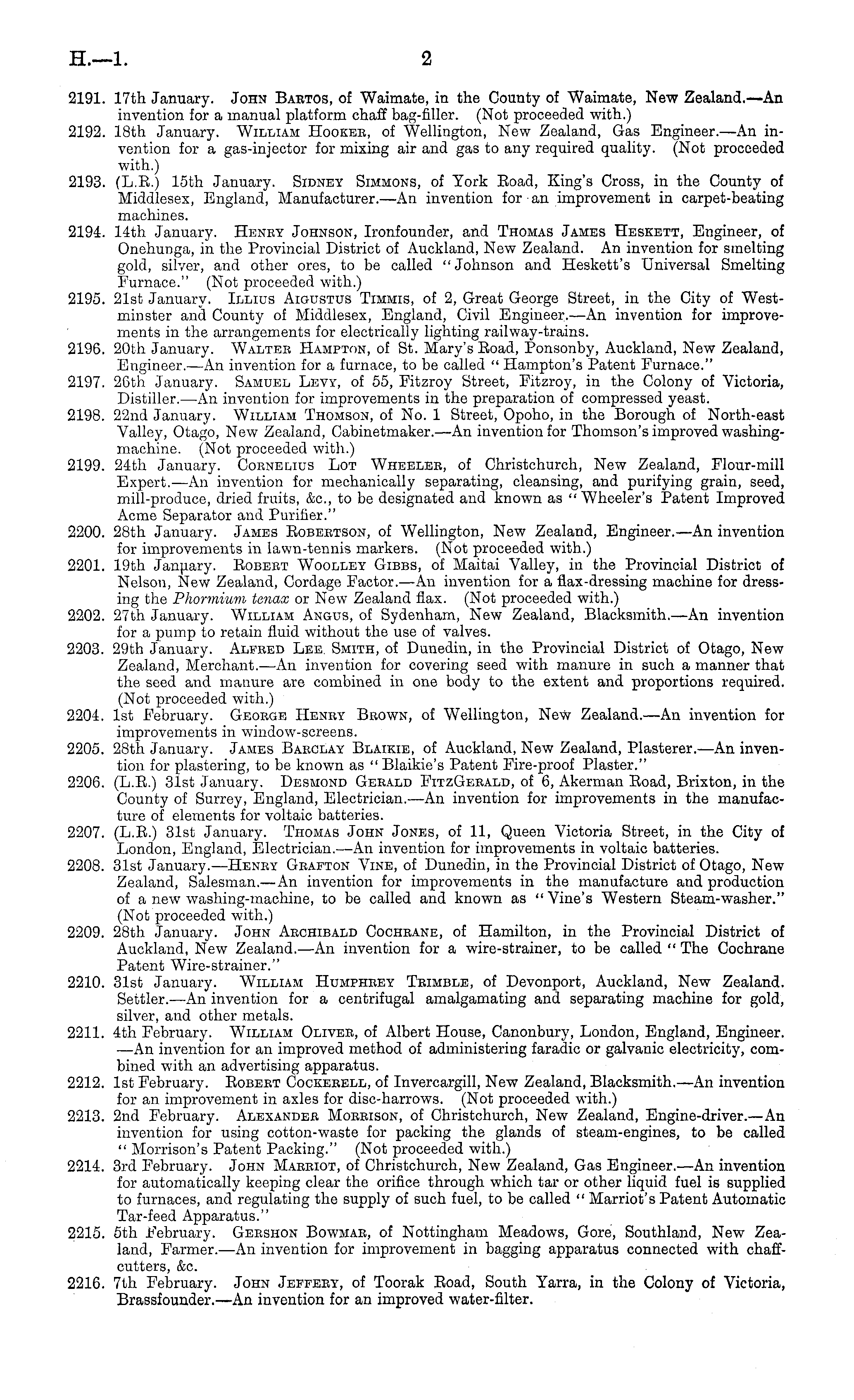 2191. 17th January. John Baetos, of Waimate, in the County of Waimate, New Zealand.—An invention for a manual platform chaff bag-filler. (Not proceeded with.) 2192. 18th January. William Hookee, of Wellington, New Zealand, Gas Engineer.—An invention for a gas-injector for mixing air and gas to any required quality. (Not proceeded with.) 2193. (L.E.) 15th January. Sidney Simmons, of York Eoad, King's Cross, in the County of Middlesex, England, Manufacturer.—An invention for an improvement in carpet-beating machines. 2194. 14th January. Heney Johnson, Ironfounder, and Thomas James Heskett, Engineer, of Onehunga, in the Provincial District of Auckland, New Zealand. An invention for smelting gold, silver, and other ores, to be called "Johnson and Heskett's Universal Smelting Furnace." (Not proceeded with.) 2195. 21st January. Illius Aigustus Timmis, of 2, Great George Street, in the City of Westminster and. County of Middlesex, England, Civil Engineer.—An invention for improvements in the arrangements for electrically lighting railway-trains. 2196. 20th January. Walter Hampton, of St. Mary's Eoad, Ponsonby, Auckland, New Zealand, Engineer.—An invention for a furnace, to be called " Hampton's Patent Furnace." 2197. 26th January. Samuel Levy, of 55, Fitzroy Street, Fitzroy, in the Colony of Victoria, Distiller. —An invention for improvements in the preparation of compressed yeast. 2198. 22nd January. William Thomson, of No. 1 Street, Opoho, in the Borough of North-east Valley, Otago, New Zealand, Cabinetmaker.—An invention for Thomson's improved washingmachine. (Not proceeded with.) 2199. 24th January. Coenehus Lot Wheelee, of Christchurch, New Zealand, Flour-mill Expert.—An invention for mechanically separating, cleansing, and purifying grain, seed, mill-produce, dried fruits, &c, to be designated and known as "Wheeler's Patent Improved Acme Separator and Purifier." 2200. 28th January. James Eobeetson, of Wellington, New Zealand, Engineer.—An invention for improvements in lawn-tennis markers. (Not proceeded with.) 2201. 19th January. Eobeet Woolley Gibbs, of Maitai Valley, in the Provincial District of Nelson, New Zealand, Cordage Factor. —An invention for a flax-dressing machine for dressing the Phormium tanax or New Zealand flax. (Not proceeded with.) 2202. 27th January. William Angus, of Sydenham, New Zealand, Blacksmith.—An invention for a pump to retain fluid without the use of valves. 2203. 29th January. Alfeed Lee. Smith, of Dunedin, in the Provincial District of Otago, New Zealand, Merchant.—An invention for covering seed with manure in such a manner that the seed and manure are combined in one body to the extent and proportions required. (Not proceeded with.) 2204. Ist February. Geoege Hbney Beown, of Wellington, New Zealand.—An invention for improvements in window-screens. 2205. 28th January. James Baeclay Blaikie, of Auckland, New Zealand, Plasterer.—An invention for plastering, to be known as " Blaikie's Patent Fire-proof Plaster." 2206. (L.E.) 31st January. Desmond Geeald FitzGeeald, of 6, Akerman Eoad, Brixton, in the County of Surrey, England, Electrician. —An invention for improvements in the manufacture of elements for voltaic batteries. 2207. (L.E.) 31st January. Thomas John Jones, of 11, Queen Victoria Street, in the City of London, England, Electrician.—An invention for improvements in voltaic batteries. 2208. 31st January.—Heney Geafton Vine, of Dunedin, in the Provincial District of Otago, New Zealand, Salesman.— An invention for improvements in the manufacture and production of a new washing-machine, to be called and known as " Vine's Western Steam-washer." (Not proceeded with.) 2209. 28th January. John Aechibald Cocheane, of Hamilton, in the Provincial District of Auckland, New Zealand.—An invention for a wire-strainer, to be called " The Cochrane Patent Wire-strainer." 2210. 31st January. William Humpheey Teimble, of Devonport, Auckland, New Zealand. Settler.—An invention for a centrifugal amalgamating and separating machine for gold, silver, and other metals. 2211. 4th February. William Olivee, of Albert House, Canonbury, London, England, Engineer. —An invention for an improved method of administering faradic or galvanic electricity, combined with an advertising apparatus. 2212. Ist February. Eobeet Cockeeell, of Invercargill, New Zealand, Blacksmith.—An invention for an improvement in axles for disc-harrows. (Not proceeded with.) 2213. 2nd February. Alexander Moerison, of Christchurch, New Zealand, Engine-driver.—An invention for using cotton-waste for packing the glands of steam-engines, to be called " Morrison's Patent Packing." (Not proceeded with.) 2214. 3rd February. John Maeeiot, of Christchurch, New Zealand, Gas Engineer.—An invention for automatically keeping clear the orifice through which tar or other liquid fuel is supplied to furnaces, and regulating the supply of such fuel, to be called " Marriot's Patent Automatic Tar-feed Apparatus." 2215. sth February. Geeshon Bowmae, of Nottingham Meadows, Gore, Southland, New Zealand, Farmer.—An invention for improvement in bagging apparatus connected with chaffcutters, &c. 2216. 7th February. John Jeffeey, of Toorak Eoad, South Yarra, in the Colony of Victoria, Brassfounder.—An invention for an improved water-filter.