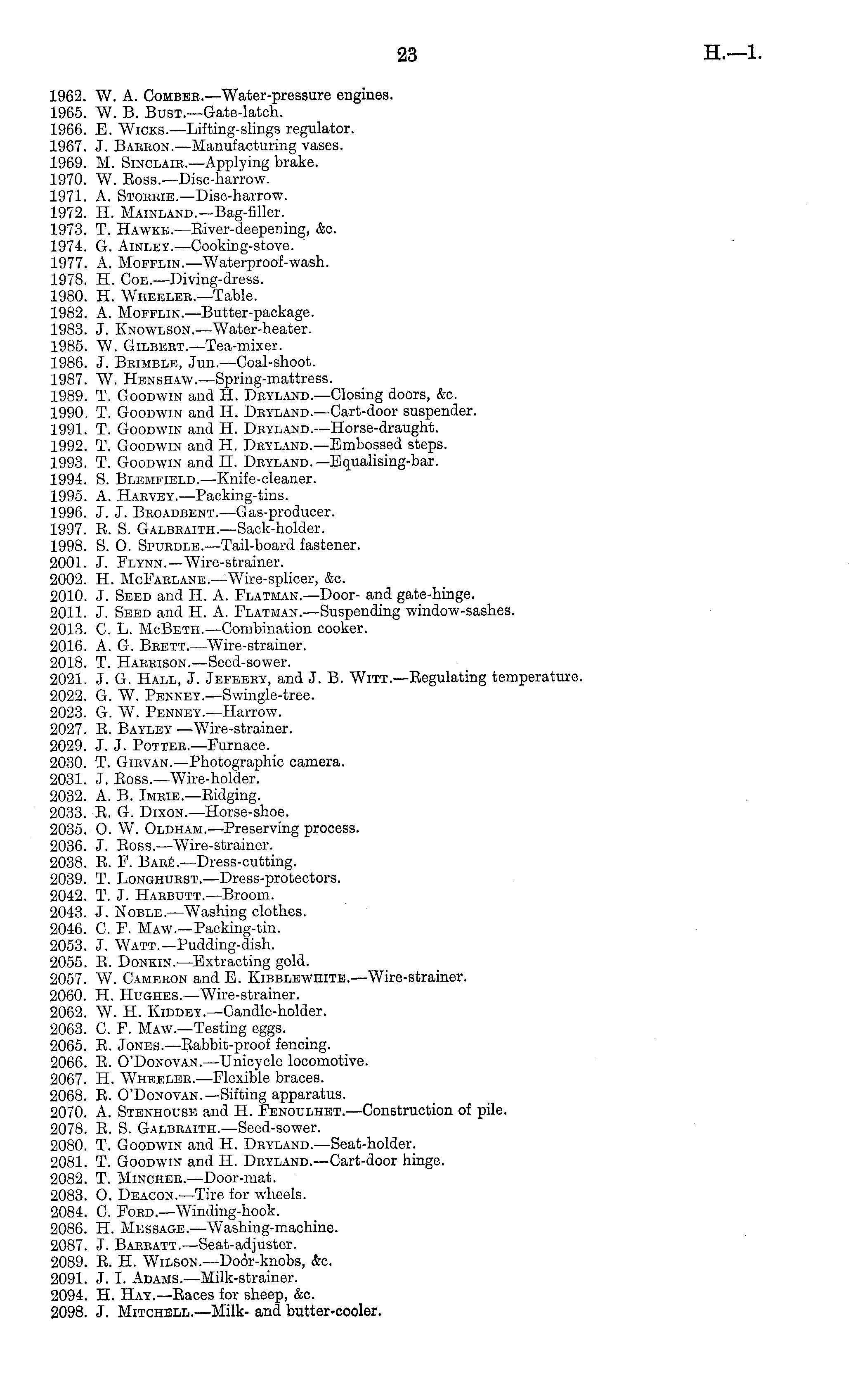 1962. W. A. Combee.—Water-pressure engines. 1965. W. B. Bust.—Gate-latch. 1966. E. Wicks.—Lifting-slings regulator. 1967. J. Baeeon. —Manufacturing vases. 1969. M. Sinclair. —Applying brake. 1970. W. Eoss.—Disc-harrow. 1971. A. Stoeeie.—Disc-harrow. 1972. H. Mainland.—Bag-filler. 1973. T. Hawke. —Eiver-deepening, &c. 1974. G. Ainley.—Cooking-stove. 1977. A. Mofflin. —Waterproof-wash. 1978. H. Coe.—Diving-dress. 1980. H. Wheelee.—Table. 1982. A. Mofflin.—Butter-package. 1983. J. Knowlson.—Water-heater. 1985. W. Gilbeet.—Tea-mixer. 1986. J. Beimble, Jun. —Coal-shoot. 1987. W. Henshaw. —Spring-mattress. 1989. T. Goodwin and H. Deyland.—Closing doors, &c. 1990. T. Goodwin and H. Dryland.—Cart-door suspender. 1991. T. Goodwin and H. Deyland.—Horse-draught. 1992. T. Goodwin and H. Deyland.—Embossed steps. 1993. T. Goodwin and H. Deyland.—Equalising-bar. 1994. S. Blemfield. —Knife-cleaner. 1995. A. Haevey.—Packing-tins. 1996. J. J. Beoadbent. —Gas-producer. 1997. E. S. Galbeaith.—Sack-holder. 1998. S. 0. Spuedle.—Tail-board fastener. 2001. J. Flynn.—Wire-strainer. 2002. H. McFaelane.—Wire-splicer, &c. 2010. J. Seed and H. A. Flatman.—Door- and gate-hinge. 2011. J. Seed and H. A. Flatman.—Suspending window-sashes. 2013. C. L. Mcßeth.—Combination cooker. 2016. A. G. Beett. —Wire-strainer. 2018. T. Haeeison.—Seed-sower. 2021. J. G. Hall, J. Jefeeey, and J. B. Witt.—Eegulating temperature. 2022. G. W. Penney.—Swingle-tree. 2023. G. W. Penney.—Harrow. 2027. E. Bayley —Wire-strainer. 2029. J. J. Pottee. —Furnace. 2030. T. Gievan.—Photographic camera. 2031. J. Eoss.—Wire-holder. 2032. A. B. Imeie.—Eidging. 2033. E. G. Dixon. —Horse-shoe. 2035. O. W. Oldham. —Preserving process. 2036. J. Eoss. —Wire-strainer. 2038. E. F. Baee.—Dress-cutting. 2039. T. Longhubst.—Dress-protectors. 2042. T. J. Haebutt. —Broom. 2043. J. Noble. —Washing clothes. 2046. C. F. Maw.—Packing-tin. 2053. J. Watt.—Pudding-dish. 2055. E. Donkin. —Extracting gold. 2057. W. Cameeon and E. Kibblewhite. —Wire-strainer. 2060. H. Hughes.—Wire-strainer. 2062. W. H. Kiddey.—Candle-holder. 2063. C. F. Maw.—Testing eggs. 2065. E. Jones. —Eabbit-proof fencing. 2066. E. O'Donovan. —Unicycle locomotive. 2067. H. Wheelee. —Flexible braces. 2068. E. O'Donovan.—Sifting apparatus. 2070. A. Stenhouse and H. Fenoulhet. —Construction of pile. 2078. E. S. Galbeaith. —Seed-sower. 2080. T. Goodwin and H. Deyland.—Seat-holder. 2081. T. Goodwin and H. Deyland.—Cart-door hinge. 2082. T. Minchee.—Door-mat. 2083. O. Deacon.—Tire for wheels. 2084. C. Foed.—Winding-hook. 2086. H. Message.—Washing-machine. 2087. J. Baeeatt.—Seat-adjuster. 2089. E. H. Wilson. —Door-knobs, &c. 2091. J. I. Adams.—Milk-strainer. 2094. H. Hay.—Eaces for sheep, &c. 2098. J. Mitchell.—Milk- and butter-cooler.