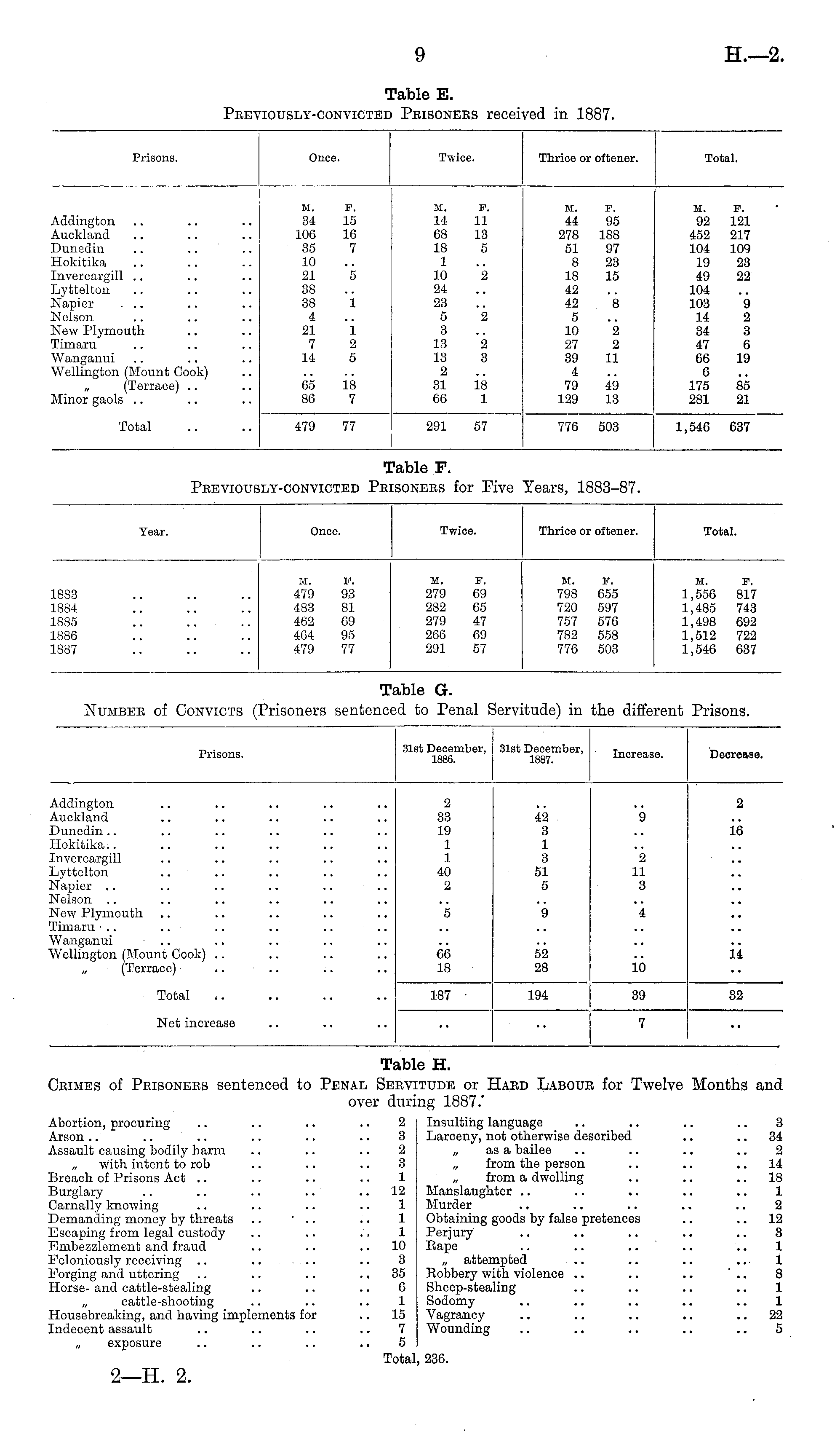 Table H. Crimes of Prisoners sentenced to Penal Servitude or Hard Labour for Twelve Months and over during 1887.