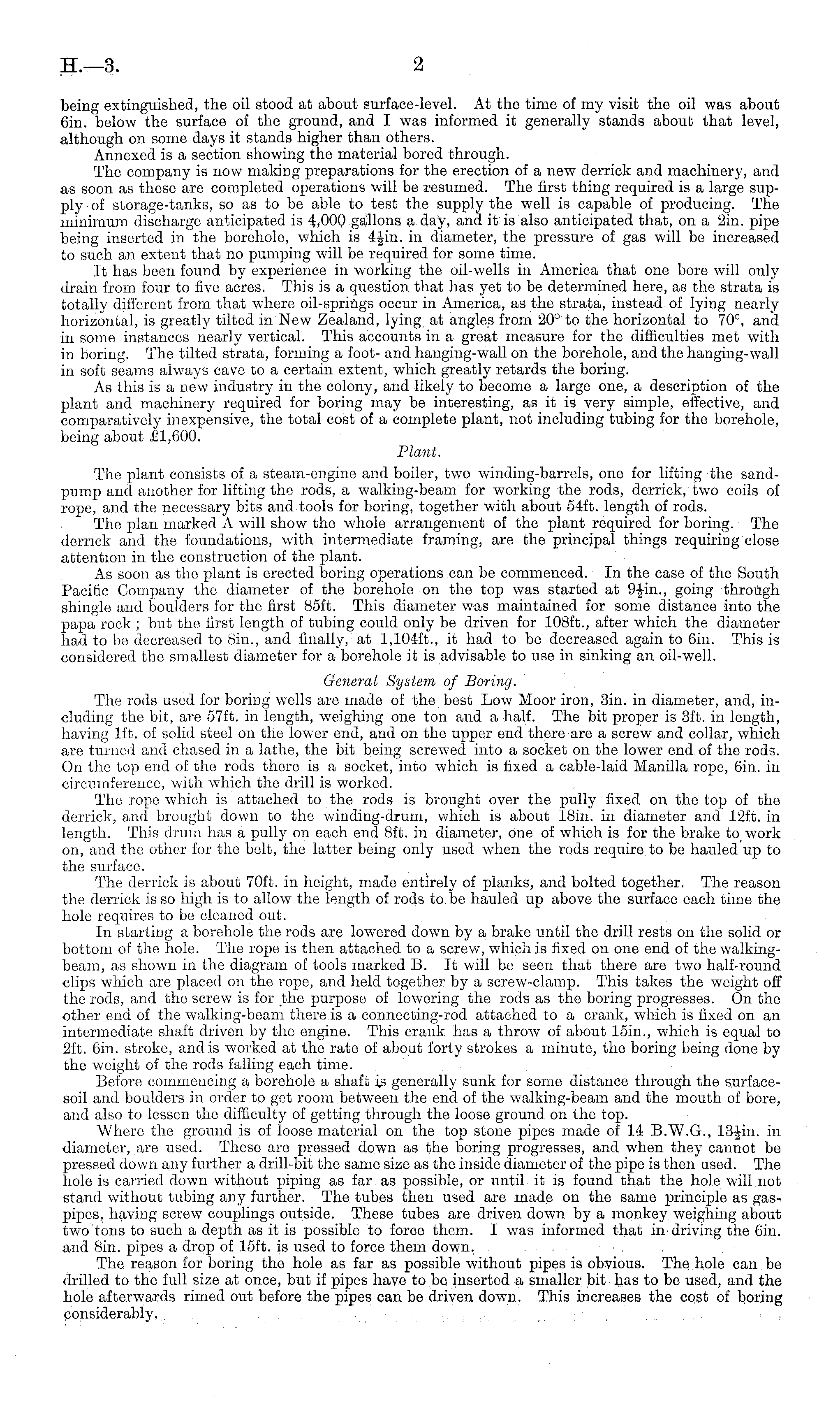 being extinguished, the oil stood at about surface-level. At the time of my visit the oil was about 6in. below the surface of the ground, and I was informed it generally stands about that level, although on some days it stands higher than others. Annexed is a section showing the material bored through. The company is now making preparations for the erection of a new derrick and machinery, and as soon as these are completed operations will be resumed. The first thing required is a large supply ■of storage-tanks, so as to be able to test the supply the well is capable of producing. The minimum discharge anticipated is 4,000 gallons a day, and it is also anticipated that, on a 2in. pipe being inserted in the borehole, which is 4-Jin. in diameter, the pressure of gas will be increased to such an extent that no pumping will be required for some time. It has been found by experience in working the oil-wells in America that one bore will only drain from four to five acres. This is a question that has yet to be determined here, as the strata is totally different from that where oil-springs occur in America, as the strata, instead of lying nearly horizontal, is greatly tilted in New Zealand, lying at angles from 20° to the horizontal to 70 c, and. in some instances nearly vertical. This accounts in a great measure, for the difficulties met with in boring. The tilted strata, forming a foot- and hanging-wall on the borehole, and the hanging-wall in soft seams always cave to a certain extent, which greatly retards the boring. As this is a new industry in the colony, and likely to become a large one, a description of the plant and machinery required for boring may be interesting, as it is very simple, effective, and comparatively inexpensive, the total cost of a complete plant, not including tubing for the borehole, being about £1,600. Plant. The plant consists of a steam-engine and boiler, two winding-barrels, one for lifting the sandpump and another for lifting the rods, a walking-beam for working the rods, derrick, two coils of rope, and the necessary bits and tools for boring, together with about 54ft. length of rods. The plan marked A will show the whole arrangement of the plant required for boring. The derrick and the foundations, with intermediate framing, are the principal things requiring close attention in the construction of the plant. As soon as the plant is erected boring operations can be commenced. In the case of the South Pacific Company the diameter of the borehole on the top was started at 9-J-in., going through shingle and boulders for the first 85ft. This diameter was maintained for some distance into the papa rock ; but the first length of tubing could only be driven for 108 ft., after which the diameter had to be decreased to Bin., and finally, at 1,104 ft., it had to be decreased again to 6iu. This is considered the smallest diameter for a borehole it is advisable to use in sinking an oil-well. General System of Boring. The rods used for boring wells are made of the best Low Moor iron, 3in. in diameter, and, including the bit, are 57ft. in length, weighing one ton and a half. The bit proper is 3ft. in length, having Ift. of solid steel on the low Ter end, and on the upper end there are a screw and collar, which are turned and chased in a lathe, the bit being screwed into a socket on the lower end of the rods. On the top end of the rods there is a socket, into which is fixed a cable-laid Manilla rope, Gin. in circumference, with which the drill is worked. The rope which is attached to the rods is brought over the pully fixed on the top of the derrick, and brought down to the winding-drum, which is about 18in. in diameter and 12ft. in length. This drum has a pully on each end Bft. in diameter, one of which is for the brake to_ work on, and the other for the belt, the latter being only used when the rods require to be hauled up to the surface. The derrick is about 70ft. in height, made entirely of planks, and bolted together. The reason the derrick is so high is to allow the length of rods to be hauled up above the surface each time the hole requires to be cleaned out. In starting a borehole the rods are lowered down by a brake until the drill rests on the solid or bottom of the hole. The rope is then attached to a screw, which is fixed on one end of the walkingbeam, as shown in the diagram of tools marked B. It will be seen that there are two half-round clips which are placed on the rope, and held together by a screw-clamp. This takes the weight off the rods, and the screw is for the purpose of lowering the rods as the boring progresses. On the other end of the walking-beam there is a connecting-rod attached to a crank, which is fixed on an intermediate shaft driven by the engine. This crank has a throw of about 15in., which is equal to 2ft. 6in. stroke, and is worked at the rate of about forty strokes a minute, the boring being done by the weight of the rods falling each time. Before commencing a borehole a shaft is generally sunk for some distance through the surfacesoil and boulders in order to get room between the end of the walking-beam and the mouth of bore, and also to lessen the difficulty of getting through the loose ground on the top. Where the ground is of loose material on the top stone pipes made of 14 8.W.G., 13-J-in. in diameter, are used. These are pressed down as the boring progresses, and when they cannot bo pressed down any further a drill-bit the same size as the inside diameter of the pipe is then used. The hole is carried down without piping as far as possible, or until it is found that the hole will not stand without tubing any further. The tubes then used are made on the same principle as gas-. pipes, having screw couplings outside. These tubes are driven down by a monkey weighing about two tons to such a depth as it is possible to force them. I was informed that in driving the 6in. and Bin. pipes a drop of 15ft. is used to force them down. The reason 