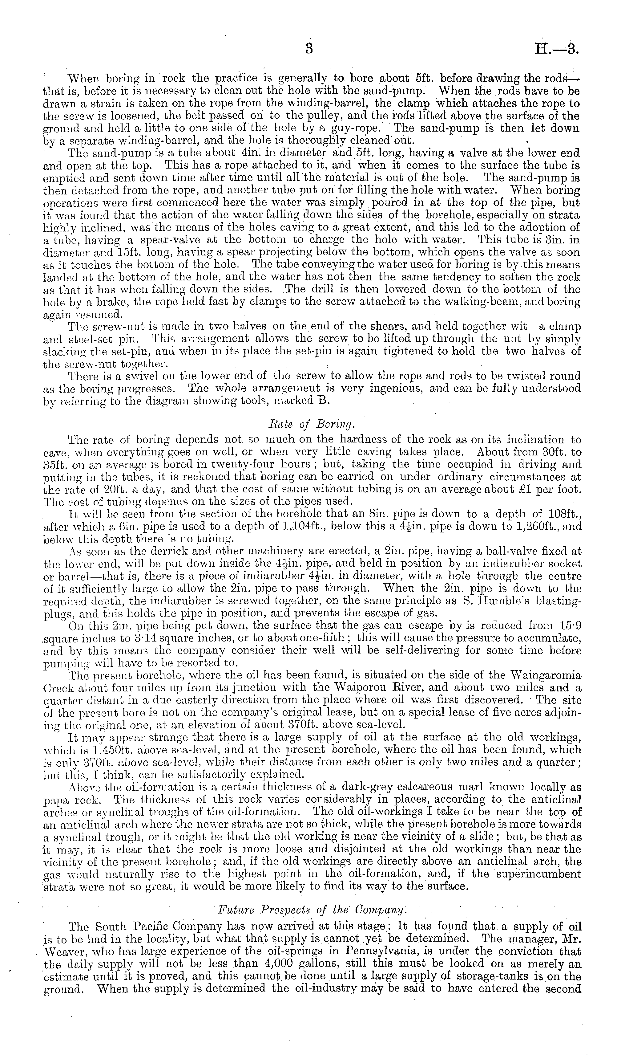 "When boring in rock the practice is generally to bore about sft. before drawing the rods— that is, before it is necessary to clean out the hole with the sand-pump. When the rods have to be drawn a strain is taken on the rope from the winding-barrel, the clamp which attaches the rope to the screw is loosened, the belt passed on to the pulley, and the rods lifted above the surface of the ground and held a little to one side of the hole by a guy-rope. The sand-pump is then let down by a separate winding-barrel, and the hole is thoroughly cleaned out. The sand-pump is a tube about 4in. in diameter and sft. long, having a valve at the lower end and open at the top. This has a rope attached to it, and when it comes to the surface the tube is emptied and sent down time after time until all the material is out of the hole. The sand-pump is then detached from the rope, and another tube put on for filling the hole with water. When boring operations were first commenced here the water was simply poured in at the top of the pipe, but it was found that the action of the water falling down the sides of the borehole, especially on strata highly inclined, was the means of the holes caving to a great extent, and this led to the adoption of a tube, having a spear-valve at the bottom to charge the hole with water. This tube is 3in. in diameter and 15ft. long, having a spear projecting below the bottom, which opens the valve as soon as it touches the bottom of the hole. The tube conveying the water used for boring is by this means landed at the bottom of the hole, and the water has not then the same tendency to soften the rock as that it has when falling down the sides. The drill is then lowered down to the bottom of the hole by a brake, the rope held fast by clamps to the screw attached to the walking-beam, and boring again resumed. The screw-nut is made in two halves on the end of the shears, and held together wit a clamp and steel-set pin. This arrangement allows the screw to be lifted up through the nut by simply slacking the set-pin, and when in its place the set-pin is again tightened to hold the two halves of the screw-nut together. There is a swivel on the low Ter end of the screw to allow the rope and rods to be twisted round as the boring progresses. The whole arrangement is very ingenious, and can be fully understood by referring to the diagram showing tools, marked B. Hate of Borimj. The rate of boring depends not so much on the hardness of the rock as on its inclination to cave, when everything goes on well, or when very little caving takes place. About from 30ft. to ,35ft. on an average is bored in twenty-four hours ; but, taking the time occupied in driving and putting in the tubes, it is reckoned that boring can be carried on under ordinary circumstances at the rate of 20ft. a day, and that the cost of same without tubing is on an average about £1 per foot. The cost of tubing depends on the sizes of the pipes used. It will be seen from the section of the borehole that an Bin. pipe is down to a depth of 108 ft., after which a 6in. pipe is used to a depth of 1,104 ft., below this a 4-iin. pipe is down to 1,260 ft., and below this depth there is no tubing. As soon as the derrick and other machinery are erected, a 2in. pipe, having a ball-valve fixed at the lower end, will be put down inside the 4J,in. pipe, and held in position by an indiarubber socket or barrel —that is, there is a piece of indiarubber 4 \m. in diameter, with a hole through the centre of it sufficiently large to allow the 2in. pipe to pass through. When the 2in. pipe is down to the required depth, the indiarubber is screwed together, on the same principle as S. Humbles blastingplugs, and this holds the pipe in position, and prevents the escape of gas. On this 2in. pipe being put down, the surface that the gas can escape by is reduced from 15-9 square incites to 3T4 square inches, or to about one-fifth ; this will cause the pressure to accumulate, and by this means the company consider their well will be self-delivering for some time before pumning will have to be resorted to. The present borehole, where the oil has been found, is situated on the side of the Waingaromia Creek about four miles up from its junction with the Waiporou Eiver, and about two miles and a quarter distant in a duo easterly direction from the place where oil was first discovered. The site of the present bore is not on the company's original lease, but on a special lease of five acres adjoining the original one, at an elevation of about 370 ft. above sea-level. It may appear strange that there is a large supply of oil at the surface at the old workings, which is 1,450 ft. above sea-level, and at the present borehole, where the oil has been found, which is only 370 ft. above sea-level, while their distance from each other is only two miles and a quarter; but this, I think, can be satisfactorily explained. Above the oil-formation is a certain thickness of a dark-grey calcareous marl known locally as papa rock. The thickness of this rock varies considerably in places, according to the anticlinal arches or synclinal troughs of the oil-formation. The old oil-workings I take to be near the top of an anticlinal arch where the newer strata are not so thick, while the present borehole is more towards a synclinal trough, or it might be that the old working is near the vicinity of a slide ; but, be that as it may, it is clear that the rock is more loose and disjointed at the old workings than near the vicinity of the present borehole; and, if the old workings are directly above an anticlinal arch, the gas would naturally rise to the highest point in the oil-formation, and, if the superincumbent strata were not so great, it would be more likely to find its way to the surface. Future Prospects of the Company. The South Pacific Company has now arrived at this stage: It has found that a supply of oil is to be had in the locality, but what that supply is cannot yet 