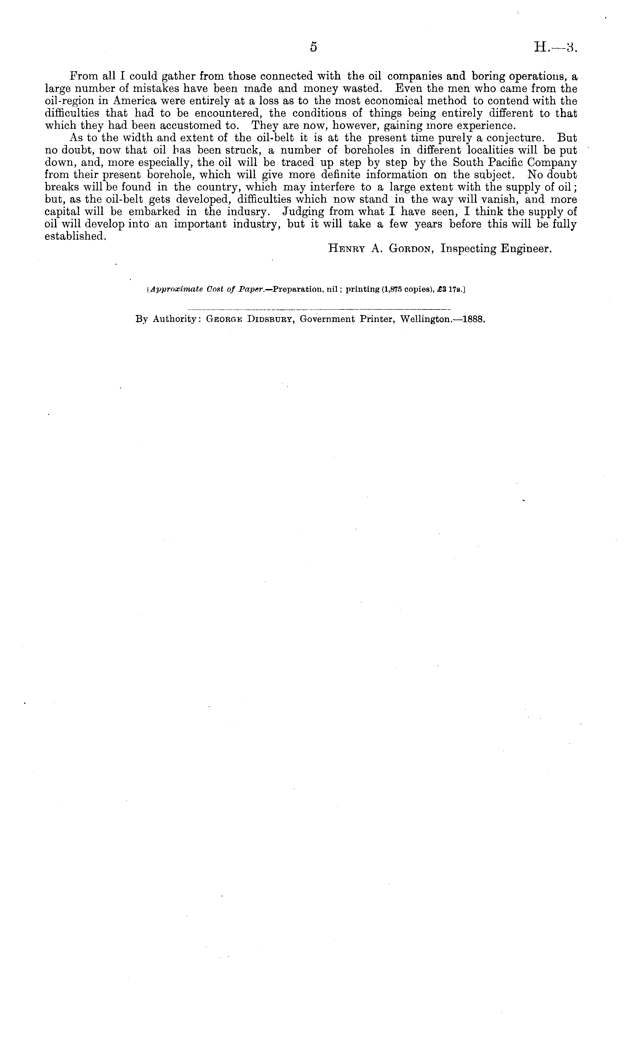 From all I could gather from those connected with the oil companies and boring operations, a large number of mistakes have been made and money wasted. Even the men who came from the oil-region in America were entirely at a loss as to the most economical method to contend with the difficulties that had to be encountered, the conditions of things being entirely different to that which they had been accustomed to. They are now, however, gaining more experience. As to the width and extent of the oil-belt it is at the present time purely a conjecture. But no doubt, now that oil has been struck, a number of boreholes in different localities will be put down, and, more especially, the oil will be traced up step by step by the South Pacific Company from their present borehole, which will give more definite information on the subject. No doubt breaks will be found in the country, which may interfere to a large extent with the supply of oil; but, as the oil-belt gets developed, difficulties which now stand in the way will vanish, and more capital will be embarked in the indusry. Judging from what I have seen, I think the supply of oil will develop into an important industry, but it will take a few years before this will be fully established. Henry A. Gordon, Inspecting Engineer. i Approximate Cost of Paper. —Preparation, nil; printing (1,875 copies), £3 178.]