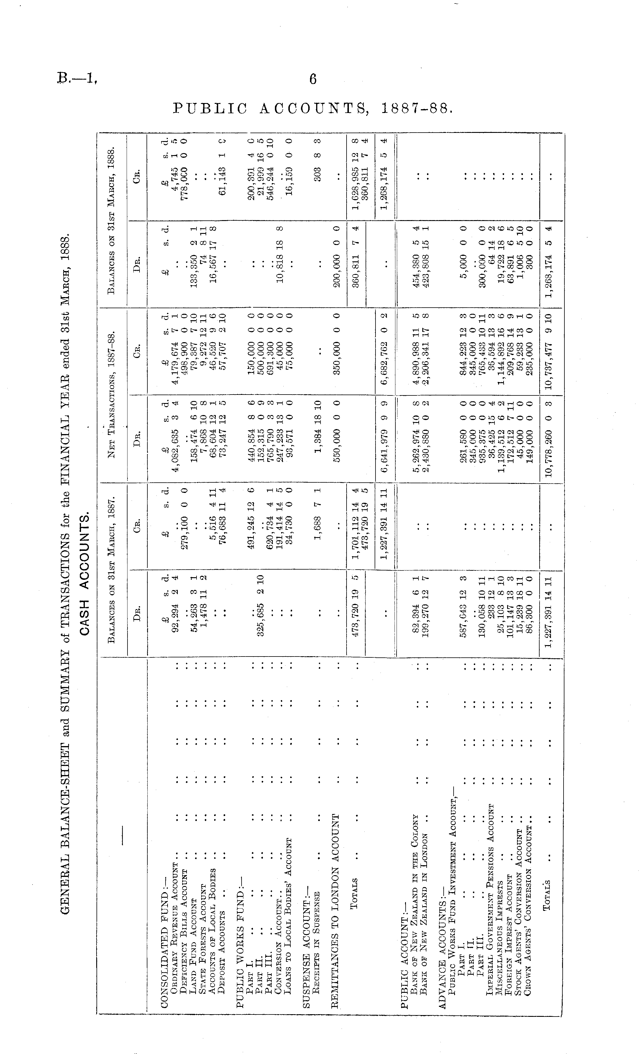 Balances on 31st Mabch, 1887. Net Transactions, 1887-88. Balances on 31st March, 1888. Dr. Or. Db. Cb. Dr. Cb. CONSOLIDATED FUND :— Ordinaby Revenue Account Deficiency Bills Account Land Fund Account State Forests Account Accounts of Local Bodies Deposit Accounts £ s. a. 92,294 2 4 £ s. a. £ s. d. 4,082,035 3 4 £ s. a. 4,179,674 7 1 498,900 0 0 79.387 7 10 9'272 12 11 46,520 9 6 57,707 2 10 £ s. a. £ s. a. 4,745 1 5 778,000 0 0 279,100 0 0 133,350 2 1 74 8 11 16,567 17 8 54,263 3 1 1,478 11 2 158,474 6 10 7,868 10 8 68,604 12 1 73,247 12 5 5,516 4 11 76,683 11 4 61,143 1 C PUBLIC WORKS FUND:— Part I. Part II. Pabt III. Conversion Account.. Loans to Local Bodies' Account 325,685 2 10 491,245 12 6 620,734 4 1 191,414 14 5 34,730 0 0 440,854 8 6 152,315 0 9 765, 790 3 3 247,233 13 1 93,571 0 0 150,000 0 0 500,000 0 0 091,300 0 0 45,000 0 0 75,000 0 0 200,391 4 0 21,999 16 5 540,244 0 10 10,818 18 8 16,159 0 0 SUSPENSE ACCOUNT:— Receipts in Suspense 1,688 7 1 1,384 18 10 303 8 3 REMITTANCES TO LONDON ACCOUNT 550,000 0 0 350,000 0 0 200,000 0 0 Totals ■473,720 19 5 , j 1,701,112 14 4 473, 720 19 5 0,641,979 9 9 6,682,762 0 2 360,811 7 4 I 1,028,985 12 8 360,811 7 4 PUBLIC ACCOUNT:— Bank op New Zealand in the Colony Bank of New Zealand in London .. .. [ 1,227,391 14 11 1,268,174 5 4 i " I ._^ _= 82,394 6 1 199,270 12 7 5,262,974 10 8 2,430,880 0 2 4,890,988 11 5 2,206,341 17 8 454,380 5 4 423,808 15 1 •• ADVANCE ACCOUNTS:— Public Works Fund Investment Account, — Part I. Past II. Pabt III. Imperial Government Pensions Account Miscellaneous Imprests Foreign Imprest Account Stock Agents' Conversion Account .. Crown Agents' Conversion Account 587,643 12 3 130,058 10 11 233 12 1 25,103 8 10 101,147 13 3 15,239 18 11 86,300 0 0 261,580 0 0 345,000 0 0 935,375 0 0 36,425 15 4 1,139,512 6 2 172,512 7 11 45,000 0 0 149,000 0 0 844,223 12 3 345,000 0 0 765,433 10 11 36,594 13 3 1,144,892 16 6 209,768 14 9 59,233 13 1 235,000 0 0 5,000 0 0 300,000 0 0 64 14 2 19,722 18 6 63,891 6 5 1,006 5 10 300 0 0 •• Totals 10,778,260 0 3 10,737,477 9 10 1,268,174 5 4 1,227,391 14 11 .-