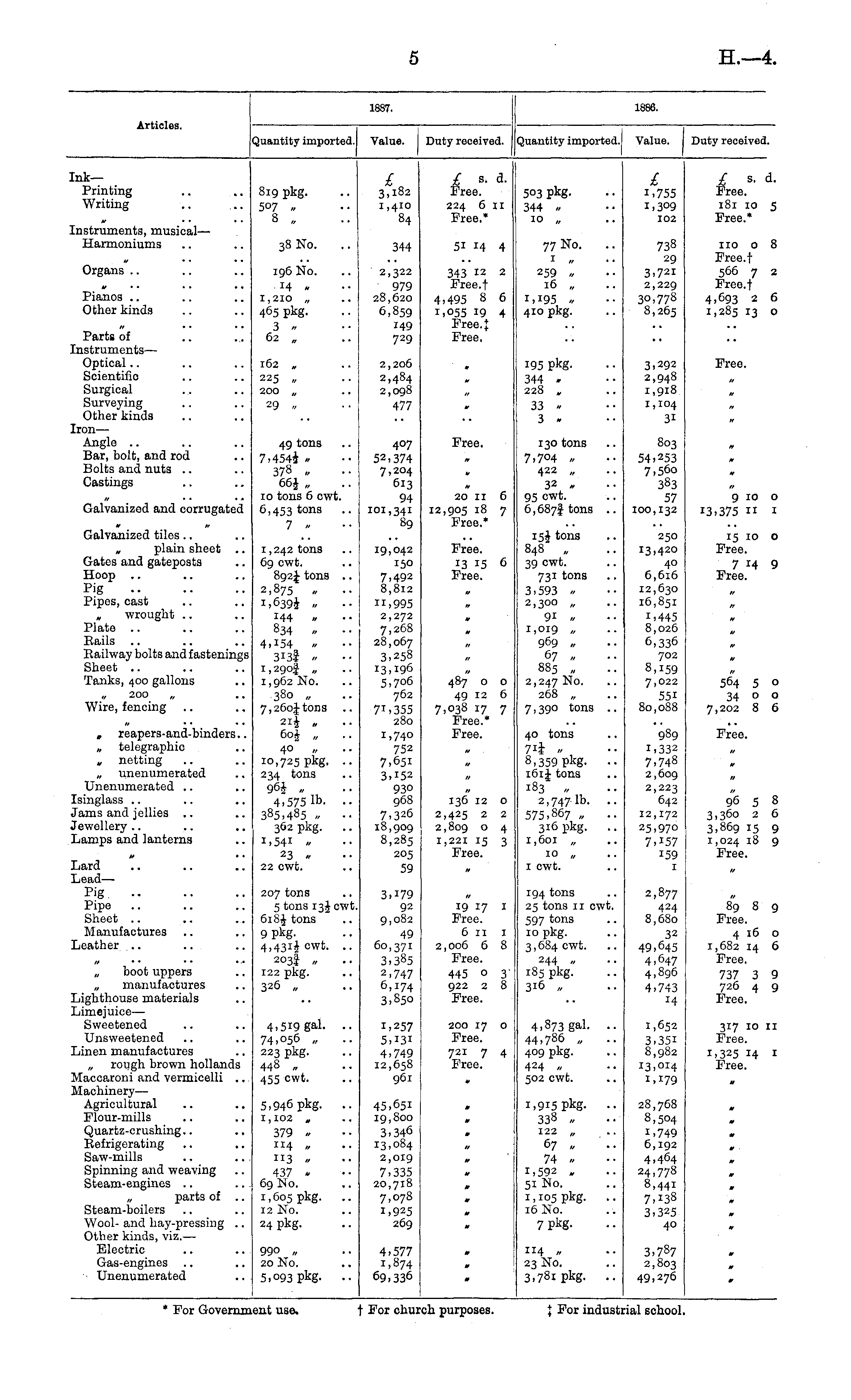 1887. 1886. Articles. Quantity imported. Value. Duty received. , Quantity imported. Value. Duty received. InkPrinting Writing 819 pkg. 507 » 8 „ £ 3.182 1,410 84 £ s. d. Free. 224 6 11 Free.* 503 pkg. 344 » 10 „ £ 1,755 1,309 102 £ *■ d. Free. 181 10 5 Free.* Instruments, musical — Harmoniums 38 No. 344 5i 14 4 77 No. 1 „ 259 „ 16 „ 1,195 „ 410 pkg. 738 29 3,721 2,229 30,778 8,265 no o 8 Free.t 566 7 2 Free.t 4,693 2 6 1,285 13 ° Organs Pianos Other kinds 196 No. 14 „ 1,210 „ 465 pkg. 3 „ 62 „ 2,322 979 28,620 6,859 149 729 343 12 2 Free.t 4,495 8 6 1,055 19 4 Free.t Free. Parts of Instruments — Optical Scientific Surgical Surveying Other kinds Iron — Angle Bar, bolt, and rod Bolts and nuts Castings 162 „ 225 „ 200 „ 29 „ 2,206 2,484 2,098 477 195 pkg. 344 - 228 , 33 - 3 » 3,292 2,948 1,918 1,104 31 Free. 49 tons 7,454i » 378 „ 66J „ 10 tons 6 cwt. 6,453 tons 7 . .. 407 52,374 7,204 613 94 101,341 89 Free. 20 11 6 12,905 18 7 Free.* 130 tons 7,704 » 422 „ 32 - 95 cwt. 6,687I tons .. 803 54,253 7,560 383 57 100,132 9 10 o 13,375 11 1 Galvanized and corrugated Galvanized tiles.. „ plain sheet .. Gates and gateposts Hoop Pig Pipes, cast „ wrought Plate .. Rails Railway bolts and fastenings Sheet .. Tanks, 400 gallons ., 200 „ Wire, fencing •■ 1,242 tons 69 cwt. 892J tons .. 2,875 „ 1,639, „ 144 » 834 „ ■ ■ 4,i54 » 3i3f _ 1,290! „ 1,962 No. 380 „ 7,26ojtons 21I „ 6o£ . .. 40 „ 10,725 pkg. .. 234 tons 96J „ 4,575 lb. .. 385,485 . ■■ 362 pkg. 1,541 „ 23 „ 22 cwt. 19,042 150 7,492 8,812 n,995 2,272 7,268 28,067 3,258 13,196 5,706 762 7i,355 280 1,740 752 7,651 3,152 930 968 7,326 18,909 8,285 205 59 Free. 13 15 6 Free. 15 J tons 848 „ 39 cwt. 731 tons 3,593 « 2,300 „ 91 „ 1,019 ,, 969 » 67 „ 885 „ 2,247 No. 268 „ 7,390 tons .. 250 13,420 40 6,616 12,630 16,851 1,445 8,026 6,336 702 8,159 71022 551 80,088 15 10 o Free. 7 14 9 Free. 487 o o 49 12 6 7,038 17 7 Free.* Free. 564 5 o 34 o o 7,202 8 6 „ reapers-and-binders.. „ telegraphic „ netting „ unenumerated Unenumerated Isinglass Jams and jellies Jewellery Lamps and lanterns 40 tons 7il . 8,359 pkg. .. i6i£ tons 183 „ 2,747 lb. 575,867 „ 316 pkg. .. 1,601 „ 10 „ .. 1 cwt. 989 1,332 7,748 2,609 2,223 642 12,172 25,970 7,157 159 1 Free. 136 12 o 2,425 2 2 2,809 o 4 1,221 15 3 Free. 96 5 8 3,360 2 6 3,869 15 9 1,024 18 9 Free. Lard Lead— Pig Pipe Sheet Manufactures Leather .. 207 tons 5 tons I3jcwt. 618 \ tons 9 pkg. 4,431J cwt. .. 203:} „ 122 pkg. 326 „ 3,i79 92 9,082 19 17 1 Free. 6 11 1 2,006 6 8 Free. 445 o 3' 922 2 8 Free. 194 tons 25 tons 11 cwt. 597 tons 10 pkg. 3,684 cwt. 244 „ 185 pkg. 316 „ 2,877 424 8,680 89 8 9 Free. 4 16 o 1,682 14 6 Free. 737 3 9 726 4 9 Free. „ boot uppers „ manufactures Lighthouse materials Limejuice— Sweetened Unsweetened Linen manufactures „ rough brown hollands Maccaroni and vermicelli .. Machinery— Agricultural Flour-mills Quartz-crushing Refrigerating Saw-mills Spinning and weaving Steam-engines .. „ parts of .. Steam-boilers Wool- and hay-pressing .. Other kinds, viz.— Electric Gas-engines Unenumerated 49 60,371 3,385 2,747 6,i74 3,850 32 49,645 4,647 4,896 4,743 H 4,519 gal. .. 74,056 „ 223 pkg. 448 , 455 cwt. 1,257 5,131 4,749 12,658 961 200 17 o Free. 721 7 4 Free. 4,873 gal. .. 44,786 „ 409 pkg. 424 » 502 cwt. 1,652 3,35i 8,982 13,014 i,i79 317 10 11 Free. 1,325 14 1 Free. * 5,946 pkg. .. 1,102 „ 379 „ 114 „ 113 „ 437 » 69 No. 1,605 pkg. 12 No. 24 pkg. 45,651 19,800 3,346 13,084 2,019 7,335 20,718 7,078 1,925 269 1,915 pkg. .. 338 . 122 „ 67 . .. 74 » 1,592 . 51 No. 1,105 pkg. 16 No. 7 Pkg28,768 8,504 i,749 6,192 4,464 24,778 8,441 7,i38 3,325 40 990 „ 20 No. 5,093 pkg. .. 4,577 1,874 69,336 114 , 23 No. 3,78i pkg. .. 3,787 2,803 49,276 * For Government use. t For church purposes. J For industrial school