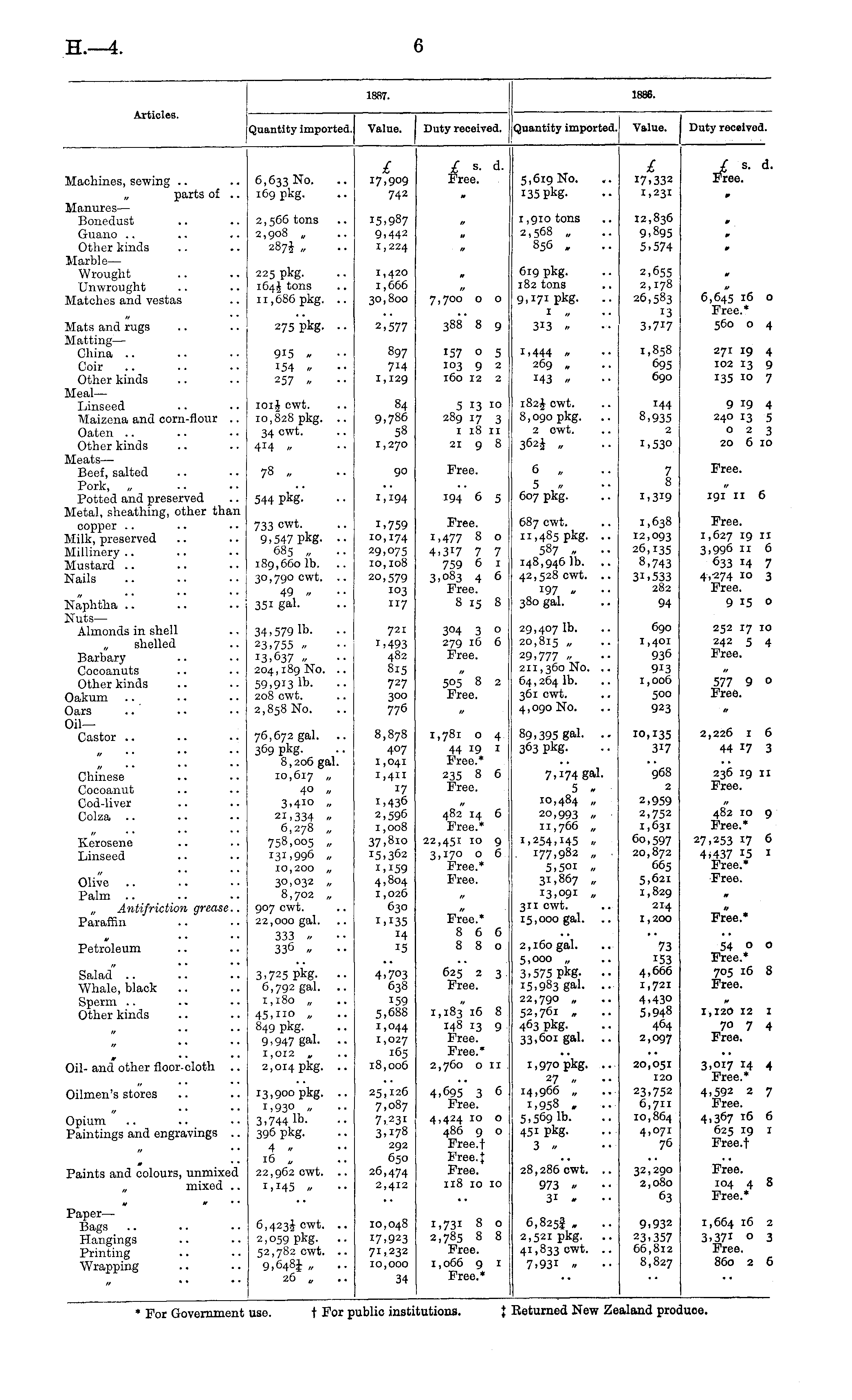 1887. 1886. :ic] Quantity imported. Value. Duty received. Value. Duty received. Quantity imported. 6,633 No. 169 pkg. £ 17,909 742 £ b. d. Free. 5,619 No. 135 pkg. £ 17,332 1,231 £ s- d. Free. Machines, sewing .. „ parts of .. & Manures — Bonedust Guano Other kinds Marble— Wrought Unwrought Matches and vestas 2,566 tons 2,908 „ 287* „ 15,987 9,442 1,224 1,910 tons 2,568 „ 856 „ 12,836 9,895 5,574 0 225 pkg. 164J tons 11,686 pkg. .. 1,420 1,666 30,800 7,700 o o 619 pkg. 182 tons 9,171 pkg. 1 „ 2,655 2,178 26,583 13 3,717 6,645 16 o Free.* 560 o 4 Mats and rugs Matting— China Coir Other kinds MealLinseed Maizena and corn-flour .. Oaten Other kinds Meats — Beef, salted Pork, „ Potted and preserved Metal, sheathing, other than copper Milk, preserved Millinery Mustard Nails 275 pkg. • • 2,577 388 8 9 313 » 915 « 154 . 257 » 897 7i4 1,129 157 o 5 103 9 2 160 12 2 i,444 » 269 „ 143 » 1,858 695 690 271 19 4 102 13 9 135 10 7 101J cwt. 10,828 pkg. .. 34 cwt. 4H . 84 9,786 58 1,270 5 13 10 289 17 3 1 18 11 21 9 8 1824 cwt. 8,090 pkg. .. 2 cwt. 3624 „ 144 8,935 2 i,53o 9 19 4 240 13 5 023 20 6 10 78 . 90 Free. 6 „ 7 8 I,3i9 Free. 544 Pkg1,194 194 6 5 5 » 607 pkg. 191 11 6 733 cwt. 9,547 Pkg. •• 685 , 189,660 lb. 30,790 cwt. 49 . 351 gal. 1,759 10,174 29,075 10,108 20,579 103 "7 Free. i,477 8 0 4,3i7 7 7 759 6 1 3,083 4 6 Free. 8 15 8 687 cwt. 11,485 pkg. .. 587 „ ■■ 148,946 lb. 42,528 cwt. .. 197 » 380 gal. 1,638 12,093 26,135 8,743 31,533 282 94 Free. 1,627 19 11 3,996 11 6 633 14 7 4,274 10 3 Free. 9 15 o Naphtha NutsAlmonds in shell „ shelled Barbary Cocoanuts Other kinds Oakum Oars OilCastor 34,579 lb. 23,755 „ 13,637 " 204,189 No. .. 59,9i3lb. 208 cwt. 2,858 No. 721 1,493 482 815 727 300 776 304 3 o 279 16 6 Free. 505 8 2 Free. 29,4071b. 20,815 „ 29,777 » 211,360 No. .. 64,2641b. 361 cwt. 4,090 No. 690 1,401 936 913 1,006 500 923 252 17 10 242 5 4 Free. 577 9 o Free. 76,672 gal. 369 Pkg8,206 gal. 10,617 „ 40 „ 3,410 » 2i,334 » 6,278 „ 758,005 „ 131,996 „ 10,200 „ 30,032 „ 8,702 „ 907 cwt. 22,000 gal. 333 » 336 „ 8,878 407 1,041 1,411 17 i,436 2,596 1,008 37,8io 15,362 i,i59 4,804 1,026 630 1,135 14 15 1,781 o 4 44 19 1 Free.* 235 8 6 Free. 89,395 gal. •• 363 pkg. 10,135 317 2,226 1 6 44 17 3 Chinese Cocoanut Cod-liver Colza Kerosene Linseed 482 14 6 Free.* 22,451 10 9 3,170 o 6 Free.* Free. 7,174 gal. 5 , 10,484 „ 20,993 ■■ 11,766 „ 1,254,145 „ 177,982 „ 5,50i „ 31,867 „ 13,091 „ 311 cwt. 15,000 gal. '968 2 2,959 2,752 1,631 6o,597 20,872 665 5,621 1,829 214 1,200 236 19 11 Free. 482 10 9 Free.* 27,253 17 6 4,437 15 1 Free.* Free. Olive .. Palm .. „ Antifriction grease.. Paraffin Free.* 8 6 6 880 73 153 4,666 1,721 4,430 5,948 464 2,097 Free.* 54 o o Free.* 705 16 8 Free. Petroleum 2,160 gal. 5,000 „ 3,575 pkg. .. 15,983 gal. .. 22,790 „ 52,761 „ 463 pkg. 33,601 gal. .. Salad Whale, black Sperm Other kinds 3,725 pkg. .. 6,792 gal. 1,180 „ 45,110 „ 849 pkg. 9,947 gal. .. 1,012 „ 2,014 pkg. •• 4,703 638 159 5,688 1,044 1,027 165 18,006 625 2 3 Free. 1,183" 16 8 148 13 9 Free. Free.* 2,760 on 1,120 12 1 70 7 4 Free. it ' * Oil- and other floor-cloth .. Oilmen's stores 13,900 pkg. .. 1,930 „ 3,744 lb. 396 pkg. 25,126 7,087 7,231 3,178 292 650 26,474 2,412 4,695 3 6 Free. 4,424 10 o 486 9 o Free.t Free. J Free. 118 10 10 1,970 pkg. .. 27 „ 14,966 „ 1,958 , 5,5691b. 45i pkg. 3 » 20,051 120 23,752 6,711 10,864 4,o7i 76 3,017 14 4 Free.* 4,592 2 7 Free. 4,367 16 6 625 19 1 Free.t Opium Paintings and engravings .. Paints and colours, unmixed „ mixed .. 4 „ 16 „ 22,962 cwt. .. 1,145 „ 28,286 cwt. .. 973 » 31 . 32,290 2,080 63 Froe. 104 4 8 Free.* Paper— Bags Hangings Printing Wrapping 6,423^ cwt. .. 2,059 pkg. •• 52,782 cwt. .. 9,6 4 8i„ •• 26 „ 10,048 17,923 71,232 10,000 34 1,731 8 o 2,785 8 8 Free. 1,066 9 1 Free.* 6,825s, ■• 2,521 pkg. .. 41,833 cwt. .. 7,93i „ 9,932 23,357 66,812 8,827 1,664 16 2 3,37i o 3 Free. 860 2 6 * For Government use. t For public institutions. } Returned New Zealand produce.