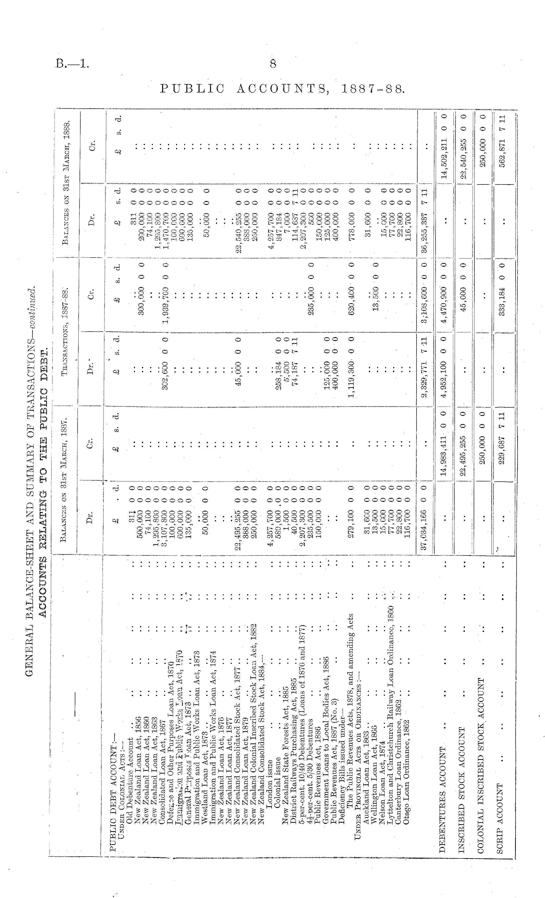 Balances on 31st Makch, 1887. Teansactions, 1887-88: Balances on 31st Maech, 1888. 1 I nI Dr. Dr. Cr. r*w Dr.Cr. Dr. Cr. PUBLIC DEBT ACCOUNT:— Under Colonial Acts :— Old Debenture Account .. New Zealand Loan Act, 1S5G New Zealand Loan Act, 1880 New Zealand Loan Act, 1863 Consolidated Loam Act, 1867 Defense and Other Purposes Loan Act, 1870 ISKttigrabicn and Public W?rks Loan Act, 1970 General Pv.rpc-siS T:oan Act, 1873 ,, ,, VV ', ' Immigration and Public Works Loan Act, 1873 Westland Loan Act, 1873 Immigration and Public Works Loan Act, 1874 New Zealand Loan Act, 1876 New Zealand Loan Act, 1877 New Zealand Consolidated Stock Act, 1877 New Zealand Loan Act, 1879 New Zealand Colonial Inscribed Stock Loan Act, 1882 New Zealand Consolidated Stock Act, 1884, — London issue Colonial issue New Zealand State Forests Act, 1885 District Railways Purchasing Act, 1885 5-per-cent. 10/40 Debentures (Loans of 1870 and 1877) 4J-per-eent. 5/30 Debentures Public Revenues Act, 1886 Government Loans to Local Bodies Act, 1886 Public Revenues Act, 1887 (No. 3) Deficiency Bills issued under — The Public Revenues Acts, 1878, and amending Acts Ukdeb Peoyincial Acts op, Okdinances :— Auckland Loan Act, 1863 Wellington Loan Act, 1866 Nelson Loan Act, 1874 Lyttelton and Christchurch Railway Loan Ordinance, 1860 .. Canterbury Loan Ordinance, 1862 .. Otago Loan Ordinance, 1862 i • ■ j . . I i £ . a. I 311 0 0 500,000 0 0 74,100 0 0 1,295,800 0 0 3, 107, SCO 0 0 100, 0C0 0 0 i 600, 0C0 0 0 135,000 0 0 { 50,000 0 0 22,495,255 0 0 388,000 0 0 ; 250,000 0 0 4,257,700 0 0 589,000 ,0 0 1,500 0 0 ; 40,500 0 0 | j 2,207,800 0 0 235,500 0 0 150,000 0 0 279,100 0 0 31.600 0 0 13,500 0 0 15,000 0 0 i 77,700 0 0 22,800 0 0 ! 116,700 0 0 i j 37,034,166 0 0 j £ i s. a. i ■ £ s. a. • • 302,000 0 0 45,000 0 0 258,184 0 0 I S, 500 0 0 74,187 7 11 £ s. d. 300,000 0 0 1,939,700 0 0 i I 235,000 0 0 & s. d. 311 0 0 200,000 0 0 74,100 0 0 1,295,800 0 0 1,470,700 0 0 100,000 0 0 600,000 0 0 135,000 0 0 50,000 0 0 22,540,255 0 0 388,000 0 0 250,000 0 0 4,257,700 0 0 ! 847.184 0 0 ; 7^000 0 0 i 114,687 7 11 2,207,300 0 0 500 0 0 150,000 0 0 125,000 0 0 400,000 0 0 | & s. a. •■ 125,000 0 0 400,000 0 0 I 1,119, SCO' 0 0 620,400 0 0 j 778,000 0 0 .. 13,500 0 0 31,600 0 0 ! 15,000 0 0 1 77.700 0 0 22,800 0 0 116.700 0 0 j ; 2,329,771 7 11 3,108,600 0 0 : 36,255,337 7 11 DEBENTURES ACCOUNT - | 14,981 14,983,411 0 0 4,952,100 0 0 53,411 0 0 4,470.900 0 0 14,502,211 0 0 INSCRIBED STOCK ACCOUNT 22,49i 22,495,255 0 0 j (5,255 0 0 ! 45,000 0 0 22,540,255 0 0 COLONIAL INSCRIBED STOCK ACCOUNT .. "I 25( 250,000 0 0 10,000 0 0 i 250,000 0 0 SCRIP ACCOUNT 22! 229,087 7 11 !9,087 7 11 I 333,184 0 0 562,871 7 11