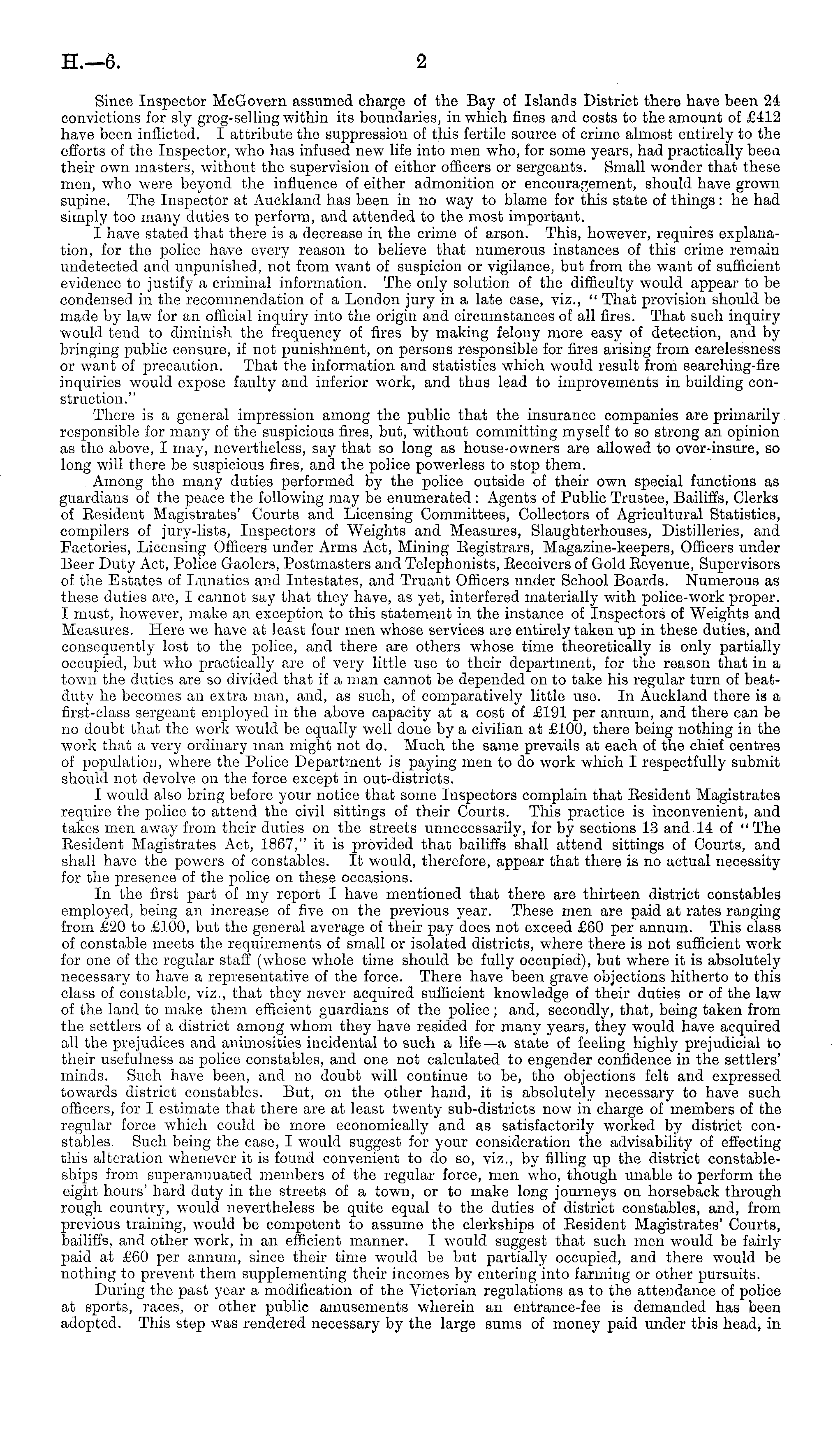 Since Inspector McGovern assumed charge of the Bay of Islands District there have been 24 convictions for sly grog-selling within its boundaries, in which fines and costs to the amount of £412 have been inflicted. I attribute the suppression of this fertile source of crime almost entirely to the efforts of the Inspector, who has infused new life into men who, for some years, had practically beea their own masters, without the supervision of either officers or sergeants. Small wonder that these men, who were beyond the influence of either admonition or encouragement, should have grown supine. The Inspector at Auckland has been in no way to blame for this state of things: he had simply too many duties to perform, and attended to the most important. I have stated that there is a decrease in the crime of arson. This, however, requires explanation, for the police have every reason to believe that numerous instances of this crime remain undetected and unpunished, not from want of suspicion or vigilance, but from the want of sufficient evidence to justify a criminal information. The only solution of the difficulty would appear to be condensed in the recommendation of a London jury in a late case, viz., " That provision should be made by law for an official inquiry into the origin and circumstances of all fires. That such inquiry would tend to diminish the frequency of fires by making felony more easy of detection, and by bringing public censure, if not punishment, on persons responsible for fires arising from carelessness or want of precaution. That the information and statistics which would result from searching-fire inquiries would expose faulty and inferior work, and thus lead to improvements in building construction." There is a general impression among the public that the insurance companies are primarily responsible for many of the suspicious fires, but, without committing myself to so strong an opinion as the above, I may, nevertheless, say that so long as house-owners are allowed to over-insure, so long will there be suspicious fires, and the police powerless to stop them. Among the many duties performed by the police outside of their own special functions as guardians of the peace the following may be enumerated : Agents of Public Trustee, Bailiffs, Clerks of Eesident Magistrates' Courts and Licensing Committees, Collectors of Agricultural Statistics, compilers of jury-lists, Inspectors of Weights and Measures, Slaughterhouses, Distilleries, and Factories, Licensing Officers under Arms Act, Mining Registrars, Magazine-keepers, Officers under Beer Duty Act, Police Gaolers, Postmasters and Telephonists, Receivers of Gold Revenue, Supervisors of the Estates of Lunatics and Intestates, and Truant Officers under School Boards. Numerous as these duties are, I cannot say that they have, as yet, interfered materially with police-work proper. I must, however, make an exception to this statement in the instance of Inspectors of Weights and Measures. Here we have at least four men whose services are entirely taken up in these duties, and consequently lost to the police, and there are others whose time theoretically is only partially occupied, but who practically are of very little use to their department, for the reason that in a town the duties are so divided that if a man cannot be depended on to take his regular turn of beatduty lie becomes an extra man, and, as such, of comparatively little use. In Auckland there is a first-class sergeant employed in the above capacity at a cost of £191 per annum, and there can be no doubt that the work would be equally well done by a civilian at £100, there being nothing in the work that a very ordinary man might not do. Much the same prevails at each of the chief centres of population, where the Police Department is paying men to do work which I respectfully submit should not devolve on the force except in out-districts. I would also bring before your notice that some Inspectors complain that Resident Magistrates require the police to attend the civil sittings of their Courts. This practice is inconvenient, and takes men away from their duties on the streets unnecessarily, for by sections 13 and 14 of " The Resident Magistrates Act, 1867," it is provided that bailiffs shall attend sittings of Courts, and shall have the powers of constables. It would, therefore, appear that there is no actual necessity for the presence of the police on these occasions. In the first part of my report I have mentioned that there are thirteen district constables employed, being an increase of five on the previous year. These men are paid at rates ranging from £20 to £100, but the general average of their pay does not exceed £60 per annum. This class of constable meets the requirements of small or isolated districts, where there is not sufficient work for one of the regular staff (whose whole time should be fully occupied), but where it is absolutely necessary to have a representative of the force. There have been grave objections hitherto to this class of constable, viz., that they never acquired sufficient knowledge of their duties or of the law of the land to make them efficient guardians of the police; and, secondly, that, being taken from the settlers of a district among whom they have resided for many years, they would have acquired all the prejudices and animosities incidental to such a life—a state of feeling highly prejudicial to their usefulness as police constables, and one not calculated to engender confidence in the settlers' minds. Such have been, and no doubt will continue to be, the objections felt and expressed towards district constables. But, on the other hand, it is absolutely necessary to have such officers, for I estimate that there are at least twenty sub-districts now in charge of members of the regular force which could be more economically and as satisfactorily worked by district constables. Such being the case, I would suggest for your consider