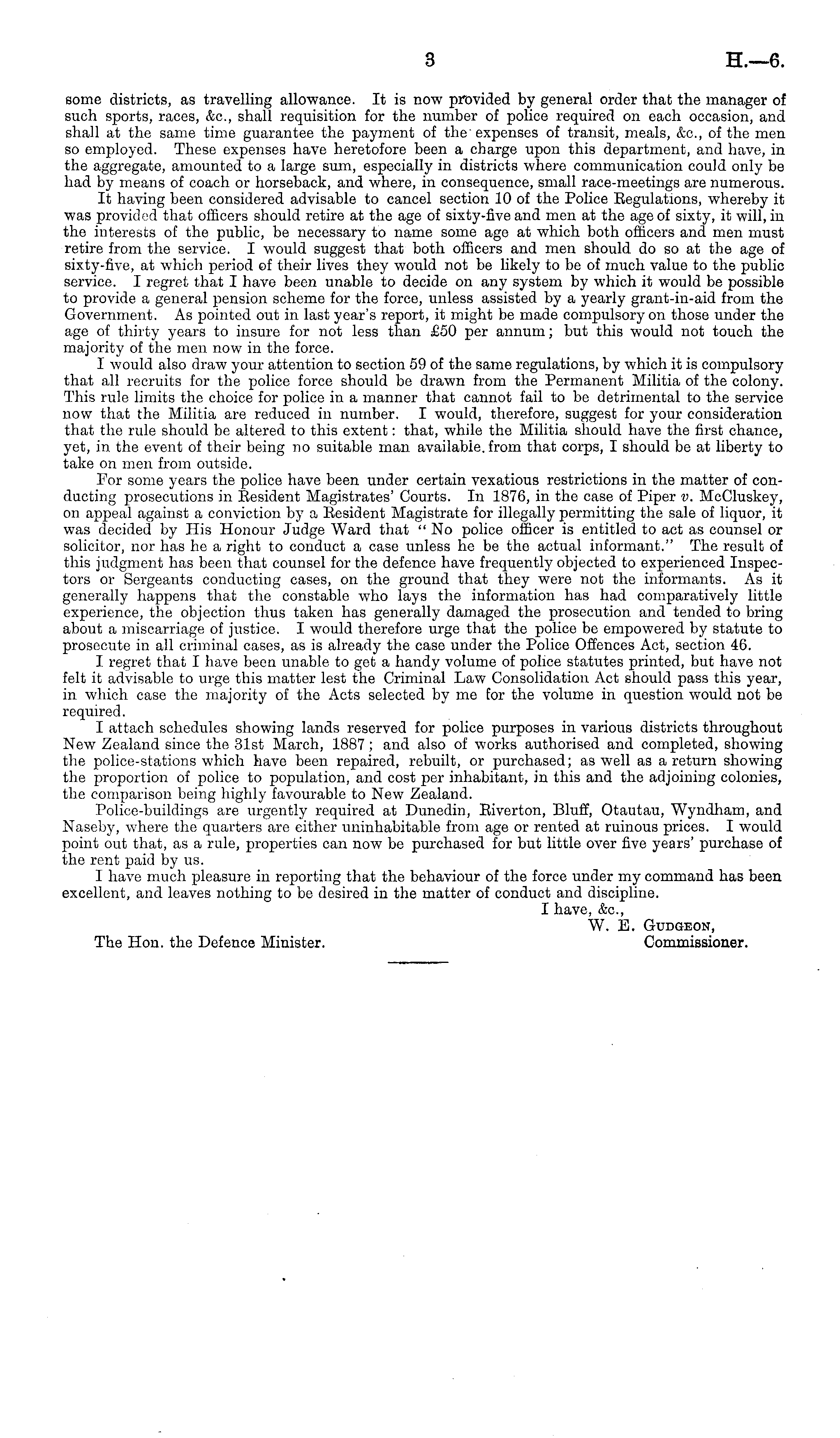 some districts, as travelling allowance. It is now provided by general order that the manager of such sports, races, &c, shall requisition for the number of police required on each occasion, and shall at the same time guarantee the payment of the'expenses of transit, meals, &c., of the men so employed. These expenses have heretofore been a charge upon this department, and have, in the aggregate, amounted to a large sum, especially in districts where communication could only be had by means of coach or horseback, and where, in consequence, small race-meetings are numerous. It having been considered advisable to cancel section 10 of the Police Regulations, whereby it was provided that officers should retire at the age of sixty-five and men at the age of sixty, it will, in the interests of the public, be necessary to name some age at which both oflicers and men must retire from the service. I would suggest that both officers and men should do so at the age of sixty-five, at which period of their lives they would not be likely to be of much value to the public service. I regret that I have been unable to decide on any system by which it would be possible to provide a general pension scheme for the force, unless assisted by a yearly grant-in-aid from the Government. As pointed out in last year's report, it might be made compulsory on those under the age of thirty years to insure for not less than £50 per annum; but this would not touch the majority of the men now in the force. I would also draw your attention to section 59 of the same regulations, by which it is compulsory that all recruits for the police force should be drawn from the Permanent Militia of the colony. This rule limits the choice for police in a manner that cannot fail to be detrimental to the service now that the Militia are reduced in number. I would, therefore, suggest for your consideration that the rule should be altered to this extent: that, while the Militia should have the first chance, yet, in the event of their being no suitable man available, from that corps, I should be at liberty to take on men from outside. For some years the police have been under certain vexatious restrictions in the matter of conducting prosecutions in Resident Magistrates' Courts. In 1876, in the case of Piper v. McCluskey, on appeal against a conviction by a Resident Magistrate for illegally permitting the sale of liquor, it was decided by His Honour Judge Ward that " No police officer is entitled to act as counsel or solicitor, nor has he a right to conduct a case unless he be the actual informant." The result of this judgment has been that counsel for the defence have frequently objected to experienced Inspectors or Sergeants conducting cases, on the ground that they were not the informants. As it generally happens that the constable who lays the information has had comparatively little experience, the objection thus taken has generally damaged the prosecution and tended to bring about a miscarriage of justice. I would therefore urge that the police be empowered by statute to prosecute in all criminal cases, as is already the case under the Police Offences Act, section 46. I regret that I have been unable to get a handy volume of police statutes printed, but have not felt it advisable to urge this matter lest the Criminal Law Consolidation Act should pass this year, in which case the majority of the Acts selected by me for the volume in question would not be required. I attach schedules showing lands reserved for police purposes in various districts throughout New Zealand since the 31st March, 1887 ; and also of works authorised and completed, showing the police-stations which have been repaired, rebuilt, or purchased; as well as a return showing the proportion of police to population, and cost per inhabitant, in this and the adjoining colonies, the comparison being highly favourable to New Zealand. Police-buildings are urgently required at Dunedin, Riverton, Bluff, Otautau, Wyndham, and Naseby, where the quarters are either uninhabitable from age or rented at ruinous prices. I would point out that, as a rule, properties can now be purchased for but little over five years' purchase of the rent paid by us. I have much pleasure in reporting that the behaviour of the force under my command has been excellent, and leaves nothing to be desired in the matter of conduct and discipline. I have, &c, W. E. Gudgeon, The Hon. the Defence Minister. Commissioner.