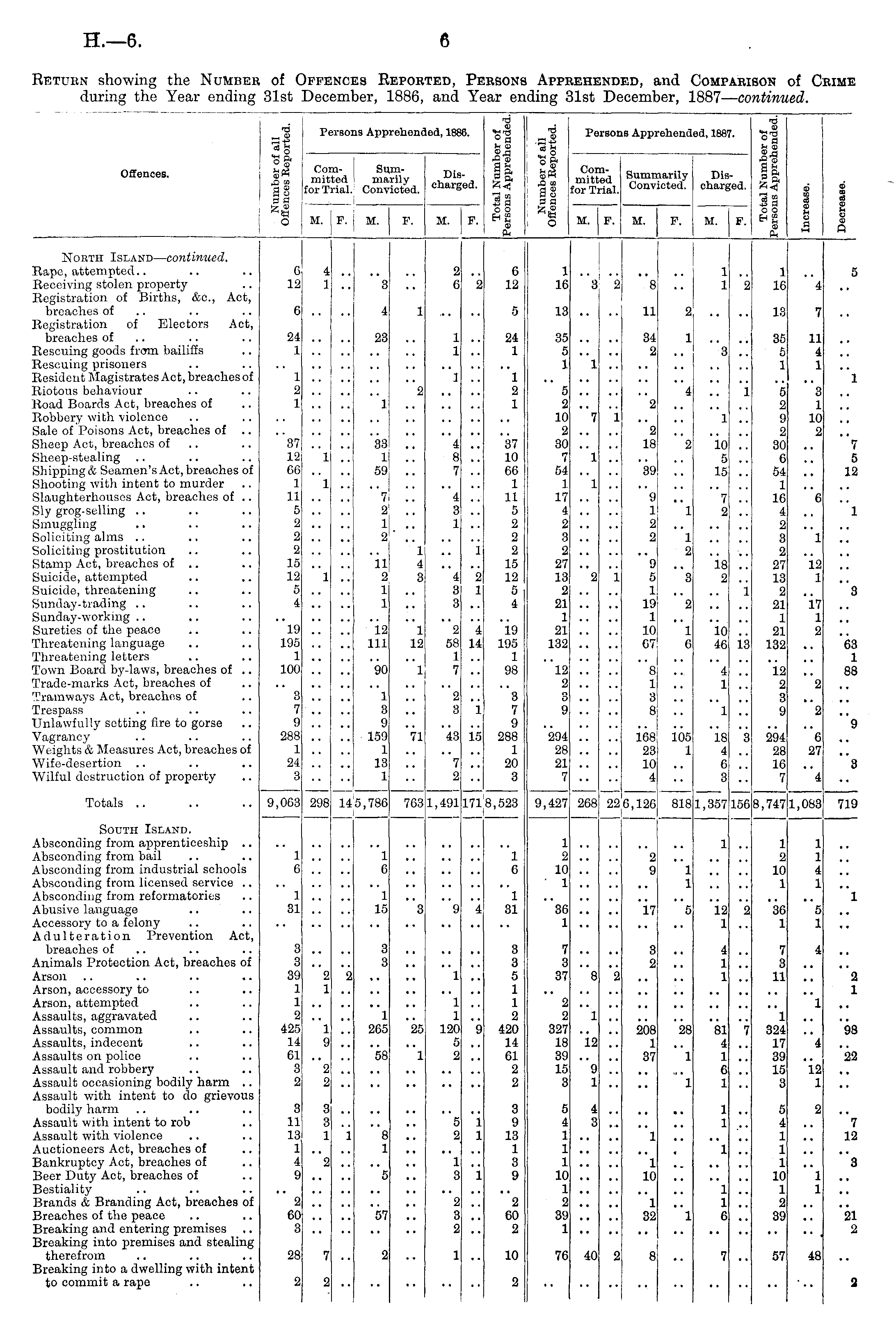 Return showing the Number of Offences Reported, Persons Apprehended, and Comparison of Crime during the Year ending 31st December, 1886, and Year ending 31st December, 1887 — continued.