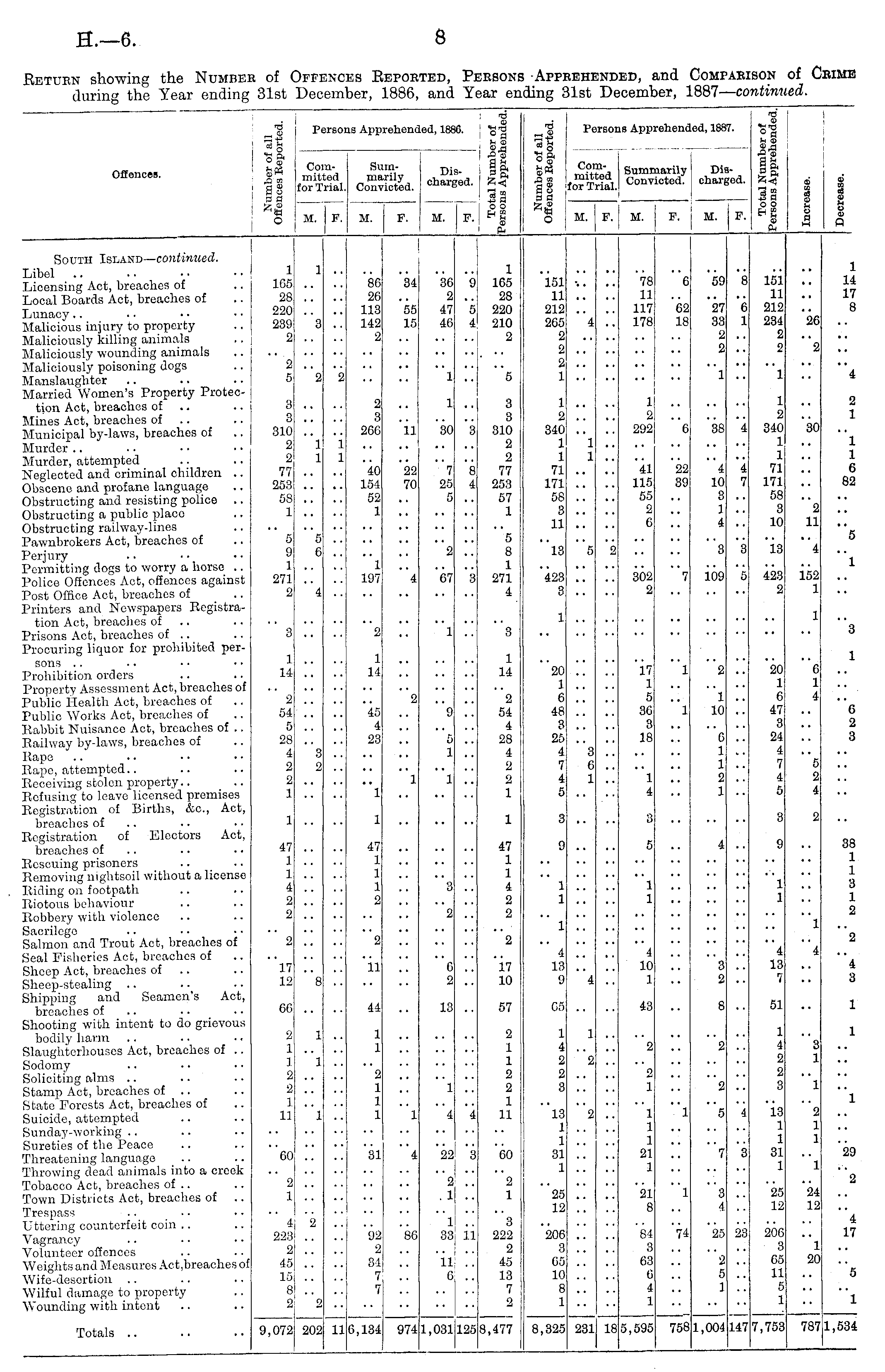 Return showing the Number of Offences Reported, Persons Apprehended, and Comparison of Crime during the Year ending 31st December, 1886, and Year ending 31st December, 1887— continued.