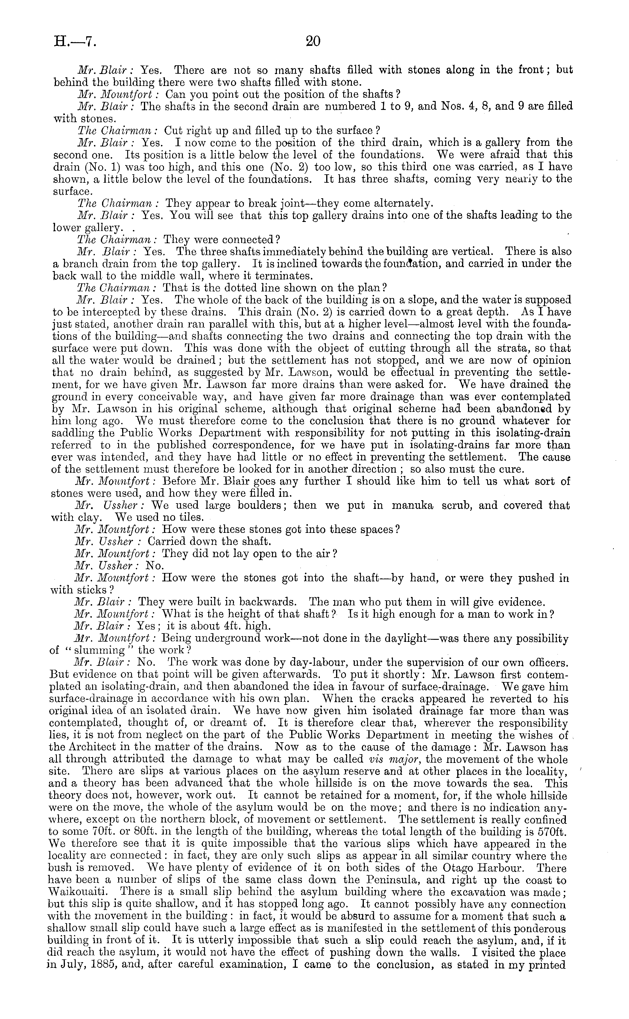 Mr. Blair: Yes. There are not so many shafts filled with stones along in the front; but behind the building there were two shafts filled with stone. Mr. Mountfort: Can you point out the position of the shafts ? Mr. Blair : The shafts in the second drain are numbered 1 to 9, and Nos. 4, 8, and 9 are filled with stones. The Chairman : Cut right up and filled up to the surface ? Mr. Blair : Yes. I now come to the position of the third drain, which is a gallery from the second one. Its position is a little below the level of the foundations. We were afraid that this drain (No. 1) was too high, and this one (No. 2) too low, so this third one was carried, as I have shown, a little below the level of the foundations. It has three shafts, coming very nearly to the surface. The Chairman : They appear to break joint —they come alternately. Mr. Blair : Yes. You will see that this top gallery drains into one of the shafts leading to the lower gallery. . The Chairman : They were connected ? Mr. Blair : Yes. The three shafts immediately behind the building are vertical. There is also a branch drain from the top gallery. It is inclined towards the foundation, and carried in under the back wall to the middle wall, where it terminates. The Chairman : That is the dotted line shown on the plan ? Mr. Blair : Yes. The whole of the back of the building is on a slope, and the water is supposed to be intercepted by these drains. This drain (No. 2) is carried down to a great depth. As I have just stated, another drain ran parallel with this, but at a higher level—almost level with the foundations of the building —and shafts connecting the two drains and connecting the top drain with the surface were put down. This was done with the object of cutting through all the strata, so that all the water would be drained ; but the settlement has not stopped, and we are now of opinion that no drain behind, as suggested by Mr. Lawson, would be effectual in preventing the settlement, for we have given Mr. Lawson far more drains than were asked for. We have drained the ground in every conceivable way, and have given far more drainage than was ever contemplated by Mr. Lawson in his original scheme, although that original scheme had been abandoned by him long ago. We must therefore come to the conclusion that there is no ground whatever for saddling the Public Works Department with responsibility for not putting in this isolating-drain referred to in the published correspondence, for we have put in isolating-drains far more than ever was intended, and they have had little or no effect in preventing the settlement. The cause of the settlement must therefore be looked for in another direction ; so also must the cure. Mr. Mountfort: Before Mr. Blair goes any further I should like him to tell us what sort of stones were used, and how they were filled in. Mr. Ussher: We used large boulders; then we put in manuka scrub, and covered that with clay. We used no tiles. Mr. Mountfort: How were these stones got into these spaces ? Mr. Ussher : Carried down the shaft. Mr. Mountfort: They did not lay open to the air ? Mr. Ussher: No. Mr. Mountfort: How were the stones got into the shaft—by hand, or were they pushed in with sticks ? Mr. Blair : They were built in backwards. The man who put them in will give evidence. Mr. Mountfort: What is the height of that shaft ? Is it high enough for a man to work in? Mr. Blair : Yes ; it is about 4ft. high. 31r. Mountfort: Being underground work—not done in the daylight—was there any possibility of " slumming " the work? Mr. Blair : No. The work was done by day-labour, under the supervision of our own officers. But evidence on that point will be given afterwards. To put it shortly : Mr. Lawson first contemplated an isolating-drain, and then abandoned the idea in favour of surface-drainage. We gave him surface-drainage in accordance with his own plan. When the cracks appeared he reverted to his original idea of an isolated drain. We have now given him isolated drainage far more than was contemplated, thought of, or dreamt of. It is therefore clear that, wherever the responsibility lies, it is not from neglect on the part of the Public Works Department in meeting the wishes of the Architect in the matter of the drains. Now as to the cause of the damage : Mr. Lawson has all through attributed the damage to what may be called via major, the movement of the whole site. There are slips at various places on the asylum reserve and at other places in the locality, and a theory has been advanced that the whole hillside is on the move towards the sea. This theory does not, however, work out. It cannot be retained for a moment, for, if the whole hillside were on the move, the whole of the asylum would be on the move; and there is no indication anywhere, except on the northern block, of movement or settlement. The settlement is really confined to some 70ft. or 80ft. in the length of the building, whereas the total length of the building is 570ft. We therefore see that it is quite impossible that the various slips which have appeared in the locality are connected : in fact, they are only such slips as appear in all similar country where the bush is removed. We have plenty of evidence of it on both sides of the Otago Harbour. There have been a number of slips of the same class down the Peninsula, and right up the coast to Waikouaiti. There is a small slip behind the asylum building where the excavation was made; but this slip is quite shallow, and it has stopped long ago. It cannot possibly have any connection with the movement in the building : in fact, it would be absurd to assume for a moment that such a shallow small slip could have such a large effect as is manifested in the settlement of this ponderous building in front of it. It is utterly impossible that such a slip could reach the asylum, and, if it did reach the asylum, it would not have the effect of pushing down the walls. I visited the place in