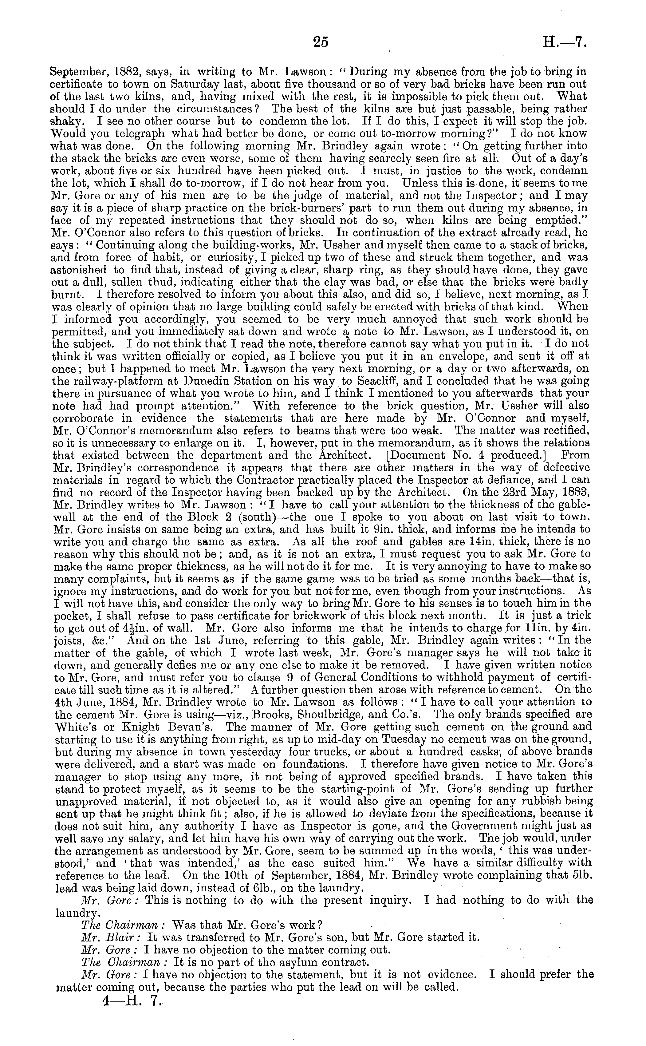 September, 1882, says, in writing to Mr. Lawson : " During my absence from the job to bring in certificate to town on Saturday last, about five thousand or so of very bad bricks have been run out of the last two kilns, and, having mixed with the rest, it is impossible to pick them out. What should Ido under the circumstances ? The best of the kilns are but just passable, being rather shaky. I see no other course but to condemn the lot. If I do this, I expect it will stop the job. Would you telegraph what had better be done, or come out to-morrow morning?" Ido not know what was done. On the following morning Mr. Brindley again wrote: "On getting further into the stack the bricks are even worse, some of them having scarcely seen fire at all. Out of a day's work, about five or six hundred have been picked out. I must, in justice to the work, condemn the lot, which I shall do to-morrow, if Ido not hear from you. Unless this is done, it seems tome Mr. Gore or any of his men are to be the judge of material, and not the Inspector ; and I may say it is a piece of sharp practice on the brick-burners' part to run them out during my absence, in face of my repeated instructions that they should not do so, when kilns are being emptied." Mr. O'Connor also refers to this question of bricks. In continuation of the extract already read, he says: " Continuing along the building-works, Mr. Ussher and myself then came to a stack of bricks, and from force of habit, or curiosity, I picked up two of these and struck them together, and was astonished to find that, instead of giving a clear, sharp ring, as they should have done, they gave out a dull, sullen thud, indicating either that the clay was bad, or else that the bricks were badly burnt. I therefore resolved to inform you about this also, and did so, I believe, next morning, as I was clearly of opinion that no large building could safely be erected with bricks of that kind. When I informed you accordingly, you seemed to be very much annoyed that such work should be permitted, and you immediately sat down and wrote a note to Mr. Lawson, as I understood it, on the subject. Ido not think that I read the note, therefore cannot say what you put in it. Ido not think it was written officially or copied, as I believe you put it in an envelope, and sent it off at once; but I happened to meet Mr. Lawson the very next morning, or a day or two afterwards, on the railway-platform at Dunedin Station on his way to Seacliff, and I concluded that he was going there in pursuance of what you wrote to him, and I think I mentioned to you afterwards that your note had had prompt attention." With reference to the brick question, Mr. Ussher will also corroborate in evidence the statements that are here made by Mr. O'Connor and myself, Mr. O'Connor's memorandum also refers to beams that were too weak. The matter was rectified, so it is unnecessary to enlarge on it. I, however, put in the memorandum, as it shows the relations that existed between the department and the Architect. [Document No. 4 produced.] From Mr. Brindley's correspondence it appears that there are other matters in the way of defective materials in regard to which the Contractor practically placed the Inspector at defiance, and I can find no record of the Inspector having been backed up by the Architect. On the 23rd May, 1883, Mr. Brindley writes to Mr. Lawson : "I have to call your attention to the thickness of the gablewall at the end of the Block 2 (south)—the one I spoke to you about on last visit to town. Mr. Gore insists on same being an extra, and has built it 9in. thick, and informs me he intends to write you and charge the same as extra. As all the roof and gables are 14in. thick, there is no reason why this should not be; and, as it is not an extra, I must request you to ask Mr. Gore to make the same proper thickness, as he will not do it for me. It is very annoying to have to make so many complaints, but it seems as if the same game was to be tried as some months back —that is, ignore my instructions, and do work for you but not for me, even though from your instructions. As I will not have this, and consider the only way to bring Mr. Gore to his senses is to touch him in the pocket, I shall refuse to pass certificate for brickwork of this block next month. It is just a trick to get out of 4^in. of wall. Mr. Gore also informs me that he intends to charge for llin. by 4in. joists, &c." And on the Ist June, referring to this gable, Mr. Brindley again writes :" In the matter of the gable, of which I wrote last week, Mr. Gore's manager says he will not take it down, and generally defies me or any one else to make it be removed. I have given written notice to Mr. Gore, and must refer you to clause 9 of General Conditions to withhold payment of certificate till such time as it is altered." A further question then arose with reference to cement. On the 4th June, 1884, Mr. Brindley wrote to Mr. Lawson as follows : "I have to call your attention to the cement Mr. Gore is using—viz., Brooks, Shoulbridge, and Co.'s. The only brands specified are White's or Knight Bevan's. The manner of Mr. Gore getting such cement on the ground and starting to use it is anything from right, as up to mid-day on Tuesday no cement was on the ground, but during my absence in town yesterday four trucks, or about a hundred casks, of above brands were delivered, and a start was made on foundations. I therefore have given notice to Mr. Gore's manager to stop using any more, it not being of approved specified brands. I have taken this stand to protect myself, as it seems to be the starting-point of Mr. Gore's sending up further unapproved material, if not objected to, as it would also give an opening for any rubbish being sent up that he might think fit; also, if he is allowed to deviate from the specifications, because it does not suit him, any authority I have as Inspector is gone, and the Government might just as well save my sal
