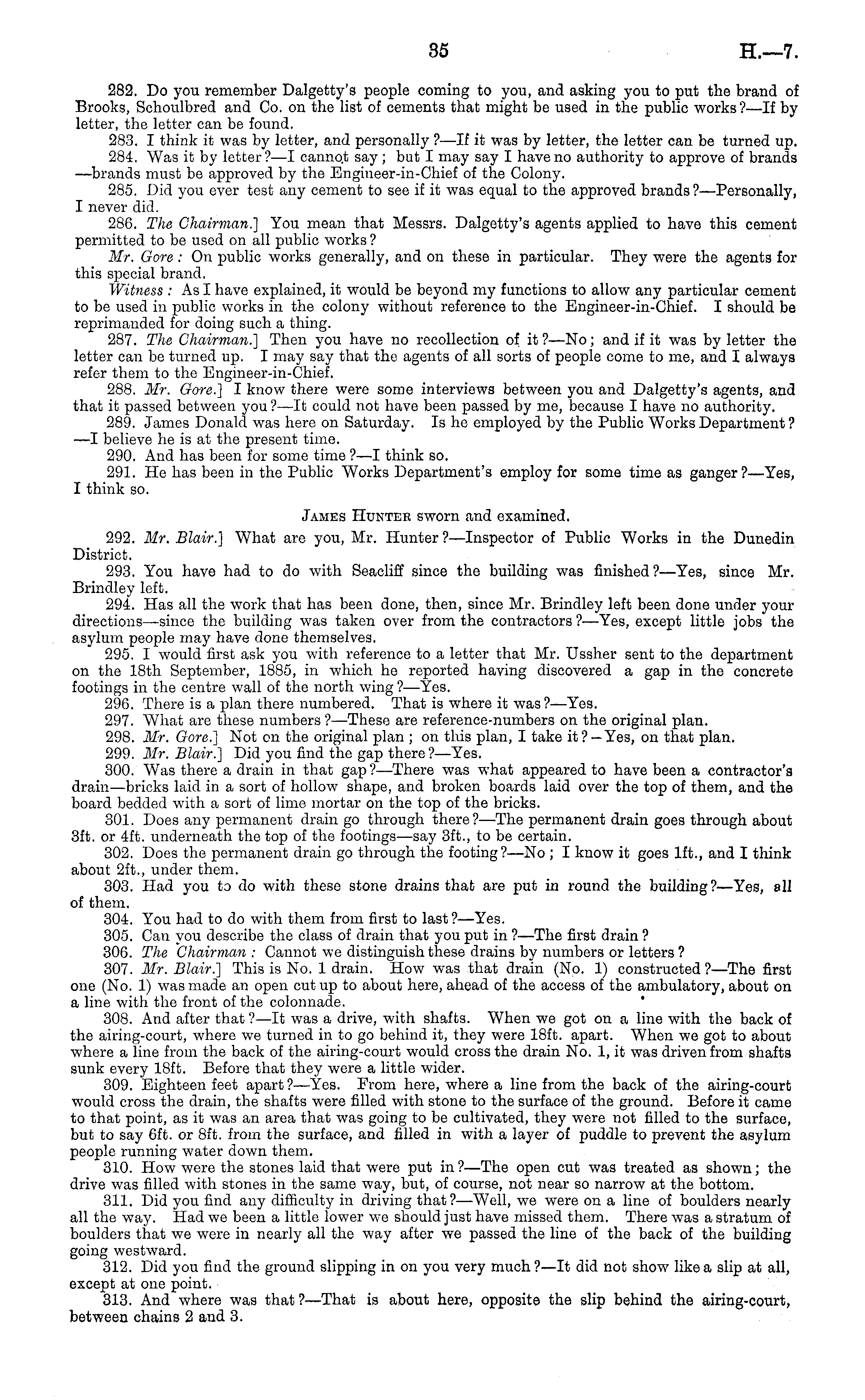 282. Do you remember Dalgetty's people coming to you, and asking you to put the brand of Brooks, Schoulbred and Co. on the list of cements that might be used in the public works?—lf by letter, the letter can be found. 283. I think it was by letter, and personally ?—lf it was by letter, the letter can be turned up. 284. Was it by letter ?—I cannot say ; but I may say I have no authority to approve of brands —brands must be approved by the Engineer-in-Chief of the Colony. 285. Did you ever test any cement to see if it was equal to the approved brands?— Personally, I never did. 286. The Chairman.'] You mean that Messrs. Dalgetty's agents applied to have this cement permitted to be used on all public works ? Mr. Gore: On public works generally, and on these in particular. They were the agents for this special brand. Witness : As I have explained, it would be beyond my functions to allow any particular cement to be used in public works in the colony without reference to the Engineer-in-Chief. I should be reprimanded for doing such a thing. 287. The Chairman.'] Then you have no recollection of it ?—No; and if it was by letter the letter can be turned up. I may say that the agents of all sorts of people come to me, and I always refer them to the Engineer-in-Chief. 288. Mr. Gore.] I know there were some interviews between you and Dalgetty's agents, and that it passed between you ? —lt could not have been passed by me, because I have no authority. 289. James Donald was here on Saturday. Is he employed by the Public Works Department ? —I believe he is at the present time. 290. And has been for some time ?—I think so. 291. He has been in the Public Works Department's employ for some time as ganger?— Yes, I think so. James Huntee sworn and examined. 292. Mr. Blair.] What are you, Mr. Hunter ?—lnspector of Public Works in the Dunedin District. 293. You have had to do with Seacliff since the building was finished?— Yes, since Mr. Brindley left. 294. Has all the work that has been done, then, since Mr. Brindley left been done under your directions—since the building was taken over from the contractors ?—Yes, except little jobs the asylum people may have done themselves. 295. I would first ask you with reference to a letter that Mr. Ussher sent to the department on the 18th September, 1885, in which he reported having discovered a gap in the concrete footings in the centre wall of the north wing ?—Yes. 296. There is a plan there numbered. That is where it was?— Yes. 297. What are these numbers ? —These are reference-numbers on the original plan. 298. Mr. Gore.] Not on the original plan ; on this plan, I take it?— Yes, on that plan. 299. Mr. Blair.] Did you find the gap there ?—Yes. 300. Was there a drain in that gap ?—There was what appeared to have been a contractor's drain—bricks laid in a sort of hollow shape, and broken boards laid over the top of them, and the board bedded with a sort of lime mortar on the top of the bricks. 301. Does any permanent drain go through there?— The permanent drain goes through about 3ft. or 4ft. underneath the top of the footings—say 3ft., to be certain. 302. Does the permanent drain go through the footing?—No ; I know it goes lft., and I think about 2ft., under them. 303. Had you to do with these stone drains that are put in round the building?— Yes, all of them. 304. You had to do with them from first to last?— Yes. 305. Can you describe the class of drain that you put in ?—The first drain ? 306. The "Chairman : Cannot we distinguish these drains by numbers or letters ? 307. Mr. Blair.] This is No. 1 drain. How was that drain (No. 1) constructed ?—The first one (No. 1) was made an open cut up to about here, ahead of the access of the ambulatory, about on a line with the front of the colonnade. 308. And after that ?—lt was a drive, with shafts. When we got on a line with the back of the airing-court, where we turned in to go behind it, they were 18ft. apart. When we got to about where a line from the back of the airing-court would cross the drain No. 1, it was driven from shafts sunk every 18ft. Before that they were a little wider. 309. Eighteen feet apart ?—Yes. From here, where a line from the back of the airing-court would cross the drain, the shafts were filled with stone to the surface of the ground. Before it came to that point, as it was an area that was going to be cultivated, they were not filled to the surface, but to say 6ft. or Bft. from the surface, and filled in with a layer of puddle to prevent the asylum people running water down them. 310. How were the stones laid that were put in ?—The open cut was treated as shown; the drive was filled with stones in the same way, but, of course, not near so narrow at the bottom. 311. Did you find any difficulty in driving that?— Well, w Te were on a line of boulders nearly all the way. Had we been a little lower we should just have missed them. There was a stratum of boulders that we were in nearly all the way after we passed the line of the back of the building going westward. 312. Did you find the ground slipping in on you very much ?—lt did not show like a slip at all, except at one point. 313. And where was that ?—That is about here, opposite the slip behind the airing-court, between chains 2 and 3.