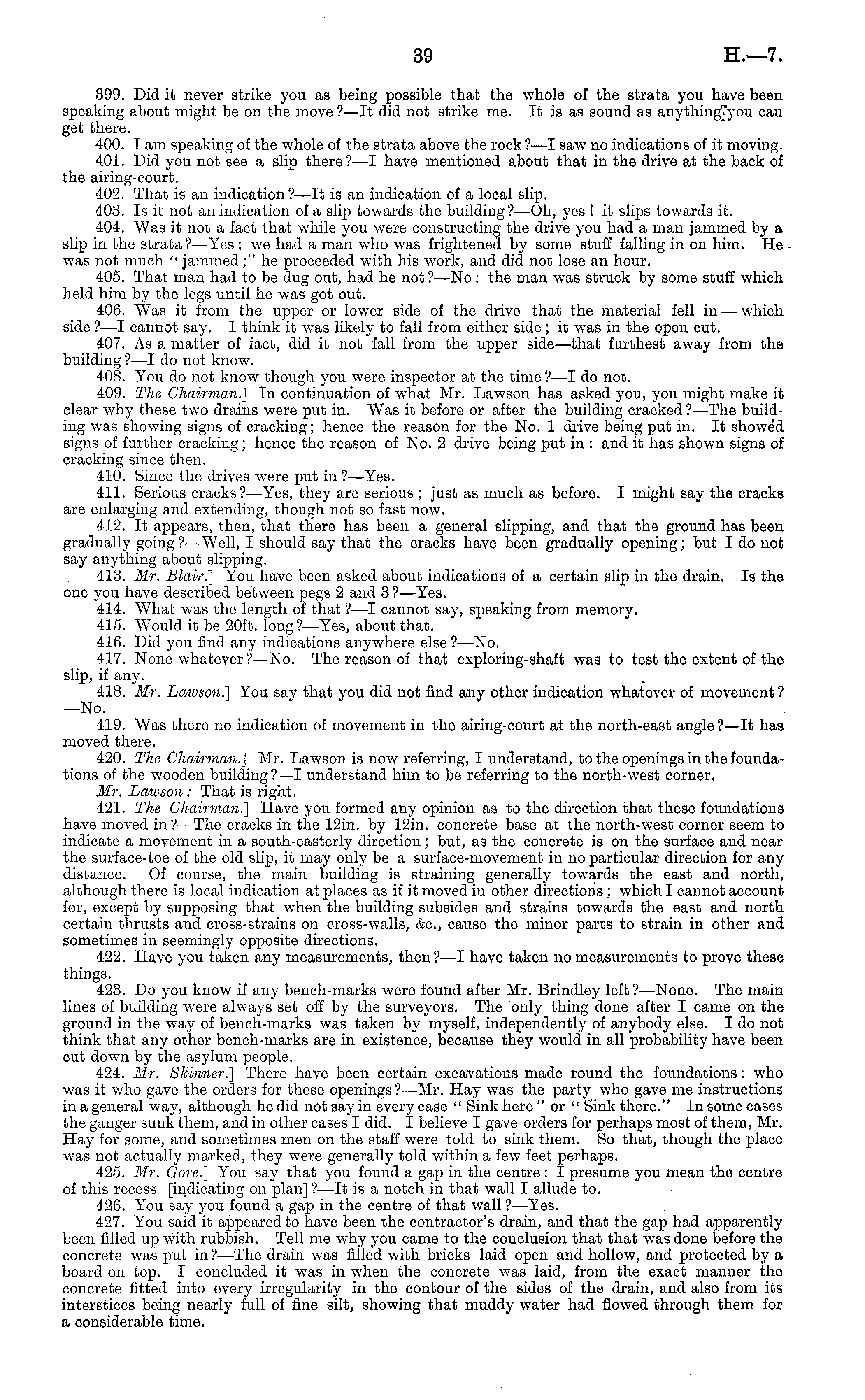 399. Did it never strike you as being possible that the whole of the strata you have been speaking about might be on the move ?—lt did not strike me. It is as sound as anything?you can get there. 400. lam speaking of the whole of the strata above the rock ?—I saw no indications of it moving. 401. Did you not see a slip there?—l have mentioned about that in the drive at the back of the airing-court. 402. That is an indication?—lt is an indication of a local slip. 403. Is it not an indication of a slip towards the building?—Oh, yes ! it slips towards it. 404. Was it not a fact that while you were constructing the drive you had a man jammed by a slip in the strata ?—Yes ;we had a man who was frightened by some stuff falling in on him. He was not much " jammed;" he proceeded with his work, and did not lose an hour. 405. That man had to be dug out, had he not ?—No : the man was struck by some stuff which held him by the legs until he was got out. 406. Was it from the upper or lower side of the drive that the material fell in — which side ?—I cannot say. I think it was likely to fall from either side ;it was in the open cut. 407. As a matter of fact, did it not fall from the upper side—that furthest away from the building ?—I do not know. 408. You do not know though you were inspector at the time ? —I do not. 409. The Chairman.] In continuation of what Mr. Lawson has asked you, you might make it clear why these two drains were put in. Was it before or after the building cracked?— The building was showing signs of cracking; hence the reason for the No. 1 drive being put in. It showed signs of further cracking; hence the reason of No. 2 drive being put in : and it has shown signs of cracking since then. 410. Since the drives were put in ?—Yes. 411. Serious cracks?— Yes, they are serious ; just as much as before. I might say the cracks are enlarging and extending, though not so fast now. 412. It appears, then, that there has been a general slipping, and that the ground has been gradually going ?—Well, I should say that the cracks have been gradually opening; but Ido not say anything about slipping. 413. Mr. Blair.] You have been asked about indications of a certain slip in the drain. Is the one you have described between pegs 2 and 3 ?—Yes. 414. What was the length of that ?—I cannot say, speaking from memory. 415. W rould it be 20ft. long ?—Yes, about that. 416. Did you find any indications anywhere else ?—No. 417. None whatever ? —No. The reason of that exploring-shaft was to test the extent of the slip, if any. 418. Mr. Lawson.] You say that you did not find any other indication whatever of movement? —No. 419. Was there no indication of movement in the airing-court at the north-east angle ?—lt has moved there. 420. The Chairman.] Mr. Lawson is now referring, I understand, to the openings in the foundations of the wooden building?—l understand him to be referring to the north-west corner. Mr. Lawson : That is right. 421. The Chairman.] Have you formed any opinion as to the direction that these foundations have moved in?— The cracks in the 12in. by 12in. concrete base at the north-west corner seem to indicate a movement in a south-easterly direction; but, as the concrete is on the surface and near the surface-toe of the old slip, it may only be a surface-movement in no particular direction for any distance. Of course, the main building is straining generally towards the east and north, although there is local indication at places as if it moved in other directions ; which I cannot account for, except by supposing that when the building subsides and strains towards the east and north certain thrusts and cross-strains on cross-walls, &c, cau.se the minor parts to strain in other and sometimes in seemingly opposite directions. 422. Have you taken any measurements, then?—l have taken no measurements to prove these things. 423. Do you know if any bench-marks were found after Mr. Brindley left ?—None. The main lines of building were always set off by the surveyors. The only thing done after I came on the ground in the way of bench-marks was taken by myself, independently of anybody else. Ido not think that any other bench-marks are in existence, because they would in all probability have been cut down by the asylum people. 424. Mr. Skinner.] There have been certain excavations made round the foundations : who was it who gave the orders for these openings ?—Mr. Hay was the party who gave me instructions in a general way, although he did not say in every case " Sink here "or " Sink there." In some cases the ganger sunk them, and in other cases I did. I believe I gave orders for perhaps most of them, Mr. Hay for some, and sometimes men on the staff were told to sink them. So that, though the place was not actually marked, they were generally told within a few feet perhaps. 425. Mr. Gore.] You say that you found a gap in the centre : I presume you mean the centre of this recess [indicating on plan] ?—lt is a notch in that wall I allude to. 426. You say you found a gap in the centre of that wall ?—Yes. 427. You said it appeared to have been the contractor's drain, and that the gap had apparently been filled up with rubbish. Tell me why you came to the conclusion that that was done before the concrete was put in?— The drain was filled with bricks laid open and hollow, and protected by a board on top. I concluded it was in when the concrete was laid, from the exact manner the concrete fitted into every irregularity in the contour of the sides of the drain, and also from its interstices being nearly full of fine silt, showing that muddy water had flowed through them for a considerable time.