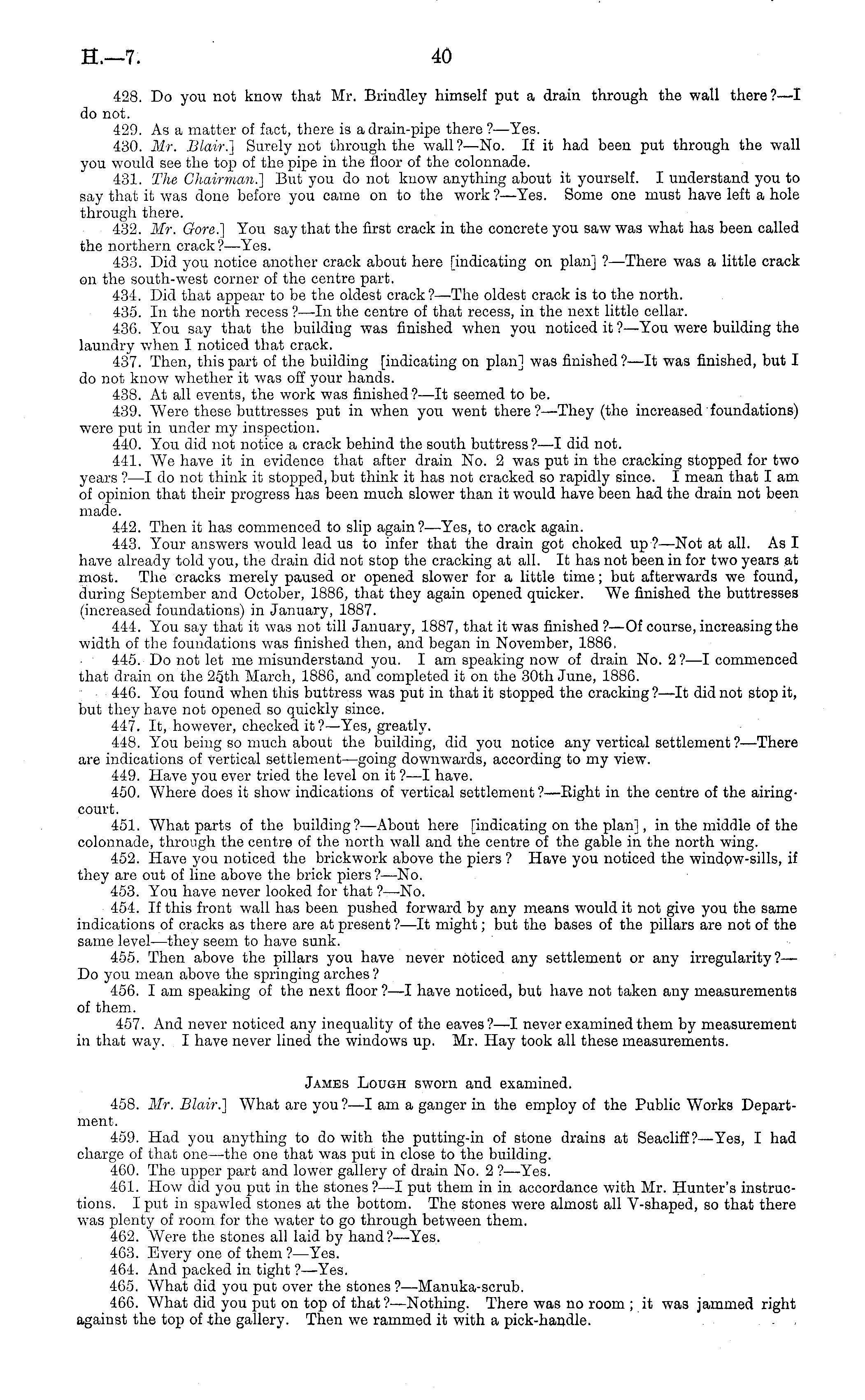428. Do you not know that Mr. Brindley himself put a drain through the wall there ?—I do not. 429. As a matter of fact, there is a drain-pipe there ?—Yes. 430. Mr. Blair.] Surely not through the wall?— No. If it had been put through the wall you would see the top of the pipe in the floor of the colonnade. 431. The Chairman.] But you do not know anything about it yourself. I understand you to say that it was done before you came on to the work ?—Yes. Some one must have left a hole through there. 432. Mr. Gore.] You say that the first crack in the concrete you saw was what has been called the northern crack?— Yes. 433. Did you notice another crack about here [indicating on plan] ?—There was a little crack on the south-west corner of the centre part. 434. Did that appear to be the oldest crack?— The oldest crack is to the north. 435. In the north recess ?—ln the centre of that recess, in the next little cellar. 436. You say that the building was finished when you noticed it ?—You were building the laundry when I noticed that crack. 437. Then, this part of the building [indicating on plan] was finished?—lt was finished, but I do not know whether it was off your hands. 438. At all events, the work was finished?—lt seemed to be. 439. "Were these buttresses put in when you went there?— They (the increased foundations) were put in under my inspection. 440. You did not notice a crack behind the south buttress?—l did not. 441. We have it in evidence that after drain No. 2 was put in the cracking stopped for two years ?—I do not think it stopped, but think it has not cracked so rapidly since. I mean that lam of opinion that their progress has been much slower than it would have been had the drain not been made. 442. Then it has commenced to slip again?— Yes, to crack again. 443. Your answers would lead us to infer that the drain got choked up ? —Not at all. As I have already told you, the drain did not stop the cracking at all. It has not been in for two years at most. The cracks merely paused or opened slower for a little time; but afterwards we found, during September and October, 1886, that they again opened quicker. We finished the buttresses (increased foundations) in January, 1887. 444. You say that it was not till January, 1887, that it was finished ?—Of course, increasing the width of the foundations was finished then, and began in November, 1886, 445. Do not let me misunderstand you. lam speaking now of drain No. 2 ? —I commenced that drain on the 25th March, 1886, and completed it on the 30th June, 1886. 446. You found when this buttress was put in that it stopped the cracking?—lt did not stop it, but they have not opened so quickly since. 447. It, however, checked it ? —Yes, greatly. 448. You being so much about the building, did you notice any vertical settlement ?—There are indications of Vertical settlement—going downwards, according to my view. 449. Have you ever tried the level on it ? —I have. 450. Where does it show indications of vertical settlement ?—Eight in the centre of the airingcourt. 451. What parts of the building?— About here [indicating on the plan], in the middle of the colonnade, through the centre of the north wall and the centre of the gable in the north wing. 452. Have you noticed the brickwork above the piers ? Have you noticed the window-sills, if they are out of line above the brick piers?— No. 453. You have never looked for that ?—No. 454. If this front wall has been pushed forward by any means would it not give you the same indications of cracks as there are at present ?—lt might; but the bases of the pillars are not of the same level—they seem to have sunk. 455. Then above the pillars you have never noticed any settlement or any irregularity?— Do you mean above the springing arches ? 456. lam speaking of the next floor ?—I have noticed, but have not taken any measurements of them. 457. And never noticed any inequality of the eaves? —I never examined them by measurement in that way. I have never lined the windows up. Mr. Hay took all these measurements. James Lough sworn and examined. 458. Mr. Blair.] What are you ?—I am a ganger in the employ of the Public Works Department. 459. Had you anything to do with the putting-in of stone drains at Seacliff ? —Yes, I had charge of that one—the one that was put in close to the building. 460. The upper part and lower gallery of drain No. 2 ?—Yes. 461. How did you put in the stones?—l put them in in accordance with Mr. Hunter's instructions. I put in spawled stones at the bottom. The stones were almost all V-shaped, so that there was plenty of room for the water to go through between them. 462. Were the stones all laid by hand?— Yes. 463. Every one of them ? —Yes. 464. And packed in tight ?—Yes. 465. What did you put over the stones ? —Manuka-scrub. 466. What did you put on top of that ?—Nothing. There was no room ; it was jammed right against the top of the gallery. Then we rammed it with a pick-handle.