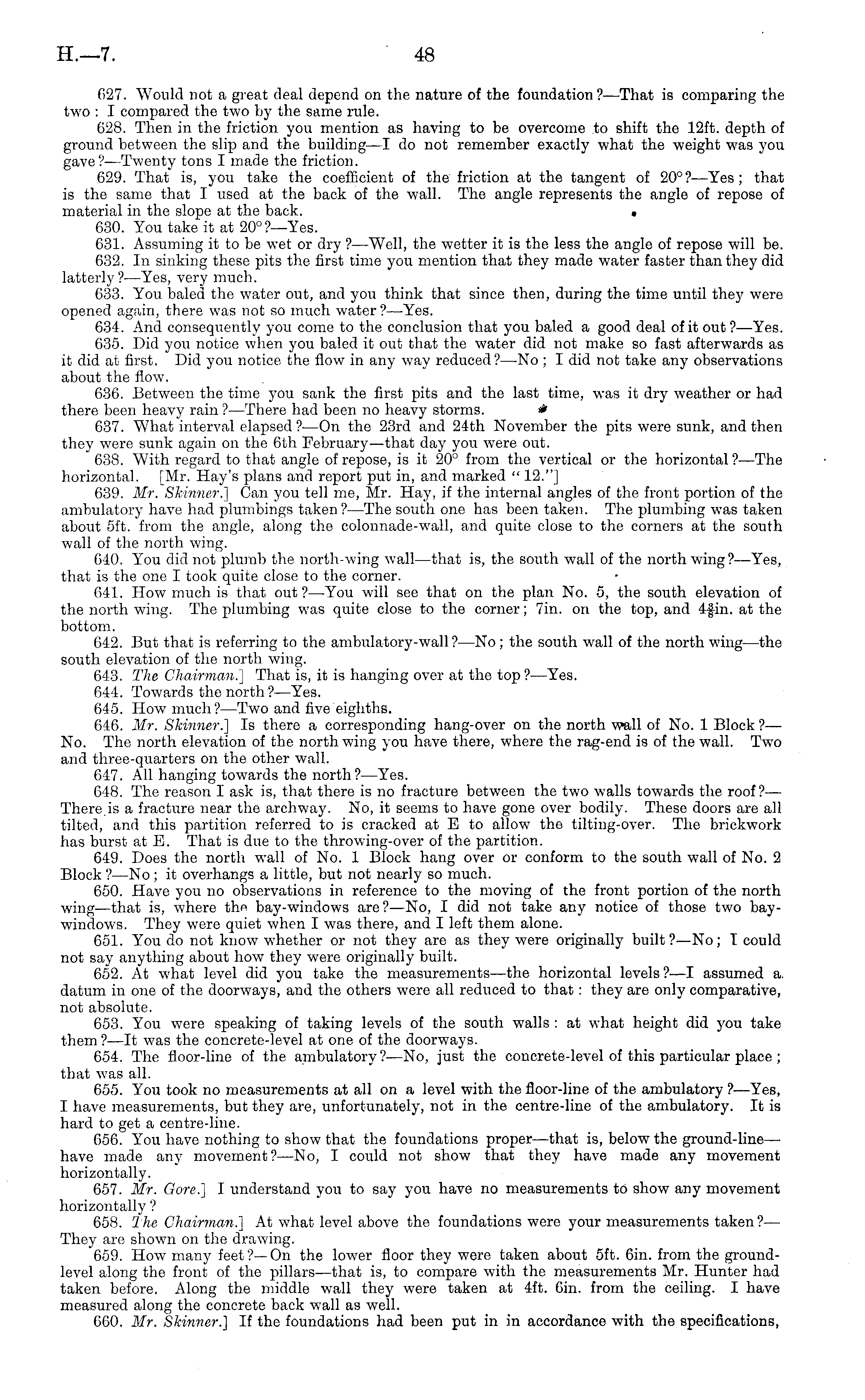 G27. Would not a great deal depend on the nature of the foundation?— That is comparing the two : I compared the two by the same rule. 628. Then in the friction you mention as having to be overcome to shift the 12ft. depth of ground between the slip and the building—l do not remember exactly what the weight was you gave?— Twenty tons I made the friction. 629. That is, you take the coefficient of the friction at the tangent of 20°? —Yes; that is the same that I used at the back of the wall. The angle represents the angle of repose of material in the slope at the back. « 630. You take it at 20°?— Yes. 631. Assuming it to be wet or dry ? —"Well, the wetter it is the less the angle of repose will be. 632. In sinking these pits the first time you mention that they made W Tater faster than they did latterly ?—Yes, very much. 633. You baled the water out, and you think that since then, during the time until they were opened again, there was not so much water? —Yes. 634. And consequently you come to the conclusion that you baled a good deal of it out ?—Yes. 635. Did you notice when you baled it out that the water did not make so fast afterwards as it did at first. Did you notice the flow in any way reduced?—No ; I did not take any observations about the flow. 636. Between the time you sank the first pits and the last time, was it dry weather or had there been heavy rain ?—There had been no heavy storms. 637. What interval elapsed?—On the 23rd and 24th November the pits were sunk, and then they were sunk again on the 6th February—that day you were out. 638. With regard to that angle of repose, is it 20° from the vertical or the horizontal?— The horizontal. [Mr. Hay's plans and report put in, and marked " 12."] 639. Mr. Skinner.] Can you tell me, Mr. Hay, if the internal angles of the front portion of the ambulatory have had plumbings taken ?—The south one has been taken. The plumbing was taken about sft. from the angle, along the colonnade-wall, and quite close to the corners at the south wall of the north wing. 640. You did not plumb the north-wing wall—that is, the south wall of the north wing?— Yes, that is the one I took quite close to the corner. 641. How much is that out?— You will see that on the plan No. 5, the south elevation of the north wing. The plumbing was quite close to the corner; 7in. on the top, and 4-fin. at the bottom. 642. But that is referring to the ambulatory-wall?—No; the south wall of the north wing—the south elevation of the north wing. 643. The Chairman.] That is, it is hanging over at the top ? —Yes. 644. Towards the north ?—Yes. 645. How much?— Two and five eighths. 646. Mr. Skinner.] Is there a corresponding hang-over on the north wall of No. 1 Block ?— No. The north elevation of the north wing you have there, where the rag-end is of the wall. Two and three-quarters on the other wall. 647. All hanging towards the north?— Yes. 648. The reason I ask is, that there is no fracture between the two walls towards the roof?— There is a fracture near the archway. No, it seems to have gone over bodily. These doors are all tilted, and this partition referred to is cracked at E to allow the tilting-over. The brickwork has burst at B. That is due to the throwing-over of the partition. 649. Does the north wall of No. 1 Block hang over or conform to the south wall of No. 2 Block ?—No; it overhangs a little, but not nearly so much. 650. Have you no observations in reference to the moving of the front portion of the north wing—that is, where the bay-windows are? —No, I did not take any notice of those two baywindows. They were quiet when I was there, and I left them alone. 651. You do not know whether or not they are as they were originally built?—No; T could not say anything about how they were originally built. 652. At what level did you take the measurements —the horizontal levels?—l assumed a. datum in one of the doorways, and the others were all reduced to that: they are only comparative, not absolute. 653. You were speaking of taking levels of the south walls : at what height did you take them ?—lt was the concrete-level at one of the doorways. 654. The floor-line of the ambulatory?—No, just the concrete-level of this particular place ; that was all. 655. You took no measurements at all on a level with the floor-line of the ambulatory ?—Yes, I have measurements, but they are, unfortunately, not in the centre-line of the ambulatory. It is hard to get a centre-line. 656. You have nothing to show that the foundations proper—that is, below the ground-line— have made any movement? —No, I could not show that they have made any movement horizontally. 657. Mr. Gore.] I understand you to say you have no measurements to show any movement horizontally ? 658. The Chairman.] At what level above the foundations were your measurements taken?— They are shown on the drawing. 659. How many feet?—On the lower floor they were taken about sft. Gin. from the groundlevel along the front of the pillars—that is, to compare with the measurements Mr. Hunter had taken before. Along the middle wall they were taken at 4ft. 6in. from the ceiling. I have measured along the concrete back wall as well. 660. Mr. Skinner.] If the foundations had been put in in accordance with the specifications,