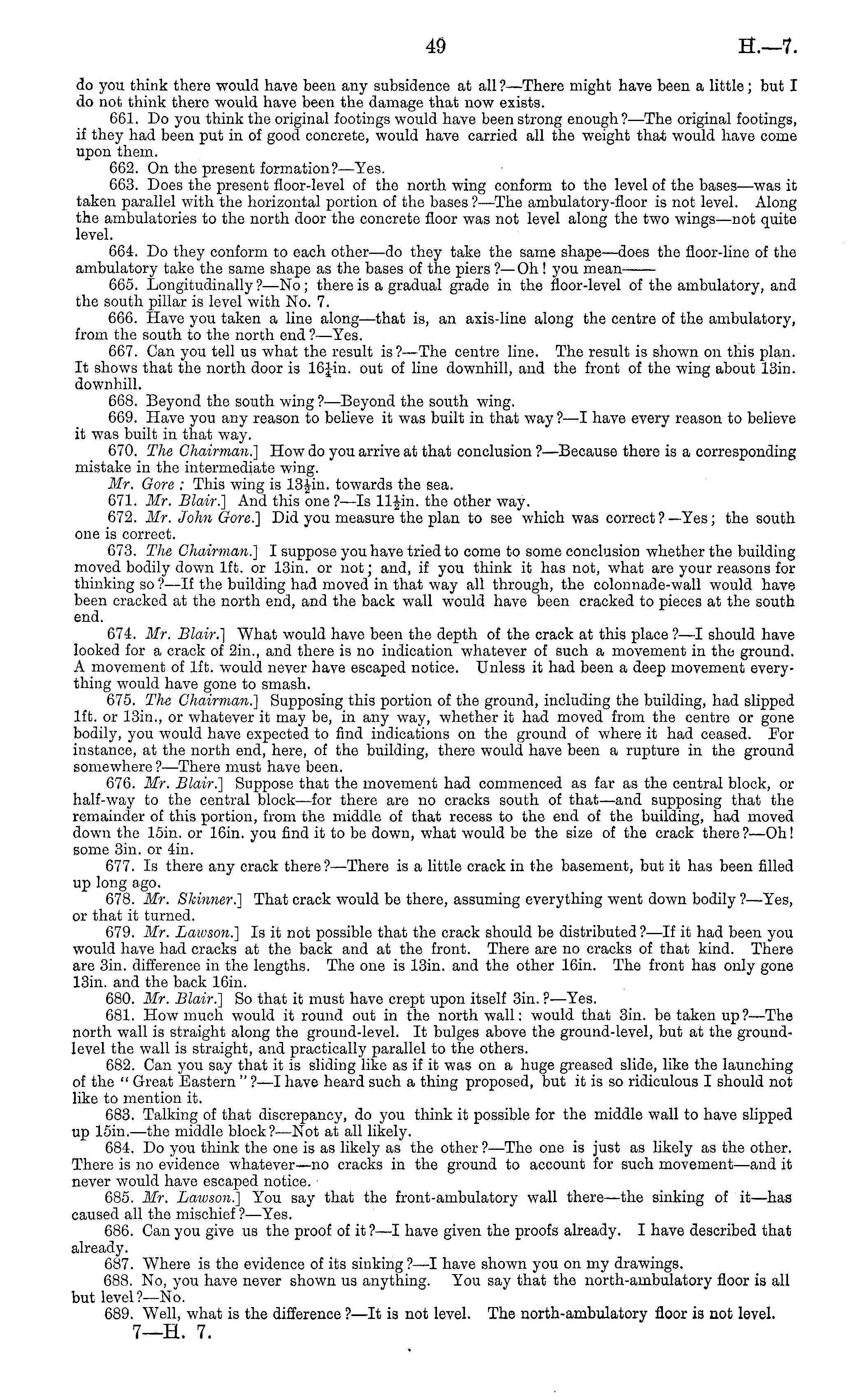do you think there would have been any subsidence at all ? —There might have been a little ; but I do not think there would have been the damage that now exists. 661. Do you think the original footings would have been strong enough ?—The original footings, if they had been put in of good concrete, would have carried all the weight that would have come upon them. 662. On the present formation? —Yes. 663. Does the present floor-level of the north wing conform to the level of the bases—was it taken parallel with the horizontal portion of the bases ?—The ambulatory-floor is not level. Along the ambulatories to the north door the concrete floor was not level along the two wings—not quite level. 664. Do they conform to each other—do they take the same shape—does the floor-line of the ambulatory take the same shape as the bases of the piers ?—Oh ! you mean 665. Longitudinally ? —No; there is a gradual grade in the floor-level of the ambulatory, and the south pillar is level with No. 7. 666. Have you taken a line along —that is, an axis-line along the centre of the ambulatory, from the south to the north end ?—Yes. 667. Can you tell us what the result is?— The centre line. The result is shown on this plan. It shows that the north door is 16Jin. out of line downhill, and the front of the wing about 13in. downhill. 668. Beyond the south wing ? —Beyond the south wing. 669. Have you any reason to believe it was built in that way ?—I have every reason to believe it was built in that way. 670. The Chairman.'] How do you arrive at that conclusion ?—Because there is a corresponding mistake in the intermediate wing. Mr. Gore ; This wing is 13Jin. towards the sea. 671. Mr. Blair.] And this one ?—ls 11-J-in. the other way. 672. Mr. John Gore.] Did you measure the plan to see which was correct ? —Yes; the south one is correct. 673. The Chairman.] I suppose you have tried to come to some conclusion whether the building moved bodily down lft. or 13in. or not; and, if you think it has not, what are your reasons for thinking so ?—lf the building had moved in that way all through, the colonnade-wall would have been cracked at the north end, and the back wall would have been cracked to pieces at the south end. 674. Mr. Blair.] What would have been the depth of the crack at this place ?—I should have looked for a crack of 2in., and there is no indication whatever of such a movement in the ground. A movement of lft. would never have escaped notice. Unless it had been a deep movement everything would have gone to smash. 675. The Chairman.] Supposing this portion of the ground, including the building, had slipped lft. or 13in., or whatever it may be, in any way, whether it had moved from the centre or gone bodily, you would have expected to find indications on the ground of where it had ceased. For instance, at the north end, here, of the building, there would have been a rupture in the ground somewhere ? —There must have been. 676. Mr. Blair.] Suppose that the movement had commenced as far as the central block, or half-way to the central block—for there are no cracks south of that—and supposing that the remainder of this portion, from the middle of that recess to the end of the building, had moved down the 15in. or 16in. you find it to be down, what would be the size of the crack there ?—Oh! some 3in. or 4in. 677. Is there any crack there?— There is a little crack in the basement, but it has been filled up long ago. 678. Mr. Skinner.] That crack would be there, assuming everything went down bodily ?—Yes, or that it turned. 679. Mr. Lawson.] Is it not possible that the crack should be distributed ?—lf it had been you would have had cracks at the back and at the front. There are no cracks of that kind. There are 3in. difference in the lengths. The one is 13in. and the other 16in. The front has only gone 13in. and the back 16in. 680. Mr. Blair.] So that it must have crept upon itself 3in. ?—Yes. 681. How much would it round out in the north wall: would that 3in. be taken up?— The north wall is straight along the ground-level. It bulges above the ground-level, but at the groundlevel the wall is straight, and practically parallel to the others. 682. Can you say that it is sliding like as if it was on a huge greased slide, like the launching of the " Great Eastern " ?—I have heard such a thing proposed, but it is so ridiculous I should not like to mention it. 683. Talking of that discrepancy, do you think it possible for the middle wall to have slipped up loin. —the middle block? —Not at all likely. 684. Do you think the one is as likely as the other ?—The one is just as likely as the other. There is no evidence whatever—no cracks in the ground to account for such movement—and it never would have escaped notice. 685. Mr. Lawson.] You say that the front-ambulatory wall there—the sinking of it—has caused all the mischief ?—Yes. 686. Can you give us the proof of it?—l have given the proofs already. I have described that already. 687. Where is the evidence of its sinking ? —I have shown you on my drawings. 688. No, you have never shown us anything. You say that the north-ambulatory floor is all but level?— No. 689. Well, what is the difference ? —lt is not level. The north-ambulatory floor is not level. 7—H. 7.