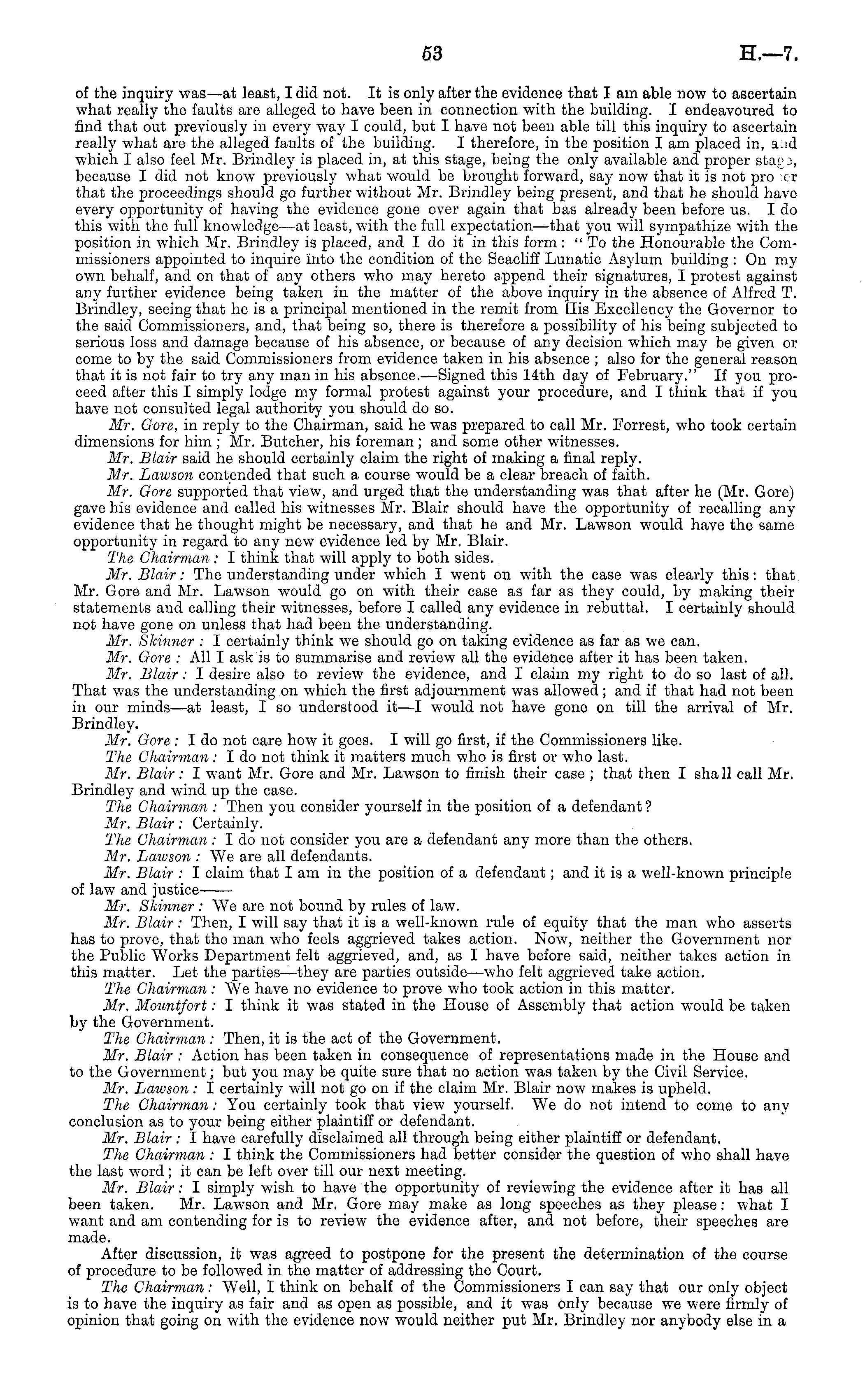 of the inquiry was—at least, I did not. It is only after the evidence that lam able now to ascertain what really the faults are alleged to have been in connection with the building. I endeavoured to find that out previously in every way I could, but I have not been able till this inquiry to ascertain really what are the alleged faults of the building. I therefore, in the position lam placed in, a.id which I also feel Mr. Brindley is placed in, at this stage, being the only available and proper stag % because I did not know previously what would be brought forward, say now that it is not pro cr that the proceedings should go further without Mr. Brindley being present, and that he should have every opportunity of having the evidence gone over again that has already been before us. Ido this with the full knowledge—at least, with the full expectation—that you will sympathize with the position in which Mr. Brindley is placed, and I do it in this form : " To the Honourable the Commissioners appointed to inquire into the condition of the Soacliff Lunatic Asylum building : On my own behalf, and on that of any others who may hereto append their signatures, I protest against any further evidence being taken in the matter of the above inquiry in the absence of Alfred T. Brindley, seeing that he is a principal mentioned in the remit from His Excellency the Governor to the said Commissioners, and, that being so, there is therefore a possibility of his being subjected to serious loss and damage because of his absence, or because of any decision which may be given or come to by the said Commissioners from evidence taken in his absence ; also for the general reason that it is not fair to try any man in his absence.—Signed this 14th day of February." If you proceed after this I simply lodge my formal protest against your procedure, and I think that if you have not consulted legal authority you should do so. Mr. Gore, in reply to the Chairman, said he was prepared to call Mr. Forrest, who took certain dimensions for him ; Mr. Butcher, his foreman ; and some other witnesses. Mr. Blair said he should certainly claim the right of making a final reply. Mr. Lawson contended that such a course would be a clear breach of faith. Mr. Gore supported that view, and urged that the understanding was that after he (Mr. Gore) gave his evidence and called his witnesses Mr. Blair should have the opportunity of recalling any evidence that he thought might be necessary, and that he and Mr. Lawson would have the same opportunity in regard to any new evidence led by Mr. Blair. The Chairman : I think that will apply to both sides. Mr. Blair: The understanding under which I went on with the case was clearly this: that Mr. Gore and Mr. Lawson would go on with their case as far as they could, by making their statements and calling their witnesses, before I called any evidence in rebuttal. I certainly should not have gone on unless that had been the understanding. Mr. Skinner : I certainly think we should go on taking evidence as far as we can. Mr. Gore : All I ask is to summarise and review all the evidence after it has been taken. Mr. Blair: I desire also to review the evidence, and I claim my right to do so last of all. That was the understanding on which the first adjournment was allowed ; and if that had not been in our minds—at least, I so understood it—l would not have gone on till the arrival of Mr. Brindley. Mr. Gore : Ido not care how it goes. I will go first, if the Commissioners like. The Chairman : I do not think it matters much who is first or who last. Mr. Blair: I want Mr. Gore and Mr. Lawson to finish their case ; that then I shall call Mr. Brindley and wind up the case. The Chairman : Then you consider yourself in the position of a defendant ? Mr. Blair: Certainly. The Chairman: Ido not consider you are a defendant any more than the others. Mr. Laivson : We are all defendants. Mr. Blair : I claim that lam in the position of a defendant; and it is a well-known principle of law and justice If;-. Skinner: We are not bound by rules of law. Mr. Blair: Then, I will say that it is a well-known rule of equity that the man who asserts has to prove, that the man who feels aggrieved takes action. Now, neither the Government nor the Public Works Department felt aggrieved, and, as I have before said, neither takes action in this matter. Let the parties—they are parties outside —who felt aggrieved take action. The Chairman: We have no evidence to prove who took action in this matter. Mr. Mountfort: I think it was stated in the House of Assembly that action would be taken by the Government. The Chairman : Then, it is the act of the Government. Mr. Blair : Action has been taken in consequence of representations made in the House and to the Government; but you may be quite sure that no action was taken by the Civil Service. Mr. Lawson: I certainly will not go on if the claim Mr. Blair now makes is upheld. The Chairman: You certainly took that view yourself. We do not intend to come to any conclusion as to your being either plaintiff or defendant. Mr. Blair: I have carefully disclaimed all through being either plaintiff or defendant. The Chairman : I think the Commissioners had better consider the question of who shall have the last word; it can be left over till our next meeting. Mr. Blair: I simply wish to have the opportunity of reviewing the evidence after it has all been taken. Mr. Lawson and Mr. Gore may make as long speeches as they please: what I want and am contending for is to review the evidence after, and not before, their speeches are made. After discussion, it was agreed to postpone for the present the determination of the course of procedure to be followed in the matter of addressing the Court. The Chairman : Well, I think on behalf of the Commissioners I can say that our only object is to have the inquiry as fair and as open as possible, and it was only because we were firmly of opinion that going o