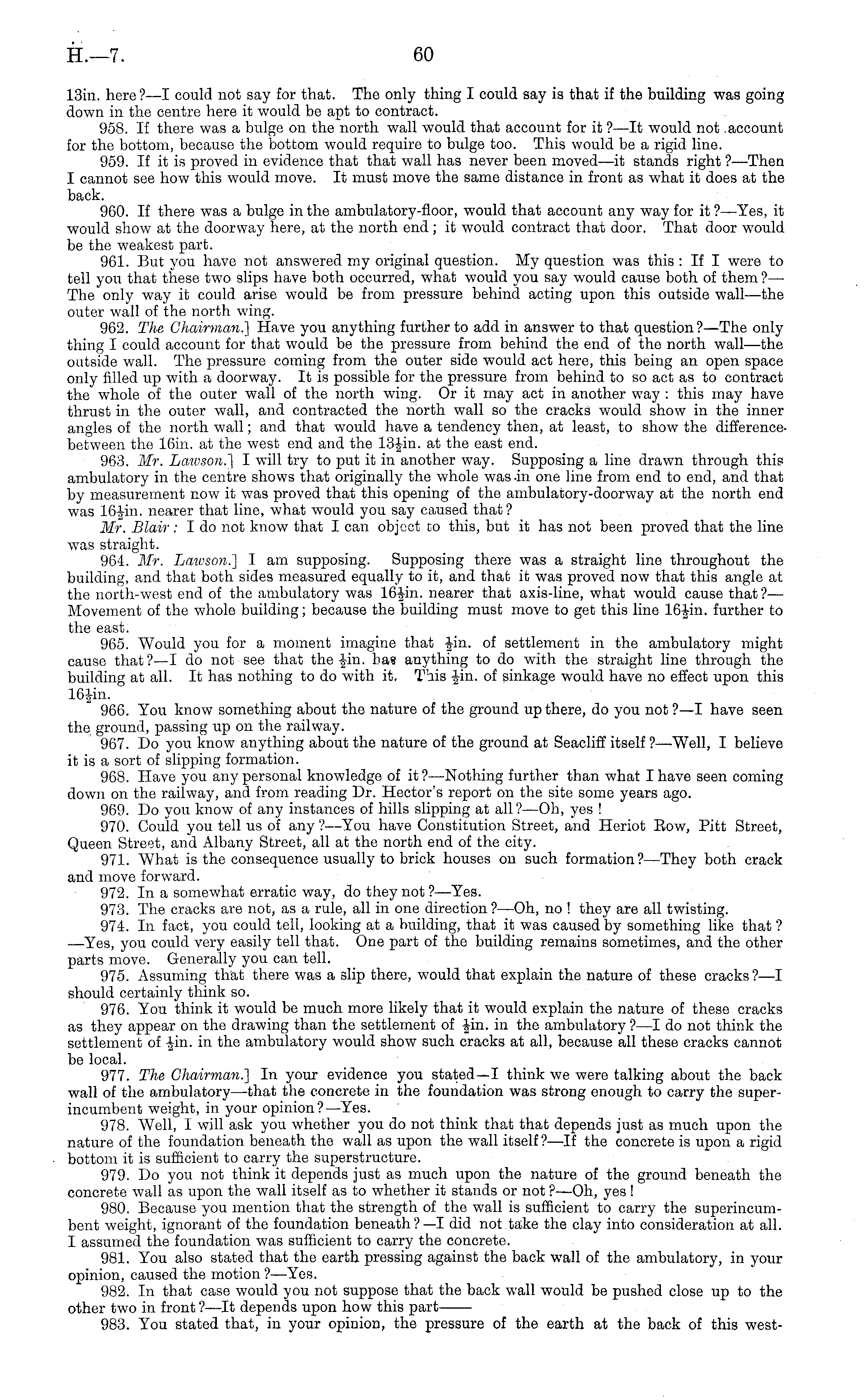 13in. here?—l could not say for that. The only thing I could say is that if the building was going down in the centre here it would be apt to contract. 958. If there was a bulge on the north wall would that account for it ? —lt would not account for the bottom, because the bottom would require to bulge too. This would be a rigid line. 959. If it is proved in evidence that that wall has never been moved—it stands right ?—Then I cannot see how this would move. It must move the same distance in front as what it does at the back. 960. If there was a bulge in the ambulatory-floor, would that account any way for it ? —Yes, it would show at the doorway here, at the north end ; it would contract that door. That door would be the weakest part. 961. But you have not answered my original question. My question was this :If I were to tell you that these two slips have both occurred, what would you say would cause both of them ? — The only way it could arise would be from pressure behind acting upon this outside wall—the outer wall of the north wing. 962. The Chairman.'] Have you anything further to add in answer to that question?— The only thing I could account for that would be the pressure from behind the end of the north wall —the outside wall. The pressure coming from the outer side would act here, this being an open space only filled up with a doorway. It is possible for the pressure from behind to so act as to contract the whole of the outer wall of the north wing. Or it may act in another way : this may have thrust in the outer wall, and contracted the north wall so the cracks would show in the inner angles of the north wall; and that would have a tendency then, at least, to show the differencebetween the 16in. at the west end and the 13Jin. at the east end. 963. Mr. Lawson.~\ I will try to put it in another way. Supposing a line drawn through this ambulatory in the centre shows that originally the whole was -in one line from end to end, and that by measurement now it was proved that this opening of the ambulatory-doorway at the north end was 16Jin. nearer that line, what would you say caused that? Mr. Blair: Ido not know that I can object co this, but it has not been proved that the line was straight. 964. Mr. Laivson.] I am supposing. Supposing there was a straight line throughout the building, and that both sides measured equally to it, and that it was proved now that this angle at the north-west end of the ambulatory was 16Jin. nearer that axis-line, what would cause that ?— Movement of the whole building; because the building must move to get this line 16Jin. further to the east. 965. Would you for a moment imagine that Jin. of settlement in the ambulatory might cause that? —I do not see that the Jin. has anything to do with the straight line through the building at all. It has nothing to do with it. This Jin. of sinkage would have no effect upon this 16Jin. 966. You know something about the nature of the ground up there, do you not ?—I have seen the ground, passing up on the railway. 967. Do you know anything about the nature of the ground at Seacliff itself ? —Well, I believe it is a sort of slipping formation. 968. Have you any personal knowledge of it ? —Nothing further than what I have seen coming down on the railway, and from reading Dr. Hector's report on the site some years ago. 969. Do you know of any instances of hills slipping at all ?—Oh, yes ! 970. Could you tell us of any ?—You have Constitution Street, and Heriot Row, Pitt Street, Queen Street, and Albany Street, all at the north end of the city. 971. What is the consequence usually to brick houses on such formation?— They both crack and move forward. 972. In a somewhat erratic way, do they not ?—Yes. 973. The cracks are not, as a rule, all in one direction ? —Oh, no ! they are all twisting. 974. In fact, you could tell, looking at a building, that it was caused by something like that ? —Yes, you could very easily tell that. One part of the building remains sometimes, and the other parts move. Generally you can tell. 975. Assuming that there was a slip there, would that explain the nature of these cracks ?—I should certainly think so. 976. You think it would be much more likely that it would explain the nature of these cracks as they appear on the drawing than the settlement of Jin. in the ambulatory ?—I do not think the settlement of Jin. in the ambulatory would show such cracks at all, because all these cracks cannot be local. 977. The Chairman.] In your evidence you stated—l think we were talking about the back wall of the ambulatory—that the concrete in the foundation was strong enough to carry the superincumbent weight, in your opinion?— Yes. 978. Well, I will ask you whether you do not think that that depends just as much upon the nature of the foundation beneath the wall as upon the wall itself ?—lf the concrete is upon a rigid bottom it is sufficient to carry the superstructure. 979. Do you not think it depends just as much upon the nature of the ground beneath the concrete wall as upon the wall itself as to whether it stands or not ?—Oh, yes ! 980. Because you mention that the strength of the wall is sufficient to carry the superincumbent weight, ignorant of the foundation beneath?—l did not take the clay into consideration at all. I assumed the foundation was sufficient to carry the concrete. 981. You also stated that the earth pressing against the back wall of the ambulatory, in your opinion, caused the motion ? —Yes. 982. In that case would you not suppose that the back wall would be pushed close up to the other two in front ?—lt depends upon how this part 983. You stated that, in your opinion, the pressure of the earth at the back of this west-