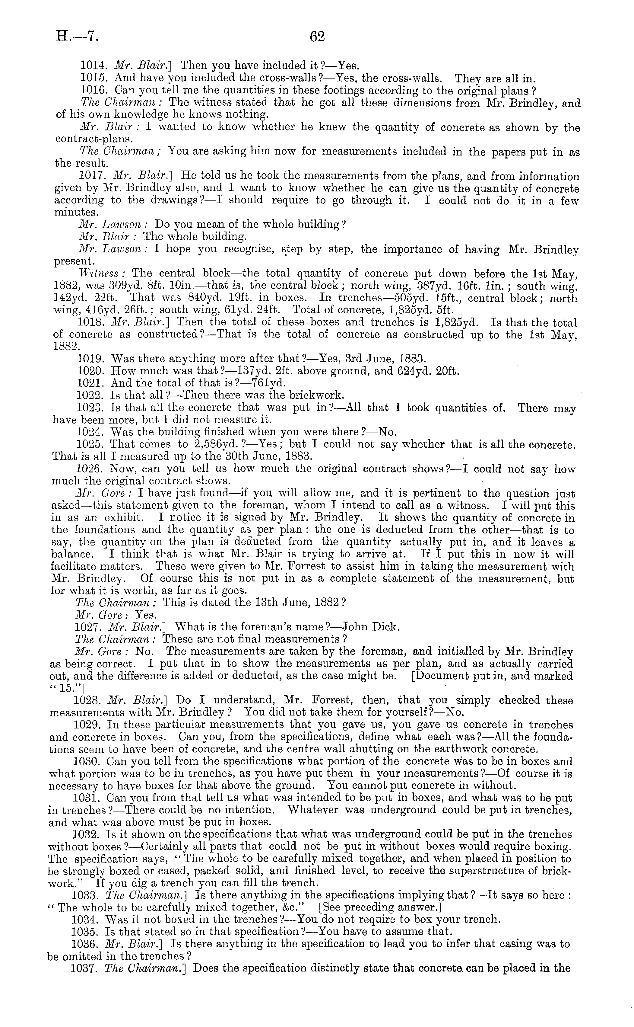 1014. Mr. Blair.] Then you have included it ? —Yes. 1015. And have you included the cross-walls?— Yes, the cross-walls. They are all in. 1016. Can you tell me the quantities in these footings according to the original plans ? The Chairman : The witness stated that he got all these dimensions from Mr. Brindley, and of his own knowledge he knows nothing. Mr. Blair : I wanted to know whether he knew the quantity of concrete as shown by the contract-plans. The Chairman; You are asking him now for measurements included in the papers put in as the result. 1017. Mr. Blair.] He told us he took the measurements from the plans, and from information given by Mr. Brindley also, and I want to know whether he can give us the quantity of concrete according to the drawings? —I should require to go through it. I could not do it in a few minutes. Mr. Lawson : Do you mean of the whole building ? Mr. Blair : The whole building. Mr. Lawson: I hope you recognise, step by step, the importance of having Mr. Brindley present. Witness : The central block—the total quantity of concrete put down before the Ist May, 1882, was 309 yd. Bft. lOin. —that is, the central block ; north wing, 387 yd. 16ft. lin. ; south wing, 142 yd. 22ft. That was 840 yd. 19ft. in boxes. In trenches—sosyd. 15ft., central block; north wing, 416 yd. 26ft.; south wing, 61yd. 24ft. Total of concrete, 1,825 yd. sft. 1018. Mr. Blair.] Then the total of these boxes and trenches is 1,825 yd. Is that the total of concrete as constructed?— That is the total of concrete as constructed up to the Ist May, 1882. 1019. Was there anything more after that ?—Yes, 3rd June, 1883. 1020. How much was that?—l37yd. 2ft. above ground, and 624 yd. 20ft. 1021. And the total of that is?—76lyd. 1022. Is that all ? —Then there was the brickwork. 1023. Is that all the concrete that was put in?— All that I took quantities of. There may have been more, but I did not measure it. 1024. Was the building finished when you were there ?—No. 1025. That comes to 2,586 yd.? —Yes; but I could not say whether that is all the concrete. That is all I measured up to the 30th June, 1883. 1026. Now, can you tell us how much the original contract shows?—l could not say how much the original contract shows. Mr. Gore: I have just found—if you will allow me, and it is pertinent to the question just asked—this statement given to the foreman, whom I intend to call as a witness. I will put this in as an exhibit. I notice it is signed by Mr. Brindley. It shows the quantity of concrete in the foundations and the quantity as per plan : the one is deducted from the other—that is to say, the quantity on the plan is deducted from the quantity actually put in, and it leaves a balance. I think that is what Mr. Blair is trying to arrive at. If I put this in now it will facilitate matters. These were given to Mr. Forrest to assist him in taking the measurement with Mr. Brindley. Of course this is not put in as a complete statement of the measurement, but for what it is worth, as far as it goes. The Chairman : This is dated the 13th June, 1882 ? Mr. Gore: Yes. 1027. Mr. Blair.] What is the foreman's name? —John Dick. The Chairman : These are not final measurements ? Mr. Gore : No. The measurements are taken by the foreman, and initialled by Mr. Brindley as being correct. I put that in to show the measurements as per plan, and as actually carried out, and the difference is added or deducted, as the case might be. [Document put in, and marked "15."] 1028. Mr. Blair.] Do I understand, Mr. Forrest, then, that you simply checked these measurements with Mr. Brindley ? You did not take them for yourself?— No. 1029. In these particular measurements that you gave us, you gave us concrete in trenches and concrete in boxes. Can you, from the specifications, define what each was ?—All the foundations seem to have been of concrete, and the centre wall abutting on the earthwork concrete. 1030. Can you tell from the specifications what portion of the concrete was to be in boxes and w That portion was to be in trenches, as you have put them in your measurements ? —Of course it is necessary to have boxes for that above the ground. You cannot put concrete in without. 1031. Can you from that tell ua what was intended to be put in boxes, and what was to be put intrenches? —There could be no intention. Whatever was underground could be put in trenches, and what was above must be put in boxes. 1032. Is it shown on the specifications that what was underground could be put in the trenches without boxes ?—Certainly all parts that could not be put in without boxes would require boxing. The specification says, "The whole to be carefully mixed together, and when placed in position to be strongly boxed or cased, packed solid, and finished level, to receive the superstructure of brickwork." If you dig a trench you can fill the trench. 1033. The Chairman.] Is there anything in the specifications implying that ?—lt says so here : " The whole to be carefully mixed together, &c." [See preceding answer.] 1034. Was it not boxed in the trenches?— You do not require to box your trench. 1035. Is that stated so in that specification?— You have to assume that. 1036. Mr. Blair.] Is there anything in the specification to lead you to infer that casing was to be omitted in the trenches ? 1037. The, Chairman.] Does the specification distinctly state that concrete, can be placed in the