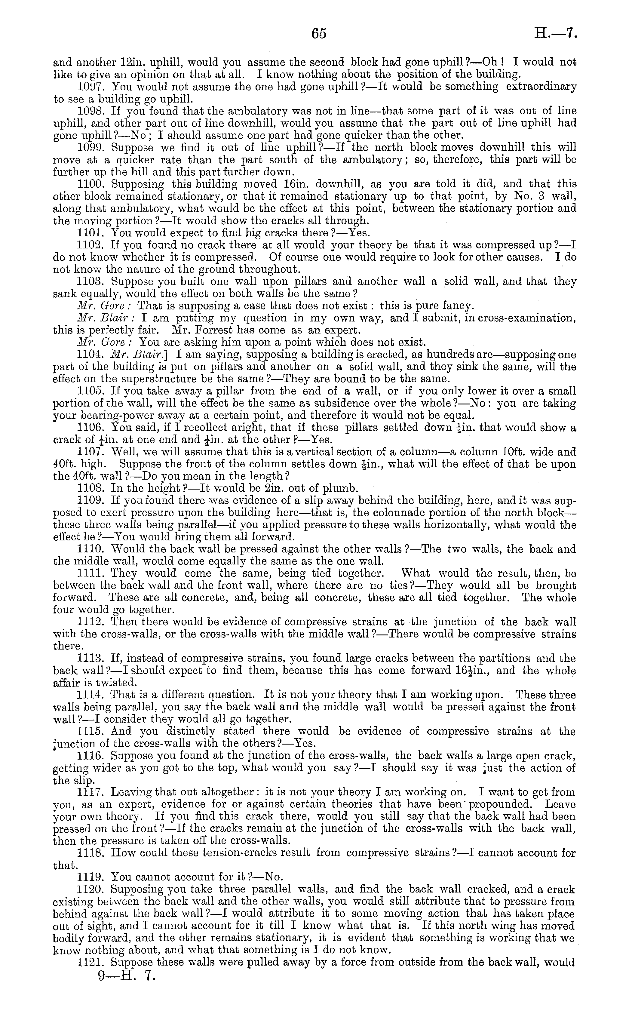and another 12in. uphill, would you assume the second block had gone uphill ?—Oh ! I would not like to give an opinion on that at all. I know nothing about the position of the building. 1097. You would not assume the one had gone uphill ? —lt would be something extraordinary to see a building go uphill. 1098. If you found that the ambulatory was not in line—that some part of it was out of lino uphill, and other part out of line downhill, would you assume that the part out of line uphill had gone uphill?—No ; I should assume one part had gone quicker than the other. 1099. Suppose we find it out of line uphill ?—lf the north block moves downhill this will move at a quicker rate than the part south of the ambulatory; so, therefore, this part will be further up the hill and this part further down. 1100. Supposing this building moved 16in. downhill, as you are told it did, and that this other block remained stationary, or that it remained stationary up to that point, by No. 3 wall, along that ambulatory, what would be the effect at this point, between the stationary portion and the moving portion ?—lt would show the cracks all through. 1101. You would expect to find big cracks there? —Yes. 1102. If you found no crack there at all would your theory be that it was compressed up? —I do not know whether it is compressed. Of course one would require to look for other causes. Ido not know the nature of the ground throughout. 1103. Suppose you built one wall upon pillars and another wall a solid wall, and that they sank equally, would the effect on both walls be the same ? Mr. Gore : That is supposing a case that does not exist: this is pure fancy. Mr. Blair: I am putting my question in my own way, and I submit, in cross-examination, this is perfectly fair. Mr. Forrest has come as an expert. Mr. Gore : You are asking him upon a point which does not exist. 1104. Mr. Blair.] I am saying, supposing a building is erected, as hundreds are—supposing one part of the building is put on pillars and another on a solid wall, and they sink the same, will the effect on the superstructure be the same ?—They are bound to be the same. 1105. If you take away a pillar from the end of a wall, or if you only lower it over a small portion of the wall, will the effect be the same as subsidence over the whole ?—No : you are taking your bearing-power away at a certain point, and therefore it would not be equal. 1106. You said, if I recollect aright, that if these pillars settled down -gin. that would show a crack of Jin. at one end and Jin. at the other ? —Yes. 1107. Well, we will assume that this is a vertical section of a column—a column 10ft. wide and 40ft. high. Suppose the front of the column settles down Jin., what will the effect of that be upon the 40ft. wall ?—Do you mean in the length? 1108. In the height ? —lt would be 2in. out of plumb. 1109. If you found there was evidence of a slip away behind the building, here, and it was supposed to exert pressure upon the building here—that is, the colonnade portion of the north block— these three walls being parallel—if you applied pressure to these walls horizontally, what would the effect be ?—You would bring them all forward. 1110. Would the back wall be pressed against the other walls ? —The two walls, the back and the middle wall, would come equally the same as the one wall. 1111. They would come the same, being tied together. What would the result, then, be between the back wall and the front wall, where there are no ties ?—They would all be brought forward. These are all concrete, and, being all concrete, these are all tied together. The whole four would go together. 1112. Then there would be evidence of compressive strains at the junction of the back wall with the cross-walls, or the cross-walls with the middle wall ?—There would be compressive strains there. 1113. If, instead of compressive strains, you found large cracks between the partitions and the back wall ? —I should expect to find them, because this has come forward 16-Jin., and the whole affair is twisted. 1114. That is a different question. It is not your theory that lam working upon. These three walls being parallel, you say the back wall and the middle wall would be pressed against the front wall ? —I consider they would all go together. 1115. And you distinctly stated there would be evidence of compressive strains at the junction of the cross-walls with the others ? —Yes. 1116. Suppose you found at the junction of the cross-walls, the back walls a large open crack, getting wider as you got to the top, what would you say ?—I should say it was just the action of the slip. 1117. Leaving that out altogether: it is not your theory lam working on. I want to get from you, as an expert, evidence for or against certain theories that have been'propounded. Leave your own theory. If you find this crack there, would you still say that the back wall had been pressed on the front ?—lf the cracks remain at the junction of the cross-walls with the back wall, then the pressure is taken off the cross-walls. 1118. How could these tension-cracks result from compressive strains ?—I cannot account for that. 1119. You cannot account for it ?—No. 1120. Supposing you take three parallel walls, and find the back wall cracked, and a crack existing between the back wall and the other walls, you would still attribute that to pressure from behind against the back wall ? —I would attribute it to some moving action that has taken place out of sight, and I cannot account for it till I know what that is. If this north wing has moved bodily forward, and the other remains stationary, it is evident that something is working that we know nothing about, and what that something is I do not know. 1121. Suppose these walls were pulled away by a force from outside from the back wall, would 9—H. 7.