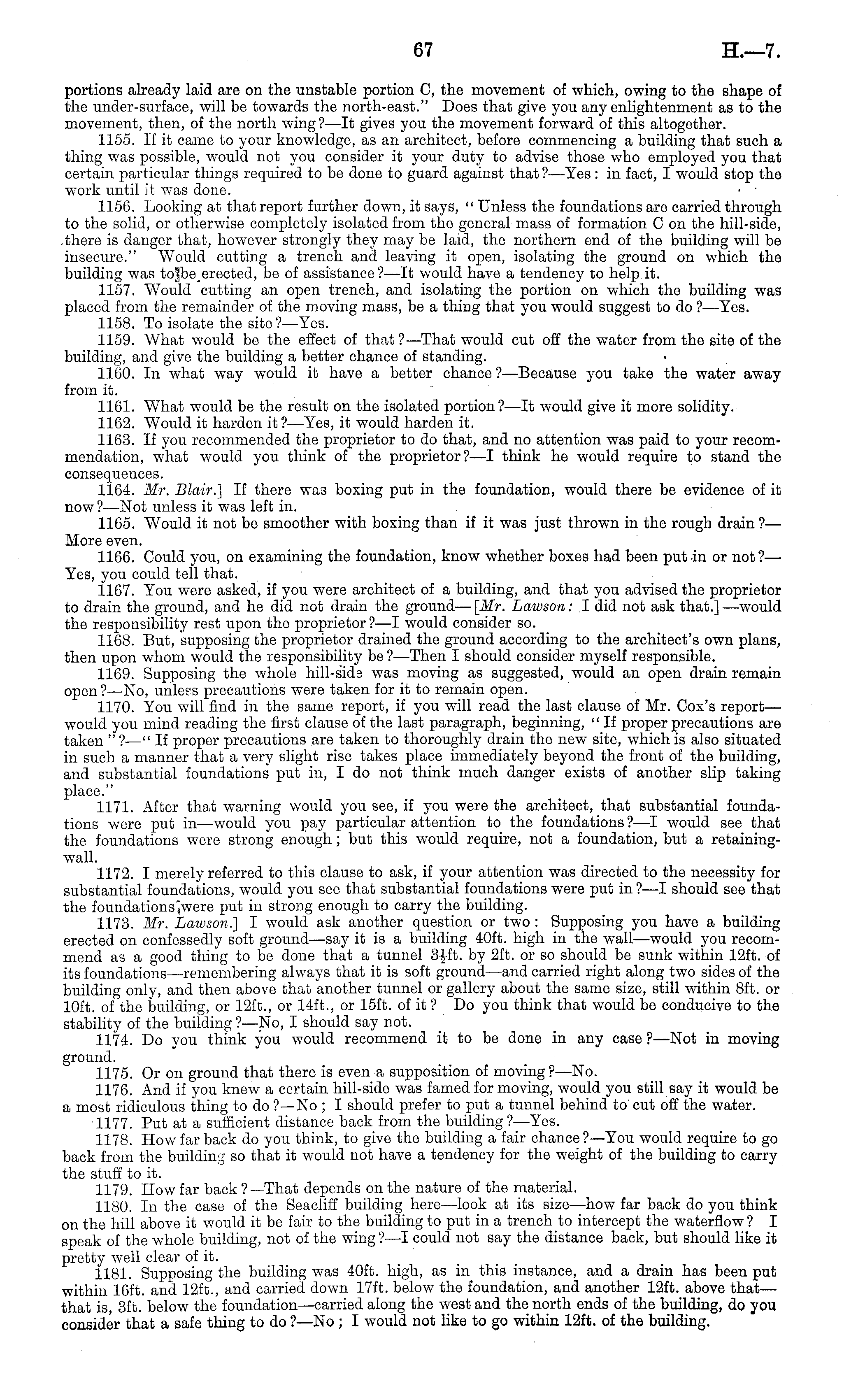 portions already laid are on the unstable portion C, the movement of which, owing to the shape of the under-surface, will be towards the north-east." Does that give you any enlightenment as to the movement, then, of the north wing?—lt gives you the movement forward of this altogether. 1155. If it came to your knowledge, as an architect, before commencing a building that such a thing was possible, would not you consider it your duty to advise those who employed you that certain particular things required to be done to guard against that ?—Yes : in fact, I would stop the work until it was done. ■ ■ 1156. Looking at that report further down, it says, " Unless the foundations are carried through to the solid, or otherwise completely isolated from the general mass of formation C on the hill-side, there is danger that, however strongly they may be laid, the northern end of the building will be insecure." Would cutting a trench and. leaving it open, isolating the ground on which the building was to^be,erected, be of assistance ? —lt would have a tendency to help it. 1157. Would cutting an open trench, and isolating the portion on which the building was placed from the remainder of the moving mass, be a thing that you would suggest to do ?—Yes. 1158. To isolate the site?— Yes. 1159. What would be the effect of that ?—That would cut off the water from the site of the building, and give the building a better chance of standing. 1160. In what way would it have a better chance ? —Because you take the water away from it. 1161. What w rould be the result on the isolated portion?—lt would give it more solidity. 1162. Would it harden it?— Yes, it would harden it. 1163. If you recommended the proprietor to do that, and no attention was paid to your recommendation, what would you think of the proprietor ? —I think he would require to stand the consequences. 1164. Mr. Blair.] If there was boxing put in the foundation, would there be evidence of it now?— Not unless it was left in. 1165. Would it not be smoother with boxing than if it was just thrown in the rough drain ?— More even. 1166. Could you, on examining the foundation, know whether boxes had been put in or not ?— Yes, you could tell that. 1167. You were asked, if you were architect of a building, and that you advised the proprietor to drain the ground, and he did not drain the ground — [Mr. Lawson: I did not ask that.] —would the responsibility rest upon the proprietor? —I would consider so. 1168. But, supposing the proprietor drained the ground according to the architect's own plans, then upon whom would the responsibility be?— Then I should consider myself responsible. 1169. Supposing the whole hill-side was moving as suggested, would an open drain remain open ?—No, unless precautions were taken for it to remain open. 1170. You will find in the same report, if you will read the last clause of Mr. Cox's report— would you mind reading the first clause of the last paragraph, beginning, " If proper precautions are taken " ?—" If proper precautions are taken to thoroughly drain the new site, which is also situated in such a manner that a very slight rise takes place immediately beyond the front of the building, and substantial foundations put in, I do not think much danger exists of another slip taking place." 1171. After that warning would you see, if you were the architect, that substantial foundations were put in—would you pay particular attention to the foundations?—l would see that the foundations were strong enough; but this would require, not a foundation, but a retainingwall. 1172. I merely referred to this clause to ask, if your attention was directed to the necessity for substantial foundations, would you see that substantial foundations were put in ?—I should see that the foundations /were put in strong enough to carry the building. 1173. Mr. Lawson.'] I would ask another question or two : Supposing you have a building erected on confessedly soft ground—say it is a building 40ft. high in the wall —would you recommend as a good thing to be done that a tunnel 3|ft. by 2ft. or so should be sunk within 12ft. of its foundations —remembering always that it is soft ground—and carried right along two sides of the building only, and then above that another tunnel or gallery about the same size, still within Bft. or 10ft. of the building, or 12ft., or 14ft., or 15ft. of it ? Do you think that would be conducive to the stability of the building ?—No, I should say not. 1174. Do you think you would recommend it to be done in any case ? —Not in moving ground. 1175. Or on ground that there is even a supposition of moving ? —No. 1176. And if you knew a certain hill-side was famed for moving, would you still say it would be a most ridiculous thing to do ?—No ; I should prefer to put a tunnel behind to cut off the water. 1177. Put at a sufficient distance back from the building? —Yes. 1178. How far back do you think, to give the building a fair chance?— You would require to go back from the building so that it would not have a tendency for the weight of the building to carry the stuff to it. 1179. How far back ? —That depends on the nature of the material. 1180. In the case of the Seacliff building here —look at its size—how far back do you think on the hill above it would it be fair to the building to put in a trench to intercept the waterflow ? I speak of the whole building, not of the wing ?—I could not say the distance back, but should like it pretty well clear of it. 1181. Supposing the building was 40ft. high, as in this instance, and a drain has been put within 16ft. and 12ft., and carried down 17ft. below the foundation, and another 12ft. above that— that is, 3ft. below the foundation —carried along the west and the north ends of the building, do you consider that a safe thing to do ?—No ; I would not like to go within 12ft. of the building.