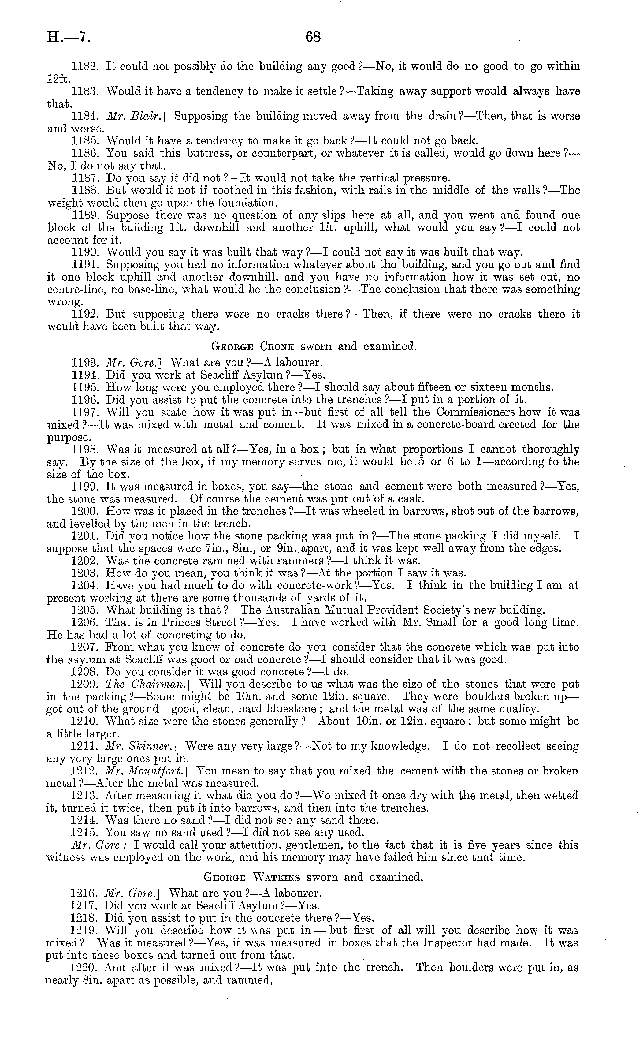 1182. It could not possibly do the building any good?—No, it would do no good to go within 12ft. 1183. Would it have a tendency to make it settle ?—Taking away support would always have that. 1184. Mr. Blair.] Supposing the building moved away from the drain ?—Then, that is worse and worse. 1185. Would it have a tendency to make it go back ? —lt could not go back. 1186. You said this buttress, or counterpart, or whatever it is called, would go down here ?— No, I do not say that. 1187. Do you say it did not ?—lt would not take the vertical pressure. 1188. But would it not if toothed in this fashion, with rails in the middle of the walls ?—The weight would then go upon the foundation. 1189. Suppose there was no question of any slips here at all, and you went and found one block of the building lft. downhill and another lft. uphill, what would you say ? —I could not account for it. 1190. Would you say it was built that way ?—I could not say it was built that way. 1191. Supposing you had no information whatever about the building, and you go out and find it one block uphill and another downhill, and you have no information how it was set out, no centre-line, no base-line, what would be the conclusion ? —The conclusion that there was something wrong. 1192. But supposing there were no cracks there ?—Then, if there were no cracks there it would have been built that way. Geoegb Ceonk sworn and examined. 1193. Mr. Gore.] What are you ? —A labourer. 1194. Did you work at Seacliff Asylum ? —Yes. 1195. How long were you employed there ? —I should say about fifteen or sixteen months. 1196. Did you assist to put the concrete into the trenches ?—I put in a portion of it. 1197. Will you state how it was put in—but first of all tell the Commissioners how it was mixed ? —lt was mixed with metal and cement. It was mixed in a concrete-board erected for the purpose. 1198. Was it measured at all ?—Yes, in a box ; but in what proportions I cannot thoroughly say. By the size of the box, if my memory serves me, it would be-5 or 6to I—according to the size of the box. 1199. It was measured in boxes, you say—the stone and cement were both measured ?—Yes, the stone was measured. Of course the cement was put out of a cask. 1200. How was it placed in the trenches ? —lt was wheeled in barrows, shot out of the barrows, and levelled by the men in the trench. 1201. Did you notice how the stone packing was put in ? —The stone packing I did myself. I suppose that the spaces were 7in., Bin., or 9in. apart, and it was kept well away from the edges. 1202. Was the concrete rammed with rammers ? —I think it was. 1203. How do you mean, you think it was ?—At the portion I saw it was. 1204. Have you had much to do with concrete-work ? —Yes. I think in the building I am at present working at there are some thousands of yards of it. 1205. What building is that ? —The Australian Mutual Provident Society's new building. 1206. That is in Princes Street ?—Yes. I have worked with Mr. Small for a good long time. He has had a lot of concreting to do. 1207. From what you know of concrete do you consider that the concrete which was put into the asylum at Seacliff was good or bad concrete ? —I should consider that it was good. 1208. Do you consider it was good concrete ? —I do. 1209. The Chairman.] Will you describe to us what was the size of the stones that were put in the packing ?—Some might be lOin. and some 12in. square. They were boulders broken up— got out of the ground—good, clean, hard bluestone ; and the metal was of the same quality. 1210. What size were the stones generally? —About lOin. or 12in. square ; but some might be a little larger. 1211. Mr. Skinner.] Were any very large ? —Not to my knowledge. I do not recollect seeing any very large ones put in. 1212. Mr. Mountfort.] You mean to say that you mixed the cement with the stones or broken metal ? —After the metal was measured. 1213. After measuring it what did you do ? —We mixed it once dry with the metal, then wetted it, turned it twice, then put it into barrows, and then into the trenches. 1214. Was there no sand ? —I did not see any sand there. 1215. You saw no sand used ?—I did not see any used. Mr. Gore : I would call your attention, gentlemen, to the fact that it is five years since this witness was employed on the work, and his memory may have failed him since that time. Geoege Watkins sworn and examined. 1216. Mr. Gore.] What are you ? —A labourer. 1217. Did you work at Seacliff Asylum ?—Yes. 1218. Did you assist to put in the concrete there ? —Yes. 1219. Will you describe how it was put in — but first of all will you describe how it was mixed? Was it measured?— Yes, it was measured in boxes that the Inspector had made. It was put into these boxes and turned out from that. 1220. And after it was mixed ? —lt was put into the trench. Then boulders were put in, as nearly Bin. apart as possible, and rammed,