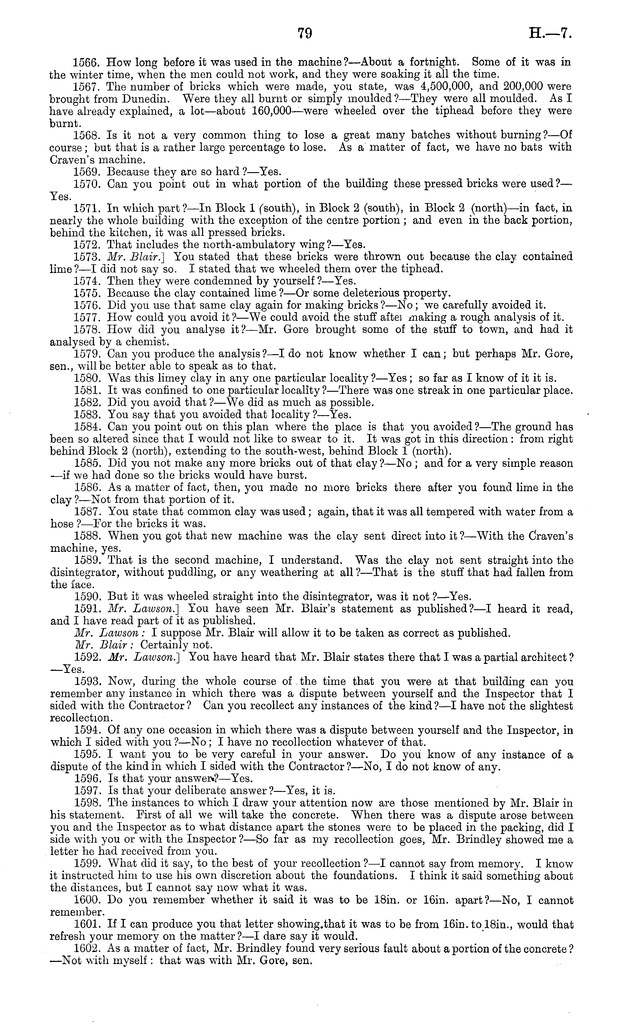 1566. How long before it was used in the machine? —About a fortnight. Some of it was in the winter time, when the men could not work, and they were soaking it all the time. 1567. The number of bricks which were made, you state, was 4,500,000, and 200,000 were brought from Dunedin. Were they all burnt or simply moulded?— They were all moulded. As I have already explained, a lot —about 160,000 —were wheeled over the tiphead before they were burnt. 1568. Is it not a very common thing to lose a great many batches without burning? —Of course; but that is a rather large percentage to lose. As a matter of fact, we have no bats with Craven's machine. 1569. Because they are so hard ?—Yes. 1570. Can you point out in what portion of the building these pressed bricks were used ? — Yes. 1571. In which part?—ln Block 1 (south), in Block 2 (south), in Block 2 (north) —in fact, in nearly the whole building with the exception of the centre portion ; and even in the back portion, behind the kitchen, it was all pressed bricks. 1572. That includes the north-ambulatory wing? —-Yes. 1573. Mr. Blair.} You stated that these bricks were thrown out because the clay contained lime? —I did not say so. I stated that we wheeled them over the tiphead. 1574. Then they were condemned by yourself?— Yes. 1575. Because the clay contained lime ? —Or some deleterious property. 1576. Did you use that same clay again for making bricks? —No; we carefully avoided it. 1577. How could you avoid it ? —We could avoid the stuff aftei making a rough analysis of it. 1578. How did you analyse it ?—Mr. Gore brought some of the stuff to town, and had it analysed by a chemist. 1579. Can you produce the analysis ?—I do not know whether I can; but perhaps Mr. Gore, sen., will be better able to speak as to that. 1580. Was this limey clay in any one particular locality ? —Yes; so far as I know of it it is. 1581. It was confined to one particular locality ?—There was one streak in one particular place. 1582. Did you avoid that ?—We did as much as possible. 1583. You say that you avoided that locality ?—Yes. 1584. Can you point out on this plan where the place is that you avoided?— The ground has been so altered since that I would not like to swear to it. It was got in this direction : from right behind Block 2 (north), extending to the south-west, behind Block 1 (north). 1585. Did you not make any more bricks out of that clay?—No ; and for a very simple reason —if we had done so the bricks would have burst. 1586. As a matter of fact, then, you made no more bricks there after you found lime in the clay ?—Not from that portion of it. 1587. You state that common clay was used; again, that it was all tempered with water from a hose ? —For the bricks it was. 1588. When you got that new machine was the clay sent direct into it ?—With the Craven's machine, yes. 1589. That is the second machine, I understand. Was the clay not sent straight into the disintegrator, without puddling, or any weathering at all ?—That is the stuff that had fallen from the face. 1590. But it was wheeled straight into the disintegrator, was it not ? —Yes. 1591. Mr. Lawson.] You have seen Mr. Blair's statement as published? —I heard it read, and I have read part of it as published. Mr. Lawson: I suppose Mr. Blair will allow it to be taken as correct as published. Mr. Blair : Certainly not. 1592. Mr. Laivson.] You have heard that Mr. Blair states there that I was a partial architect ? —Yes. 1593. Now, during the whole course of the time that you were at that building can you remember any instance in which there was a dispute between yourself and the Inspector that I sided with the Contractor ? Can you recollect any instances of the kind ? —I have not the slightest recollection. 1594. Of any one occasion in which there was a dispute between yourself and the Inspector, in which I sided with you ? —No ; I have no recollection whatever of that. 1595. I want you to be very careful in your answer. Do you know of any instance of a dispute of the kind in which I sided with the Contractor ? —No, I do not know of any. 1596. Is that your answer-?— Yes. 1597. Is that your deliberate answer? —Yes, it is. 1598. The instances to which I draw your attention now are those mentioned by Mr. Blair in his statement. First of all we will take the concrete. When there was a dispute arose between you and the Inspector as to what distance apart the stones were to be placed in the packing, did I side with you or with the Inspector ?—So far as my recollection goes, Mr. Brindley showed me a letter he had received from you. 1599. What did it say, to the best of your recollection ? —I cannot say from memory. I know it instructed him to use his own discretion about the foundations. I think it said something about the distances, but I cannot say now what it was. 1600. Do you remember whether it said it was to be 18in. or 16in. apart?—No, I cannot remember. 1601. If I can produce you that letter showing.that it was to be from 16in. to 18in., would that refresh your memory on the matter ?—I dare say it would. 1602. As a matter of fact, Mr. Brindley found very serious fault about a portion of the concrete ? —Not with myself: that was with Mr. Gore, sen.