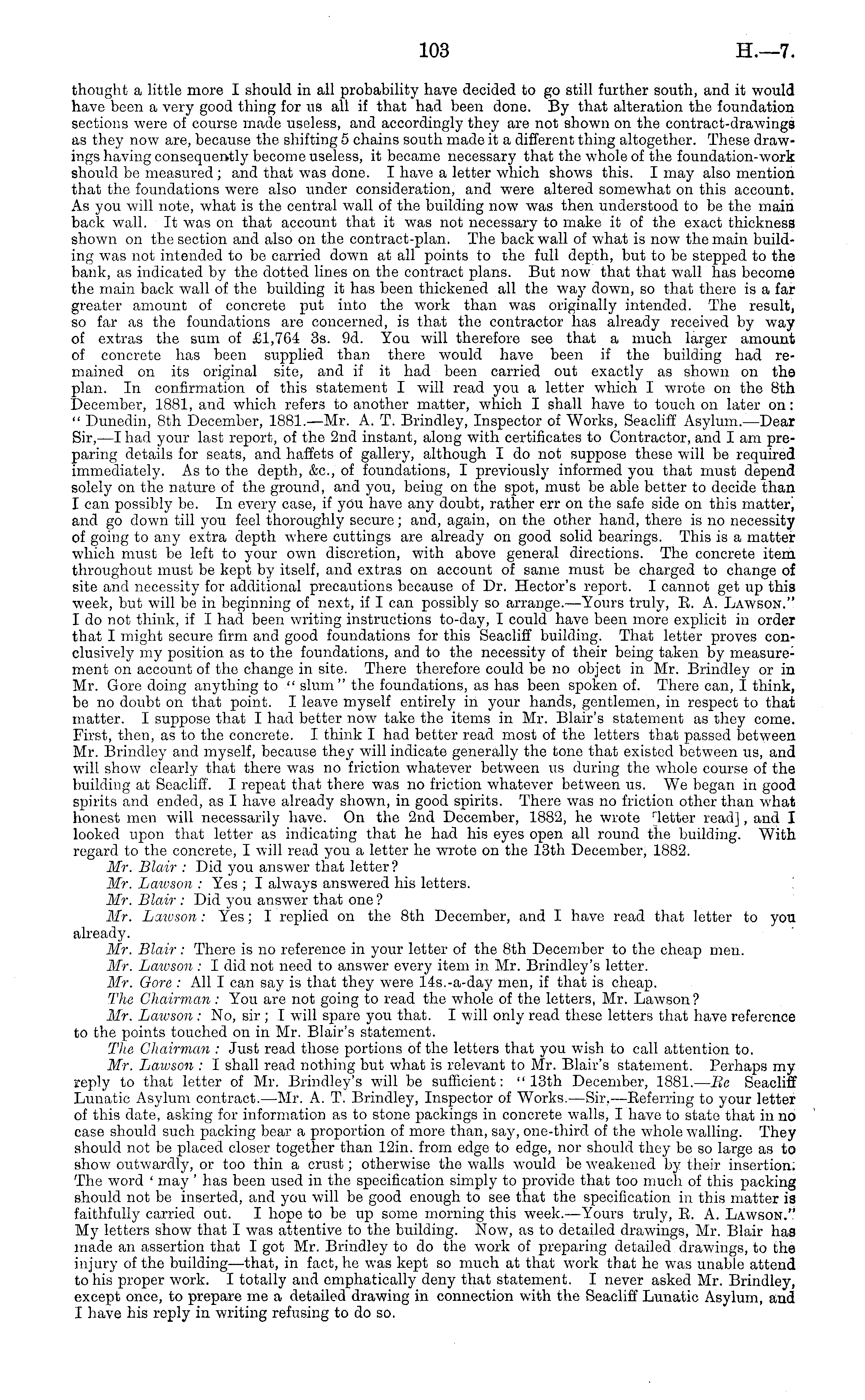 thought a little more I should in all probability have decided to go still further south, and it would have been a very good thing for us all if that had been done. By that alteration the foundation sections were of course made useless, and accordingly they are not shown on the contract-drawings as they now are, because the shifting 5 chains south made it a different thing altogether. These drawings having consequently become useless, it became necessary that the whole of the foundation-work should be measured ; and that was done. I have a letter which shows this. I may also mention that the foundations were also under consideration, and were altered somewhat on this account. As you will note, what is the central wall of the building now was then understood to bo the main back wall. It was on that account that it was not necessary to make it of the exact thickness shown on the section and also on the contract-plan. The back wall of what is now the main building was not intended to be carried down at all points to the full depth, but to be stepped to the bank, as indicated by the dotted lines on the contract plans. But now that that wall has become the main back wall of the building it has been thickened all the way down, so that there is a far greater amount of concrete put into the work than was originally intended. The result, so far as the foundations are concerned, is that the contractor has already received by way of extras the sum of £1,764 3s. 9d. You will therefore see that a much larger amount of concrete has been supplied than there would have been if the building had remained on its original site, and if it had been carried out exactly as shown on the plan. In confirmation of this statement I will read you a letter which I wrote on the Bth December, 1881, and which refers to another matter, which I shall have to touch on later on: " Dunedin, Bth December, 1881. —Mr. A. T. Brindley, Inspector of Works, Seaeliff Asylum.—Dear Sir, —I had your last report, of the 2nd instant, along with certificates to Contractor, and lam preparing details for seats, and haffets of gallery, although I do not suppose these will be required immediately. As to the depth, &c, of foundations, I previously informed you that must depend solely on the nature of the ground, and you, being on the spot, must be able better to decide than I can possibly be. In every case, if you have any doubt, rather err on the safe side on this matter, and go down till you feel thoroughly secure; and, again, on the other hand, there is no necessity of going to any extra depth where cuttings are already on good solid bearings. This is a matter which must be left to your own discretion, with above general directions. The concrete item throughout must be kept by itself, and extras on account of same must be charged to change of site and necessity for additional precautions because of Dr. Hector's report. I cannot get up this week, but will be in beginning of next, if I can possibly so arrange. —Yours truly, E. A. Lawson." I do not think, if I had been writing instructions to-day, I could have been more explicit in order that I might secure firm and good foundations for this Seaeliff building. That letter proves conclusively my position as to the foundations, and to the necessity of their being taken by measurement on account of the change in site. There therefore could be no object in Mr. Brindley or in Mr. Gore doing anything to " slum" the foundations, as has been spoken of. There can, t think, be no doubt on that point. I leave myself entirely in your hands, gentlemen, in respect to that matter. I suppose that I had better now take the items in Mr. Blair's statement as they come. First, then, as to the concrete. I think I had better read most of the letters that passed between Mr. Brindley and myself, because they will indicate generally the tone that existed between us, and will show clearly that there was no friction whatever between us during the whole course of the building at Seaeliff. I repeat that there was no friction whatever between us. We began in good spirits and ended, as I have already shown, in good spirits. There was no friction other than what honest men will necessarily have. On the 2nd December, 1882, he wrote letter read], and I looked upon that letter as indicating that he had his eyes open all round the building. With regard to the concrete, I will read you a letter he wrote on the 13th December, 1882. Mr. Blair : Did you answer that letter? Mr. Lawson : Yes ; I always answered his letters. Mr. Blair : Did you answer that one ? Mr. Laivson : Yes; I replied on the Bth December, and 1 have read that letter to you already. Mr. Blair: There is no reference in your letter of the Bth December to the cheap men, Mr. Laicson : I did not need to answer every item in Mr. Brindley's letter. Mr. Gore : All I can say is that they were 145.-a-day men, if that is cheap. The Chairman : You are not going to read the whole of the letters, Mr. Lawson? Mr. Lawson : No, sir ; I will spare you that. I will only read these letters that have reference to the points touched on in Mr. Blair's statement. The Chairman : Just read those portions of the letters that you wish to call attention to. Mr. Lawson : I shall read nothing but what is relevant to Mr. Blair's statement. Perhaps my i*eply to that letter of Mr. Brindley's will be sufficient: " 13th December, 1881.— Be Seaeliff Lunatic Asylum contract.—Mr. A. T. Brindley, Inspector of Works.—Sir, —Referring to your letter of this date, asking for information as to stone packings in concrete walls, I have to state that in no case should such packing bear a proportion of more than, say, one-third of the whole walling. They should not be placed closer together than 12in. from edge to edge, nor should they be so large as to show outwardly, or too thin a crust; otherwise the walls would be weakened by their insertion. The word ' may ' has been used in the specificatio