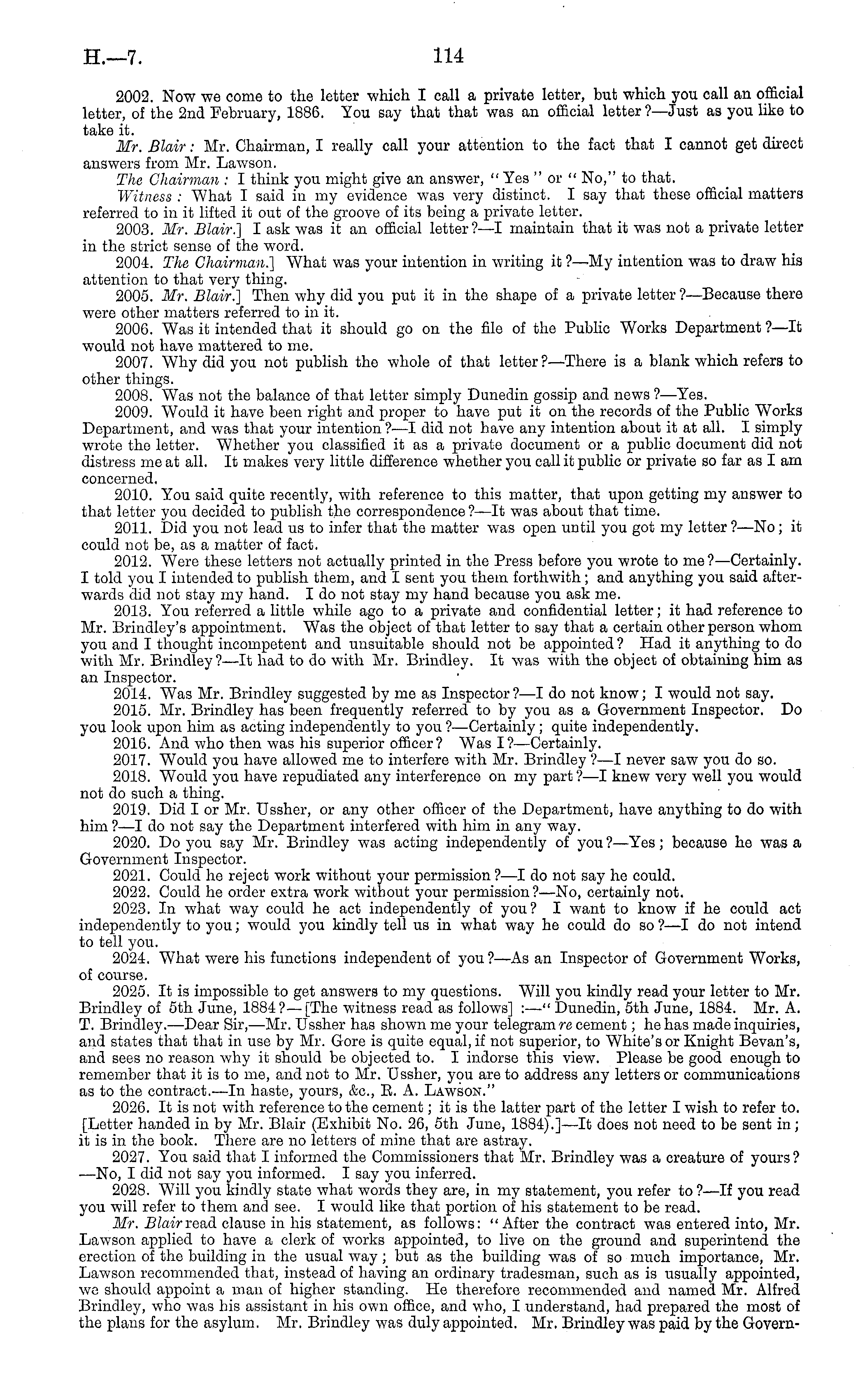 2002. Now we come to the letter which I call a private letter, but which you call an official letter, of the 2nd February, 1886. You say that that was an official letter ?—Just as you like to take it. Mr. Blair: Mr. Chairman, I really call your attention to the fact that I cannot get direct answers from Mr. Lawson. The Chairman : I think you might give an answer, " Yes " or " No," to that. Witness : What I said in my evidence was very distinct. I say that these official matters referred to in it lifted it out of the groove of its being a private letter. 2003. Mr. Blair.] I ask was it an official letter?—l maintain that it was not a private letter in the strict sense of the word. 2004. The Chairman.] What was your intention in writing it ?—My intention was to draw his attention to that very thing. 2005. Mr. Blair.] Then why did you put it in the shape of a private letter ? —Because there were other matters referred to in it. 2006. Was it intended that it should go on the file of the Public Works Department ?—lt would not have mattered to me. 2007. Why did you not publish the whole of that letter?— There is a blank which refers to other things. 2008. Was not the balance of that letter simply Dunedin gossip and news ?—Yes. 2009. Would it have been right and proper to have put it on the records of the Public Works Department, and was that your intention ?—I did not have any intention about it at all. I simply wrote the letter. Whether you classified it as a private document or a public document did not distress me at all. It makes very little difference whether you call it public or private so far as lam concerned. 2010. You said quite recently, with reference to this matter, that upon getting my answer to that letter you decided to publish the correspondence?—lt was about that time. 2011. Did you not lead us to infer that the matter was open until you got my letter ?—No; it could not be, as a matter of fact. 2012. Were these letters not actually printed in the Press before you wrote to me? —Certainly. I told you I intended to publish them, and I sent you them forthwith; and anything you said afterwards did not stay my hand. Ido not stay my hand because you ask me. 2013. You referred a little while ago to a private and confidential letter; it had reference to Mr. Brindley's appointment. Was the object of that letter to say that a certain other person whom you and I thought incompetent and unsuitable should not be appointed ? Had it anything to do with Mr. Brindley ? —lt had to do with Mr. Brindley. It was with the object of obtaining him as an Inspector. 2014. Was Mr. Brindley suggested by me as Inspector?—l do not know; I would not say. 2015. Mr. Brindley has been frequently referred to by you as a Government Inspector, Do you look upon him as acting independently to you ?—Certainly; quite independently. 2016. And who then was his superior officer ? Was I ?—Certainly. 2017. Would you have allowed me to interfere with Mr. Brindley ?—I never saw you do so. 2018. Would you have repudiated any interference on my part ? —I knew very well you would not do such a thing. 2019. Did I or Mr. Ussher, or any other officer of the Department, have anything to do with him ?—I do not say the Department interfered with him in any way. 2020. Do you say Mr. Brindley was acting independently of you ? —Yes; because he was a Government Inspector. 2021. Could he reject work without your permission ?—I do not say he could. 2022. Could he order extra work without your permission?—No, certainly not. 2023. In what way could he act independently of you ? I want to know if he could act independently to you; would you kindly tell us in what way he could do so ? —I do not intend to tell you. 2024. What were his functions independent of you ?—As an Inspector of Government Works, of course. 2025. It is impossible to get answers to my questions. Will you kindly read your letter to Mr. Brindley of sth June, 1884?—[The witness read as follows] :—" Dunedin, sth June, 1884. Mr. A. T. Brindley. —Dear Sir, —Mr. Ussher has shown me your telegram re cement; he has made inquiries, and states that that in use by Mr. Gore is quite equal, if not superior, to White's or Knight Bevan's, and sees no reason why it should be objected to. I indorse this view. Please be good enough to remember that it is to me, and not to Mr. Ussher, you are to address any letters or communications as to the contract.—ln haste, yours, &c, E. A. Lawson." 2026. It is not with reference to the cement; it is the latter part of the letter I wish to refer to. [Letter handed in by Mr. Blair (Exhibit No. 26, sth June, 1884).] —It does not need to be sent in; it is in the book. There are no letters of mine that are astray. 2027. You said that I informed the Commissioners that Mr. Brindley was a creature of yours? —No, I did not say you informed. I say you inferred. 2028. Will you kindly state what words they are, in my statement, you refer to ?—lf you read you will refer to them and see. I would like that portion of his statement to be read. Mr. Blair read clause in his statement, as follows: "After the contract was entered into, Mr. Lawson applied to have a clerk of works appointed, to live on the ground and superintend the erection of the building in the usual way ; but as the building was of so much importance, Mr. Lawson recommended that, instead of having an ordinary tradesman, such as is usually appointed, we should appoint a man of higher standing. He therefore recommended and named Mr. Alfred Brindley, who was his assistant in his own office, and who, I understand, had prepared the most of the plans for the asylum. Mr. Brindley was duly appointed. Mr, Brindley was paid by the Govern-