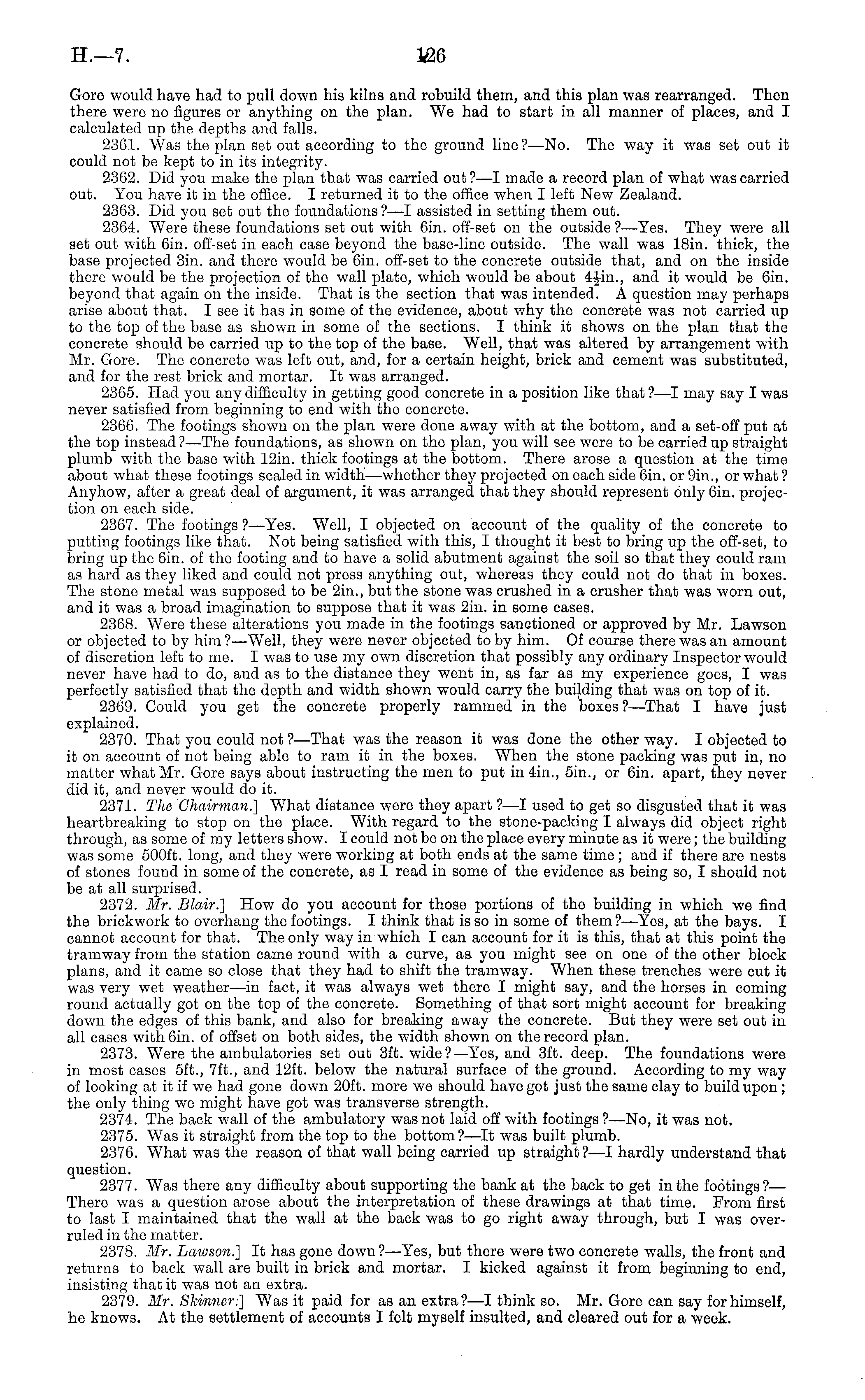 Gore would have had to pull down his kilns and rebuild them, and this plan was rearranged. Then there were no figures or anything on the plan. We had to start in all manner of places, and I calculated up the depths and falls. 2361. Was the plan set out according to the ground line?— No. The way it was set out it could not be kept to in its integrity. 2362. Did you make the plan that was carried out?—l made a record plan of what was carried out. You have it in the office. I returned it to the office when I left New Zealand. 2363. Did you set out the foundations? —I assisted in setting them out. 2364. Were these foundations set out with Gin. off-set on the outside ?—Yes. They were all set out with 6in. off-set in each case beyond the base-line outside. The wall was 18in. thick, the base projected 3in. and there would be 6in. off-set to the concrete outside that, and on the inside there would be the projection of the wall plate, which would be about 4Jin., and it would be Gin. beyond that again on the inside. That is the section that was intended. A question may perhaps arise about that. I see it has in some of the evidence, about why the concrete was not carried up to the top of the base as shown in some of the sections. I think it shows on the plan that the concrete should be carried up to the top of the base. Well, that was altered by arrangement with Mr. Gore. The concrete was left out, and, for a certain height, brick and cement was substituted, and for the rest brick and mortar. It was arranged. 2365. Had you any difficulty in getting good concrete in a position like that ?—I may say I was never satisfied from beginning to end with the concrete. 2366. The footings shown on the plan were done away with at the bottom, and a set-off put at the top instead?— The foundations, as shown on the plan, you will see were to be carried up straight plumb with the base with 12in. thick footings at the bottom. There arose a question at the time about what these footings scaled in width—whether they projected on each side Gin. or 9in., or what ? Anyhow, after a great deal of argument, it was arranged that they should represent only Gin. projection on each side. 2367. The footings ?—Yes. Well, I objected on account of the quality of the concrete to putting footings like that. Not being satisfied with this, I thought it best to bring up the off-set, to bring up the 6in. of the footing and to have a solid abutment against the soil so that they could ram as hard as they liked and could not press anything out, whereas they could not do that in boxes. The stone metal was supposed to be 2in., but the stone was crushed in a crusher that was worn out, and it was a broad imagination to suppose that it was 2in. in some cases. 2368. Were these alterations you made in the footings sanctioned or approved by Mr. Lawson or objected to by him ?—Well, they were never objected to by him. Of course there was an amount of discretion left to me. I was to use my own discretion that possibly any ordinary Inspector would never have had to do, and as to the distance they went in, as far as my experience goes, I was perfectly satisfied that the depth and width shown would carry the building that was on top of it. 2369. Could you get the concrete properly rammed in the boxes ?—That I have just explained. 2370. That you could not ?—That was the reason it was done the other way. I objected to it on account of not being able to ram it in the boxes. When the stone packing was put in, no matter what Mr. Gore says about instructing the men to put in 4in., sin., or 6in. apart, they never did it, and never would do it. 2371. The Chairman.'] What distance were they apart ?—I used to get so disgusted that it was heartbreaking to stop on the place. With regard to the stone-packing I always did object right through, as some of my letters show. I could not be on the place every minute as it were; the building was some 500 ft. long, and they were working at both ends at the same time; and if there are nests of stones found in some of the concrete, as I read in some of the evidence as being so, I should not be at all surprised. 2372. Mr. Blair.] How do you account for those portions of the building in which we find the brickwork to overhang the footings. I think that is so in some of them?— Yes, at the bays. I cannot account for that. The only way in which I can account for it is this, that at this point the tramway from the station came round with a curve, as you might see on one of the other block plans, and it came so close that they had to shift the tramway. When these trenches were cut it was very wet weather —in fact, it was always wet there I might say, and the horses in coming round actually got on the top of the concrete. Something of that sort might account for breaking down the edges of this bank, and also for breaking away the concrete. But they were set out in all cases with6in. of offset on both sides, the width shown on the record plan. 2373. Were the ambulatories set out 3ft. wide? —Yes, and 3ft. deep. The foundations were in most cases sft., 7ft., and 12ft. below the natural surface of the ground. According to my way of looking at it if we had gone down 20ft. more we should have got just the same clay to build upon; the only thing we might have got was transverse strength. 2374. The back wall of the ambulatory was not laid off with footings ?—No, it was not. 2375. Was it straight from the top to the bottom?—lt was built plumb. 2376. What was the reason of that wall being carried up straight?—l hardly understand that question. 2377. Was there any difficulty about supporting the bank at the back to get in the footings?— There was a question arose about the interpretation of these drawings at that time. From first to last I maintained that the wall at the back was to go right away through, but I was overruled in the matter. 2378. Mr. Lawson.] It has gone down?— Yes, but there were two conc