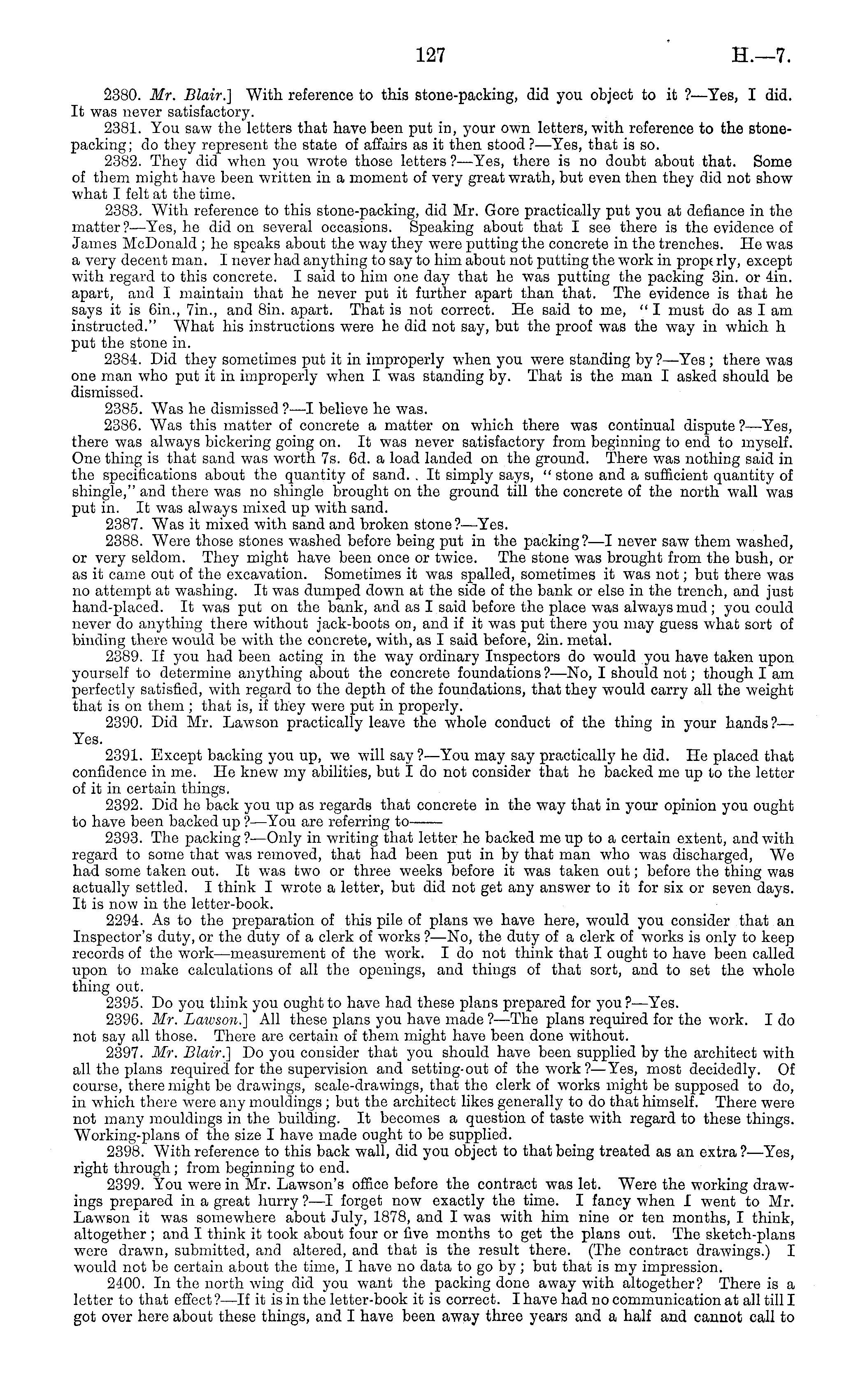 2380. Mr. Blair.] With reference to this stone-packing, did you object to it ?—Yes, I did. It was never satisfactory. 2381. You saw the letters that have been put in, your own letters, with reference to the stonepacking; do they represent the state of affairs as it then stood?— Yes, that is so. 2382. They did when you wrote those letters ?—Yes, there is no doubt about that. Some of them might have been written in a moment of very great wrath, but even then they did not show what I felt at the time. 2383. With reference to this stone-packing, did Mr. Gore practically put you at defiance in the matter? —Yes, he did on several occasions. Speaking about that I see there is the evidence of James McDonald ;he speaks about the way they were putting the concrete in the trenches. He was a very decent man. I never had anything to say to him about not putting the work in propt rly, except with regard to this concrete. I said to him one day that he was putting the packing 3in. or 4in. apart, and I maintain that he never put it further apart than that. The evidence is that he says it is 6in., 7in., and Bin. apart. That is not correct. He said to me, " I must do as lam instructed." What his instructions were he did not say, but the proof was the way in which h put the stone in. 2384. Did they sometimes put it in improperly when you were standing by?— Yes ; there was one man who put it in improperly when I was standing by. That is the man I asked should be dismissed. 2385. Was he dismissed ? —I believe he was. 2386. Was this matter of concrete a matter on which there was continual dispute ?—Yes, there was always bickering going on. It was never satisfactory from beginning to end to myself. One thing is that sand was worth 7s. 6d. a load landed on the ground. There was nothing said in the specifications about the quantity of sand. It simply says, " stone and a sufficient quantity of shingle," and there was no shingle brought on the ground till the concrete of the north wall was put in. It was always mixed up with sand. 2387. Was it mixed with sand and broken stone? —Yes. 2388. Were those stones washed before being put in the packing?—l never saw them washed, or very seldom. They might have been once or twice. The stone was brought from the bush, or as it came out of the excavation. Sometimes it was spalled, sometimes it was not; but there was no attempt at washing. It was dumped down at the side of the bank or else in the trench, and just hand-placed. It was put on the bank, and as I said before the place was always mud; you could never do anything there without jack-boots on, and if it was put there you may guess what sort of binding there would be with the concrete, with, as I said before, 2in. metal. 2389. If you had been acting in the way ordinary Inspectors do would you have taken upon yourself to determine anything about the concrete foundations ? —No, I should not; though lam perfectly satisfied, with regard to the depth of the foundations, that they would carry all the weight that is on them ; that is, if they were put in properly. 2390. Did Mr. Lawson practically leave the whole conduct of the thing in your hands?—■ Yes. 2391. Except backing you up, we will say ?—You may say practically ho did. Ho placed that confidence in me. He knew my abilities, but Ido not consider that he backed me up to the letter of it in certain things. 2392. Did he back you up as regards that concrete in the way that in your opinion you ought to have been backed up ?—You are referring to 2393. The packing ? —Only in writing that letter he backed me up to a certain extent, and with regard to some that was removed, that had been put in by that man who was discharged, We had some taken out. It was two or three weeks before it was taken out; before the thing was actually settled. I think I wrote a letter, but did not get any answer to it for six or seven days. It is now in the letter-book. 2294. As to the preparation of this pile of plans we have here, would you consider that an Inspector's duty, or the duty of a clerk of works ?—No, the duty of a clerk of works is only to keep records of the work—measurement of the work. I do not think that I ought to have been called upon to make calculations of all the openings, and things of that sort, and to set the whole thing out. 2395. Do you think you ought to have had these plans prepared for you ? —Yes. 2396. Mr. Lawson.] All these plans you have made ?—The plans required for the work. Ido not say all those. There are certain of them might have been done without. 2397. Mr. Blair.] Do you consider that you should have been supplied by the architect with all the plans required for the supervision and setting-out of the work?— Yes, most decidedly. Of course, there might be drawings, scale-drawings, that the clerk of works might be supposed to do, in which there were any mouldings ; but the architect likes generally to do that himself. There were not many mouldings in the building. It becomes a question of taste with regard to these things. Working-plans of the size I have made ought to be supplied. 2398. With reference to this back wall, did you object to that being treated as an extra ? —Yes, right through ; from beginning to end. 2399. You were in Mr. Lawson's office before the contract was let. Were the working drawings prepared in a great hurry ? —I forgot now exactly the time. I fancy when I went to Mr. Lawson it was somewhere about July, 1878, and I was with him nine or ten months, I think, altogether; and I think it took about four or five months to get the plans out. The sketch-plans were drawn, submitted, and altered, and that is the result there. (The contract drawings.) I would not be certain about the time, I have no data to go by ; but that is my impression. 2400. In the north wing did you want the packing done away with altogether? There is a letter to that effect ?—lf it is in the letter-book it is correct. I have had no 
