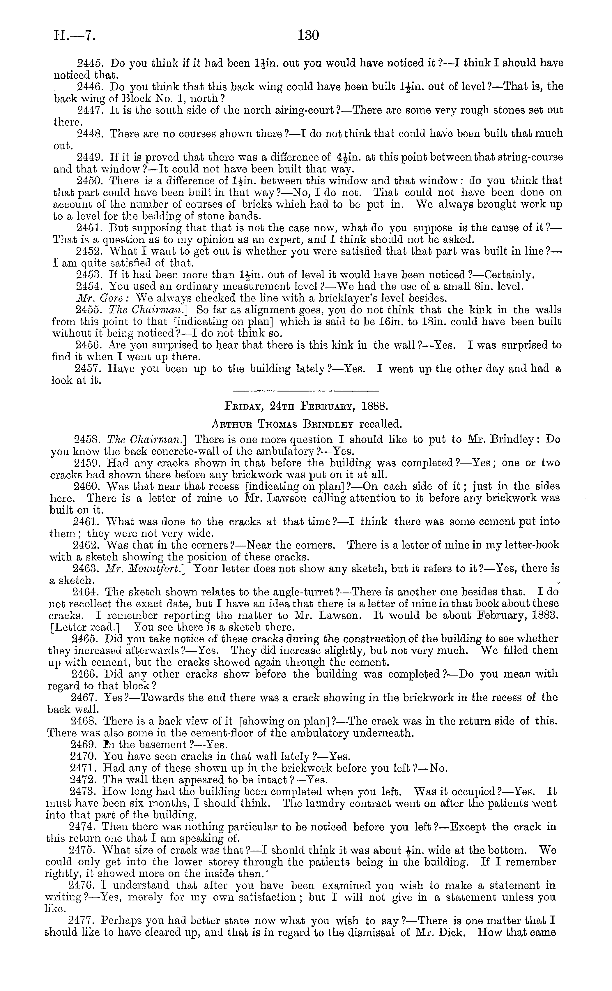 Fbiday, 24th Febeuaey, 1888. Aethue Thomas Beindley recalled. 2458. The Chairman.'] There is one more question I should like to put to Mr. Brindley : Do you know the back concrete-wall of the ambulatory?— Yes. 2459. Had any cracks shown in that before the building was completed ?—Yes; one or two cracks had shown there before any brickwork was put on it at all. 2460. Was that near that recess [indicating on plan] ? —On each side of it; just in the sides here. There is a letter of mine to Mr. Lawson calling attention to it before any brickwork was built on it. 2461. What was done to the cracks at that time? —I think there was some cement put into them; they were not very wide. 2462. Was that in the corners ? —Near the corners. There is a letter of mine in my letter-book with a sketch showing the position of these cracks. 2463. Mr. Mountfort.] Your letter does not show any sketch, but it refers to it?— Yes, there is a sketch. 2464. The sketch shown relates to the angle-turret ? —There is another one besides that. Ido not recollect the exact date, but I have an idea that there is a letter of mine in that book about these cracks. I remember reporting the matter to Mr. Lawson. It would bo about February, 1883. [Letter read.] You see there is a sketch there. 2465. Did you take notice of these cracks during the construction of the building to see whether they increased afterwards? —Yes. They did increase slightly, but not very much. We filled them up with cement, but the cracks showed again through the cement. 2466. Did any other cracks show before the building was completed ?—Do you mean with regard to that block ? 2467. Yes?— Towards the end there was a crack showing in the brickwork in the recess of the back wall. 2468. There is a back view of it [showing on plan] ?—The crack was in the return side of this. There was also some in the cement-floor of the ambulatory underneath. 2469. In the basement ?—Yes. 2470. You have seen cracks in that wall lately ?—Yes. 2471. Had any of those shown up in the brickwork before you left ? —No. 2472. The wall then appeared to be intact ? —Yes. 2473. How long had the building been completed when you left. Was it occupied?— Yes. It must have been six months, I should think. The laundry contract went on after the patients went into that part of the building. 2474. Then there was nothing particular to be noticed before you left ?—Except the crack in this return one that I am speaking of. 2475. What size of crack was that ? —I should think it was about -J-in. wide at the bottom. We could only get into the lower storey through the patients being in the building. If I remember rightly, it showed more on the inside then.' 2476. I understand that after you have been examined you wish to make a statement in writing ?—Yes, merely for my own satisfaction ; but I will not give in a statement unless you like. 2477. Perhaps you had better state now what you wish to say?— There is one matter that I should like to have cleared up, and that is in regard to the dismissal of Mr. Dick. How that came