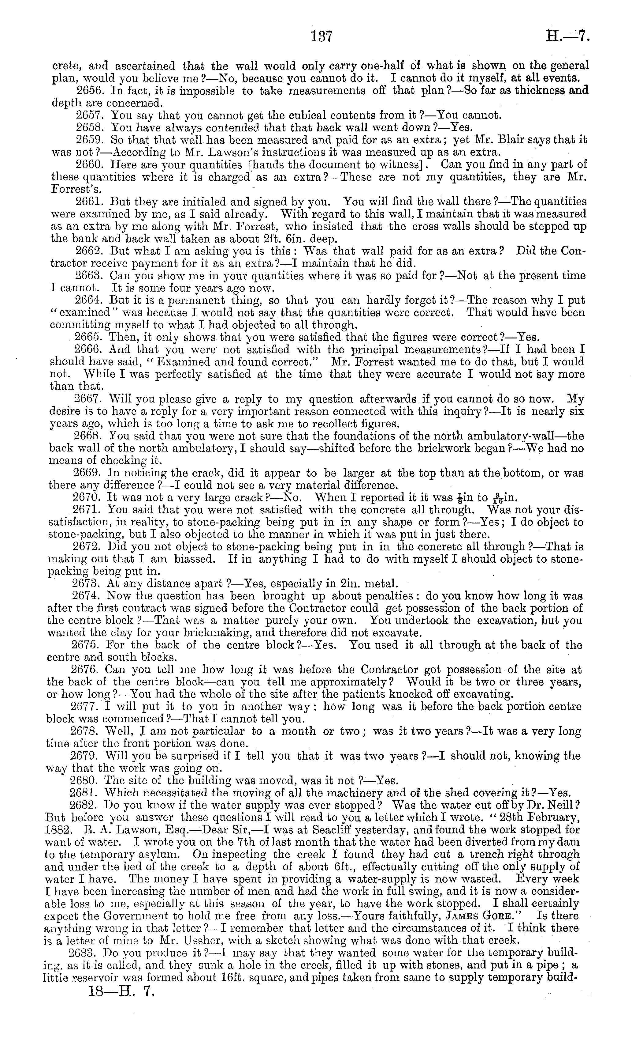 Crete, and ascertained that the wall would only carry one-half of what is shown on the general plan, would you believe me ?—No, because you cannot do it. I cannot do it myself, at all events. 2656. In fact, it is impossible; to take measurements off that plan?—So far as thickness and depth are concerned. 2657. You say that you cannot get the cubical contents from it ? —You cannot. 2658. You have always contended that that back wall went down ? —Yes. 2659. So that that wall has been measured and paid for as an extra; yet Mr. Blair says that it was not ? —According to Mr. Lawson's instructions it was measured up as an extra. 2660. Here are your quantities [hands the document to witness]. Can you find in any part of these quantities where it is charged as an extra ?—These are not my quantities, they are Mr. Forrest's. 2661. But they are initialed and signed by you. You will find the wall there ?—The quantities were examined by me, as I said already. With regard to this wall, I maintain that it was measured as an extra by me along with Mr. Forrest, who insisted that the cross walls should be stepped up the bank and back wall taken as about 2ft. 6in. deep. 2662. But what lam asking you is this : Was that wall paid for as an extra? Did the Contractor receive payment for it as an extra ?—I maintain that he did. 2663. Can you show me in your quantities where it was so paid for ?■ —Not at the present time I cannot. It is some four years ago now. 2664. But it is a permanent thing, so that you can hardly forget it?— The reason why I put "examined" was because I would not say that the quantities were correct. That would have been committing myself to what I had objected to all through. 2665. Then, it only shows that you were satisfied that the figures were correct?— Yes. 2666. And that you were not satisfied with the principal measurements ? —lf I had been I should have said, " Examined and found correct." Mr. Forrest wanted me to do that, but I would not. While I was perfectly satisfied at the time that they were accurate I would not say more than that. 2667. Will you please give a reply to my question afterwards if you cannot do so now. My desire is to have a reply for a very important reason connected with this inquiry ?—lt is nearly six years ago, which is too long a time to ask me to recollect figures. 2668. You said that you were not sure that the foundations of the north ambulatory-wall—the back wall of the north ambulatory, I should say—shifted before the brickwork began ?—We had no means of checking it. 2669. In noticing the crack, did it appear to be larger at the top than at the bottom, or was there any difference ?—I could not see a very material difference. 2670. It was not a very large crack ? —No. When I reported it it was -Jin to 2671. You said that you were not satisfied with the concrete all through. Was not your dissatisfaction, in reality, to stone-packing being put in in any shape or form ?—Yes; I do object to stone-packing, but I also objected to the manner in which it was put in just there. 2672. Did you not object to stone-packing being put in in the concrete all through ? —That is making out that I am biassed. If in anything I had to do with myself I should object to stonepacking being put in. 2673. At any distance apart ?—Yes, especially in 2in. metal. 2674. Now the question has been brought up about penalties : do you know how long it was after the first contract was signed before the Contractor could get possession of the back portion of the centre block ? —That was a matter purely your own. You undertook the excavation, but you wanted the clay for your brickmaking, and therefore did not excavate. 2675. For the back of the centre block?— Yes. You used it all through at the back of the centre and south blocks. 2676. Can you tell me how long it was before the Contractor got possession of the site at the back of the centre block—can you tell me approximately? Would it be two or throe years, or how long ?—You had the whole of the site after the patients knocked off excavating. 2677. I will put it to you in another way : how long was it before the back portion centre block was commenced ? —That I cannot tell you. 2678. Well, I am not particular to a month or two ; was it two years ? —lt was a very long time after the front portion was done. 2679. Will you be surprised if I tell you that it was two years ?—I should not, knowing the way that the work was going on. 2680. The site of the building was moved, was it not ?—Yes. 2681. Which necessitated the moving of all the machinery and of the shed covering it?— Yes. 2682. Do you know if the water supply was ever stopped? Was the water cut off by Dr. Neill? But before you answer these questions I will read to you a letter which I wrote. " 28th February, 1882. E. A. Lawson, Esq.—Dear Sir, —I was at Seacliff yesterday, and found the work stopped for want of water. I wrote you on the 7th of last month that the water had been diverted from my dam to the temporary asylum. On inspecting the creek I found they had cut a trench right through and under the bed of the creek to a depth of about 6ft., effectually cutting off the only supply of water I have. The money I have spent in providing a water-supply is now wasted. Every week I have been increasing the number of men and had the work in full swing, and it is now a considerable loss to me, especially at this season of the year, to have the work stopped. I shall certainly expect the Government to hold me free from any loss. —Yours faithfully, James Gore." Is there anything wrong in that letter ?—I remember that letter and the circumstances of it. I think there is a letter of mine to Mr. Ussher, with a sketch showing what was done with that creek. 2683. Do you produce it ?—I may say that they wanted some water for the temporary building, as it is called, and they sunk a hole in the creek, filled it up with stones, and pu
