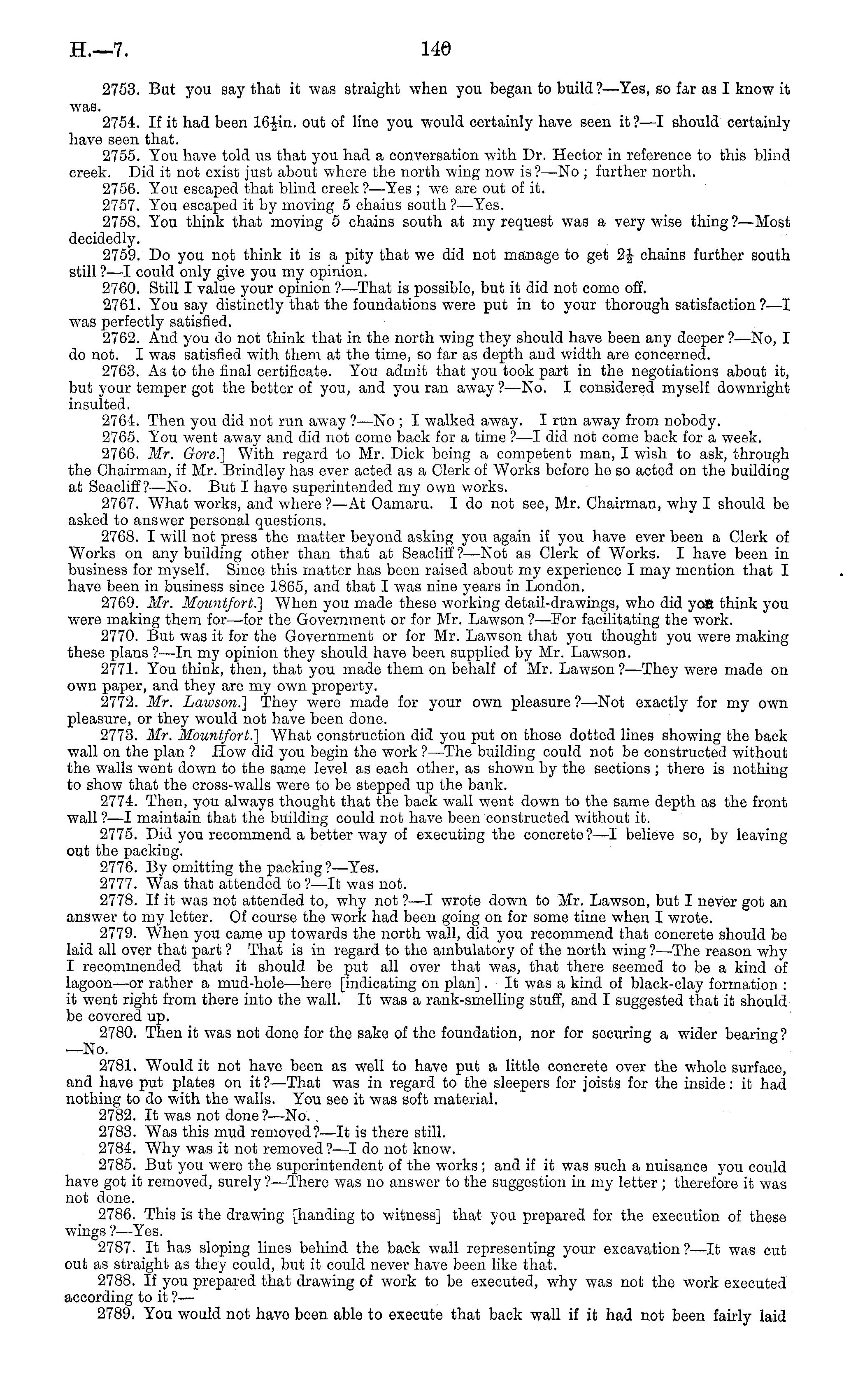 2753. But you say that it was straight when you began to build?— Yes, so far as I know it was. 2754. If it had been 16iin. out of line you would certainly have seen it ? —I should certainly have seen that. 2755. You have told us that you had a conversation with Dr. Hector in reference to this blind creek. Did it not exist just about where the north wing now is ?—No ; further north. 2756. You escaped that blind creek?— Yes ; wo arc out of it. 2757. You escaped it by moving 5 chains south?— Yes. 2758. You think that moving 5 chains south at my request was a very wise thing ? —Most decidedly. 2759. Do you not think it is a pity that we did not manage to got 2-J chains further south still ?—I could only give you my opinion. 2760. Still I value your opinion ?—That is possible, but it did not come off. 2761. You say distinctly that the foundations were put in to your thorough satisfaction ?—I was perfectly satisfied. 2762. And you do not think that in the north wing they should have been any deeper ?—No, I do not. I was satisfied with them at the time, so far as depth and width are concerned. 2763. As to the final certificate. You admit that you took part in the negotiations about it, but your temper got the better of you, and you ran away ?—No. I considered myself downright insulted. 2764. Then you did not run away ?—No ; I walked away. I run away from nobody. 2765. You went away and did not come back for a time ?—I did not come back for a week. 2766. Mr. Gore.] With regard to Mr. Dick being a competent man, I wish to ask, through the Chairman, if Mr. Brindley has ever acted as a Clerk of Works before he so acted on the building at Seacliff ?—No. But I have superintended my own works. 2767. What works, and where ?—At Oamaru. I do not see, Mr. Chairman, why I should be asked to answer personal questions. 2768. I will not press the matter beyond asking you again if you have ever been a Clerk of Works on any building other than that at Seacliff ?—Not as Clerk of Works. I have been in business for myself. Since this matter has been raised about my experience I may mention that I have been in business since 1865, and that I was nine years in London. 2769. Mr. Mountfort.] When you made these working detail-drawings, who did you think you were making them for—for the Government or for Mr. Lawson ?—For facilitating the work. 2770. But was it for the Government or for Mr. Lawson that you thought you were making these plans ?—ln my opinion they should have been supplied by Mr. Lawson. 2771. You think, then, that you made them on behalf of Mr. Lawson ?—They were made on own paper, and they are my own property. 2772. Mr. Lawson.] They were made for your own pleasure ?—Not exactly for my own pleasure, or they would not have been done. 2773. Mr. Mountfort.] What construction did you put on those dotted lines showing the back wall on the plan ? How did you begin the work ?—The building could not be constructed without the walls went down to the same level as each other, as shown by the sections; there is nothing to show that the cross-walls were to be stepped up the bank. 2774. Then, you always thought that the back wall went down to the same depth as the front wall ? —I maintain that the building could not have been constructed without it. 2775. Did you recommend a better way of executing the concrete ?—I believe so, by leaving out the packing. 2776. By omitting the packing?— Yes. 2777. Was that attended to ?—lt was not. 2778. If it was not attended to, why not ?—I wrote down to Mr. Lawson, but I never got an answer to my letter. Of course the work had been going on for some time when I wrote. 2779. When you came up towards the north wall, did you recommend that concrete should be laid all over that part ? That is in regard to the ambulatory of the north wing ?—The reason why I recommended that it should be put all over that was, that there seemed to be a kind of lagoon —or rather a mud-hole—here [indicating on plan]. It was a kind of black-clay formation : it went right from there into the wall. It was a rank-smelling stuff, and I suggested that it should be covered up. 2780. Then it was not done for the sake of the foundation, nor for securing a wider bearing? —No. 2781. Would it not have been as well to have put a little concrete over the whole surface, and have put plates on it?— That was in regard to the sleepers for joists for the inside: it had nothing to do with the walls. You see it was soft material. 2782. It was not done ?—No. . 2783. Was this mud removed?—lt is there still. 2784. Why was it not removed?—l do not know. 2785. But you were the superintendent of the works; and if it was such a nuisance you could have got it removed, surely ? —There was no answer to the suggestion in my letter ; therefore it was not done. 2786. This is the drawing [handing to witness] that you prepared for the execution of these wings?— Yes. 2787. It has sloping lines behind the back wall representing your excavation ?—lt was cut out as straight as they could, but it could never have been like that. 2788. If you prepared that drawing of work to be executed, why was not the work executed according to it ? — 2789. You would not have been able to execute that back wall if it had not been fairly laid