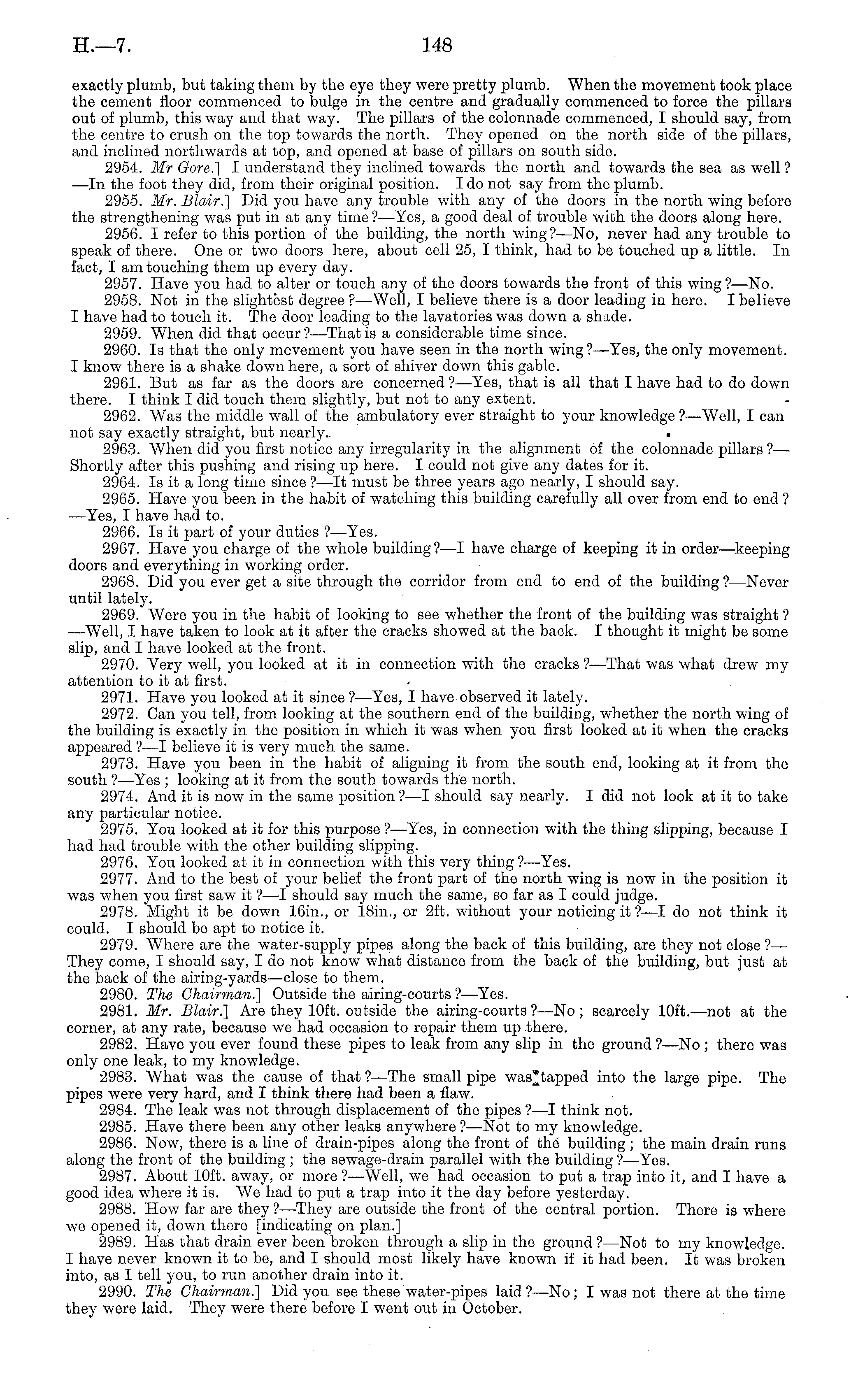 exactly plumb, but taking them by the eye they were pretty plumb. When the movement took place the cement floor commenced to bulge in the centre and gradually commenced to force the pillars out of plumb, this way and that way. The pillars of the colonnade commenced, I should say, from the centre to crush on the top towards the north. They opened on the north side of the pillars, and inclined northwards at top, and opened at base of pillars on south side. 2954. Mr Gore.} I understand they inclined towards the north and towards the sea as well ? —In the foot they did, from their original position. Ido not say from the plumb. 2955. Mr. Blair.] Did you have any trouble with any of the doors in the north wing before the strengthening was put in at any time ? —Yes, a good deal of trouble with the doors along here. 2956. I refer to this portion of the building, the north wing?—No, never had any trouble to speak of there. One or two doors here, about cell 25, I think, had to be touched up a little. In fact, I am touching them up every day. 2957. Have you had to alter or touch any of the doors towards the front of this wing ?—No. 2958. Not in the slightest degree ? —Well, I believe there is a door leading in here. I believe I have had to touch it. The door leading to the lavatories was down a shade. 2959. When did that occur ?—That is a considerable time since. 2960. Is that the only movement you have seen in the north wing?— Yes, the only movement. I know there is a shake down here, a sort of shiver down this gable. 2961. But as far as the doors are concerned ?—Yes, that is all that I have had to do down there. I think I did touch them slightly, but not to any extent. 2962. Was the middle wall of the ambulatory ever straight to your knowledge ?—Well, I can not say exactly straight, but nearly. 2963. When did you first notice any irregularity in the alignment of the colonnade pillars ?— Shortly after this pushing and rising up here. I could not give any dates for it. 2964. Is it a long time since ? —lt must be three years ago nearly, I should say. 2965. Have you been in the habit of watching this building carefully all over from end to end ? —Yes, I have had. to. 2966. Is it part of your duties ? —Yes. 2967. Have you charge of the whole building?—l have charge of keeping it in order—keeping doors and everything in working order. 2968. Did you ever get a site through the corridor from end to end of the building ?—Never until lately. 2969. Were you in the habit of looking to see whether the front of the building was straight ? —Well, I have taken to look at it after the cracks showed at the back. I thought it might be some slip, and I have looked at the front. 2970. Very well, you looked at it in connection with the cracks ? —That was what drew my attention to it at first. 2971. Have you looked at it since ?—Yes, I have observed it lately. 2972. Can you tell, from looking at the southern end of the building, whether the north wing of the building is exactly in the position in which it was when you first looked at it when the cracks appeared ? —I believe it is very much the same. 2973. Have you been in the habit of aligning it from the south end, looking at it from the south ?—Yes ; looking at it from the south towards the north. 2974. And it is now in the same position ?—I should say nearly. I did not look at it to take any particular notice. 2975. You looked at it for this purpose ? —Yes, in connection with the thing slipping, because I had had trouble with the other building slipping. 2976. You looked at it in connection with this very thing ? —Yes. 2977. And to the best of your belief the front part of the north wing is now in the position it was when you first saw it ?—I should say much the same, so far as I could judge. 2978. Might it be down 16in., or 18in., or 2ft. without your noticing it ?—I do not think it could. I should be apt to notice it. 2979. Where are the water-supply pipes along the back of this building, are they not close ?— They come, I should say, I do not know T what distance from the back of the building, but just at the back of the airing-yards—close to them. 2980. The Chairman.] Outside the airing-courts ? —Yes. 2981. Mr. Blair.] Are they 10ft. outside the airing-courts?—No; scarcely 10ft. —not at the corner, at any rate, because we had occasion to repair them up there. 2982. Have you ever found these pipes to leak from any slip in the ground?—No ; there was only one leak, to my knowledge. 2983. What was the cause of that ? —The small pipe was[*tapped into the large pipe. The pipes were very hard, and I think there had been a flaw. 2984. The leak was not through displacement of the pipes ?—I think not. 2985. Have there been any other leaks anywhere ?—Not to my knowledge. 2986. Now, there is a line of drain-pipes along the front of the building ; the main drain runs along the front of the building ; the sewage-drain parallel with the building?— Yes. 2987. About 10ft. away, or more ? —Well, we had occasion to put a trap into it, and I have a good idea where it is. We had to put a trap into it the day before yesterday. 2988. How far are they ?—They are outside the front of the central portion. There is where we opened it, down there [indicating on plan.] 2989. Has that drain ever been broken through a slip in the ground ?—Not to my knowledge. I have never known it to be, and I should most likely have known if it had been. It was broken into, as I tell you, to run another drain into it. 2990. The Chairman.] Did you see these water-pipes laid ? —No; I was not there at the time they were laid. They were there before I went out in October.